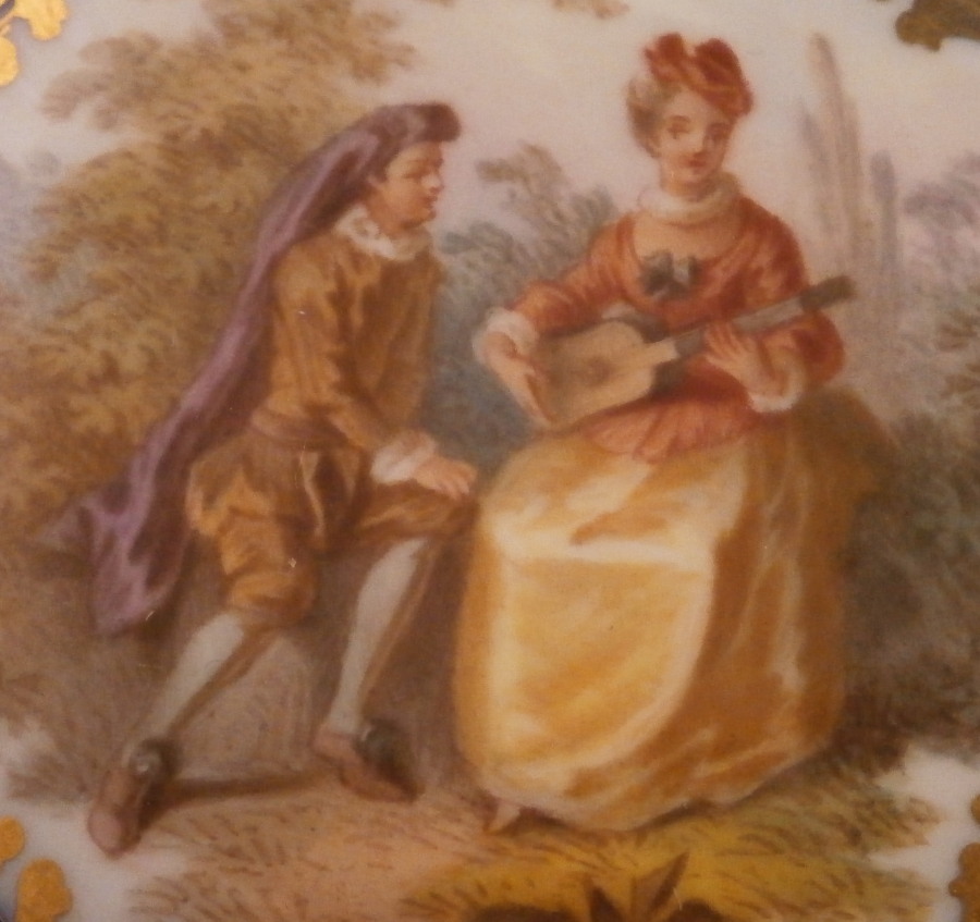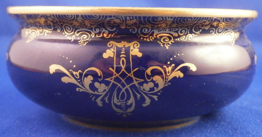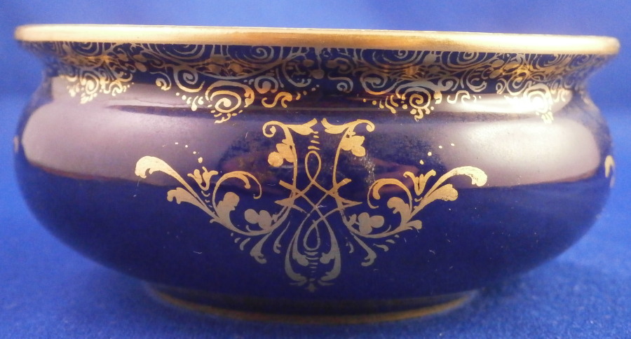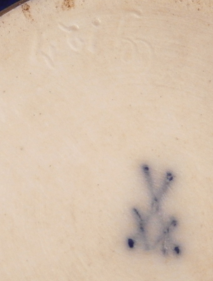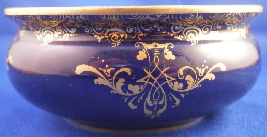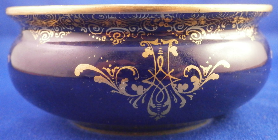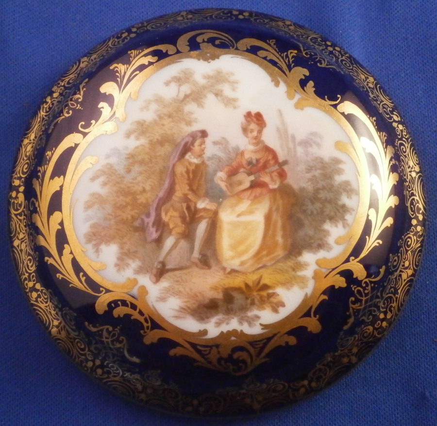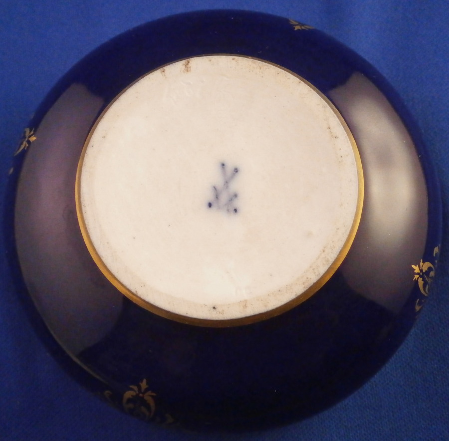 This is a superb little littled box made by Meissen in the later 19th century. It is hand painted with a superb Watteau style scene on the lid surrounded by their nice deep cobalt blue color and some fancy gold trim. The painting is of superb quality! The bottom part has the same deep cobalt blue ground color and fancy gilding over that. An amazing piece for sure! They have an unusual shape to them as well not the typical domed lid and simble bottom but with a bit of an indent to the sides and a touch larger as well. Gold design to the bottom inside. The lidded dish is in perfect condition. The bottom part is marked with the under glaze blue crossed swords mark (first quality) underneath as well as some incised numbers as shown. The box is 2.25 inches tall and 3.5 inches in diameter. Please email me for more information or other pictures.