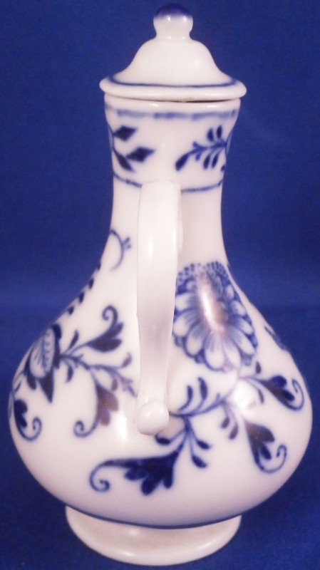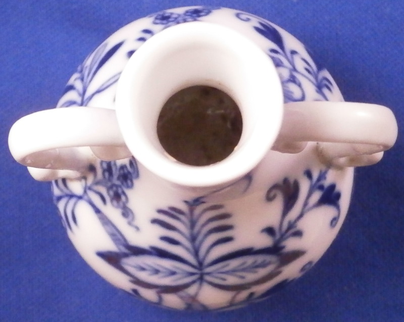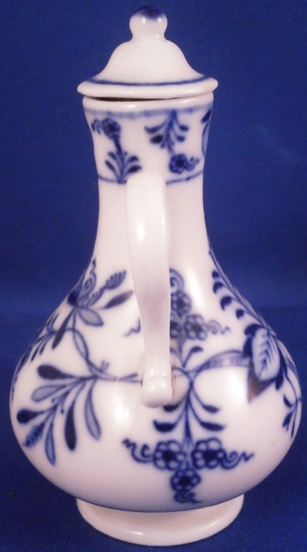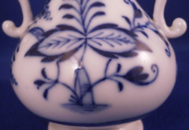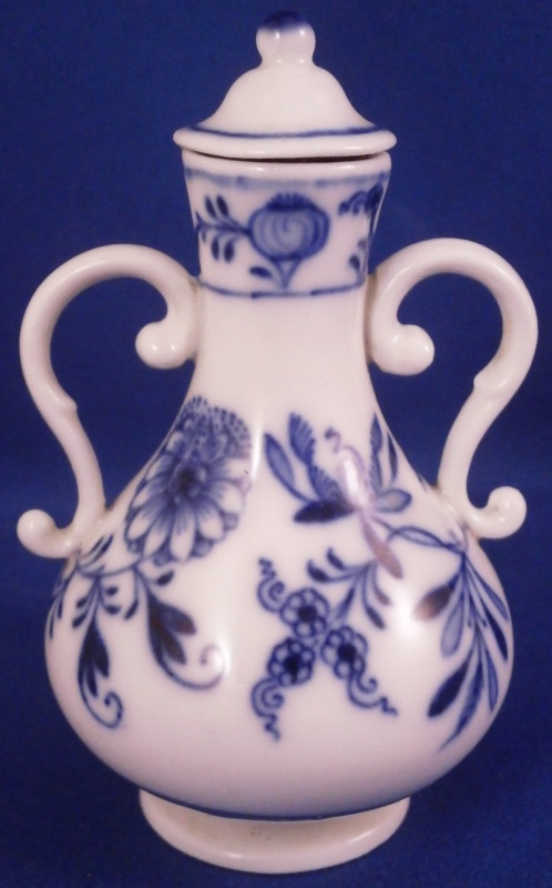 This is a really nice perfume bottle with its original lid made by Meissen in the 19th century. It is dcorated with their famous Blue Onion design in under glaze dark blue and has a nice handle to each side. The lid still has its original cork inside but that is partially missing. Still nice to have the original lid with at least most of the cork as that is often not the case. The piece is in superb condition otherwise. No issues with the porcelain and a nice early example before they put the crossed swords into the stalk part of the 'onion'. The perfume bottle with the lid in place is about is 3.125 inches tall and 1.875 inches in diameter. The handles stick out a tiny bit from that. It is arked underneath with the under glaze crossed swords mark on both the main body as well as a blue 11 (i think) and the usual incised marks one find on Meissen of this period as shown. First quality off course. Please email me for more information or other pictures.