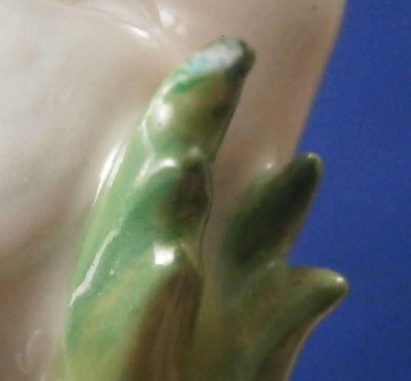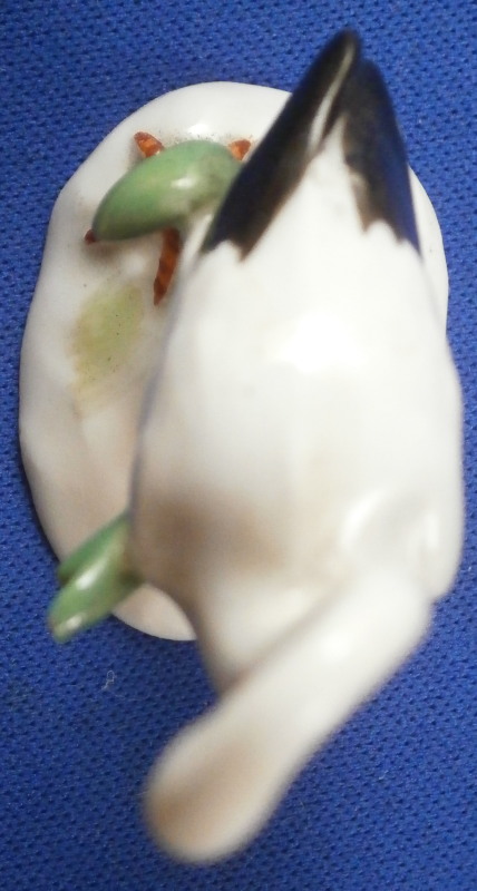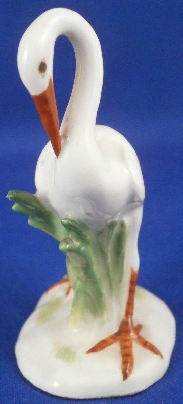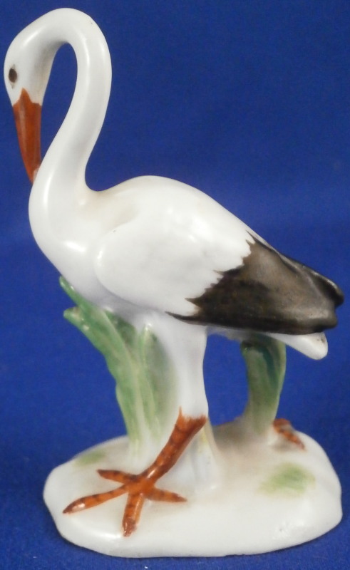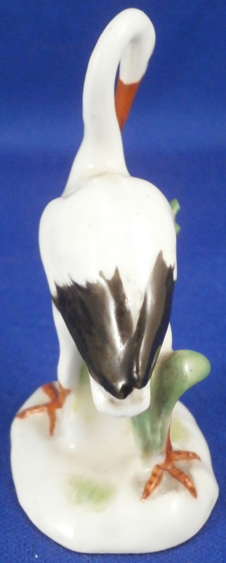 This is a cute miniature bird figurine made by Meissen in the late 19th century. It is of a stork that is nicely modeled standing on a base with some grasses painte on it and some tall grass under him. Hand painted with lots of detail! Quite the delicate and elegant little guy! The figurine is in good condition with a small chip to one of the tips of the tall grass as shown. It does not show when on display so he looks perfect. The figure is marked underneath with the under glaze blue crossed swords mark as well as the usual impressed numbers of the period and a red painter's mark 30. The piece is 2.375 inches tall, 1.125 inches wide and 1.5 inches deep. Please email me for more information or other pictures.