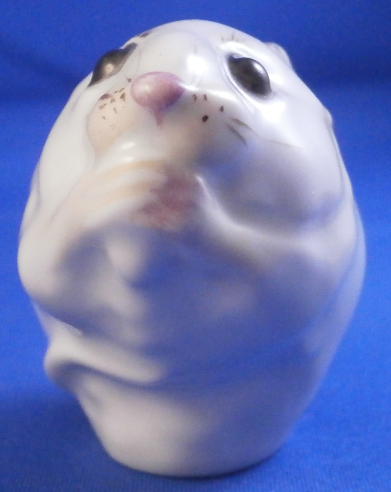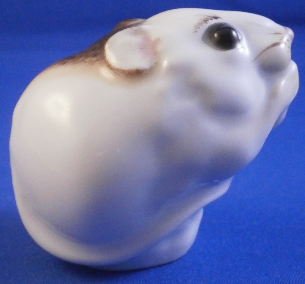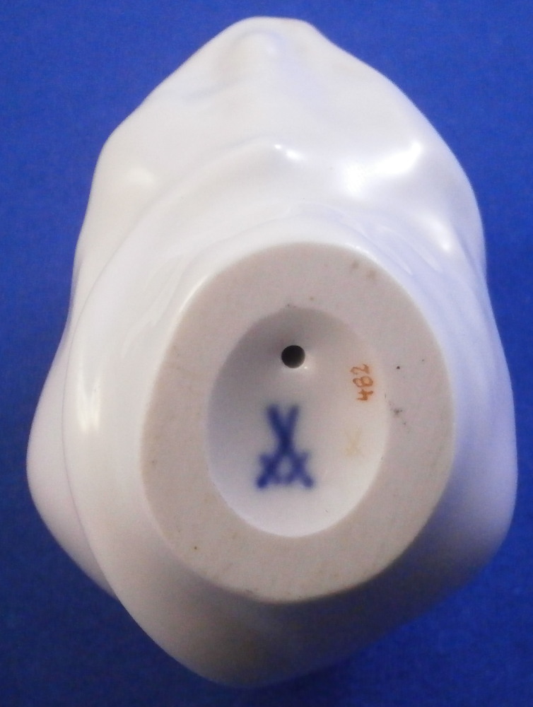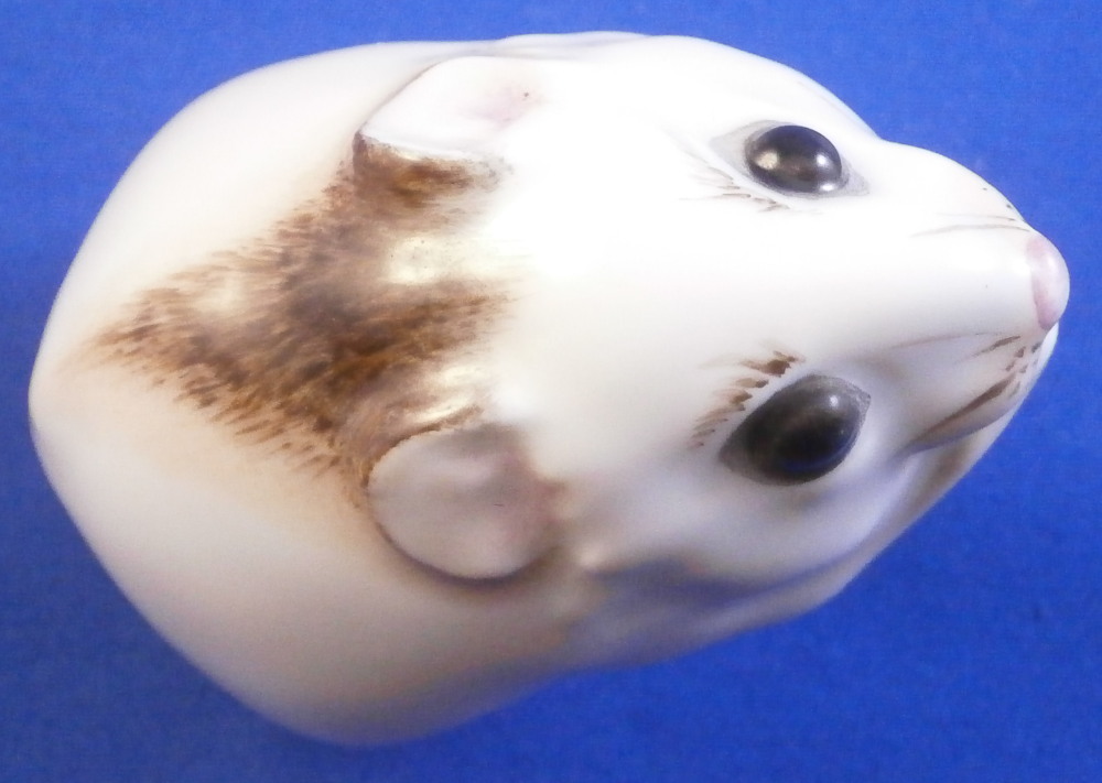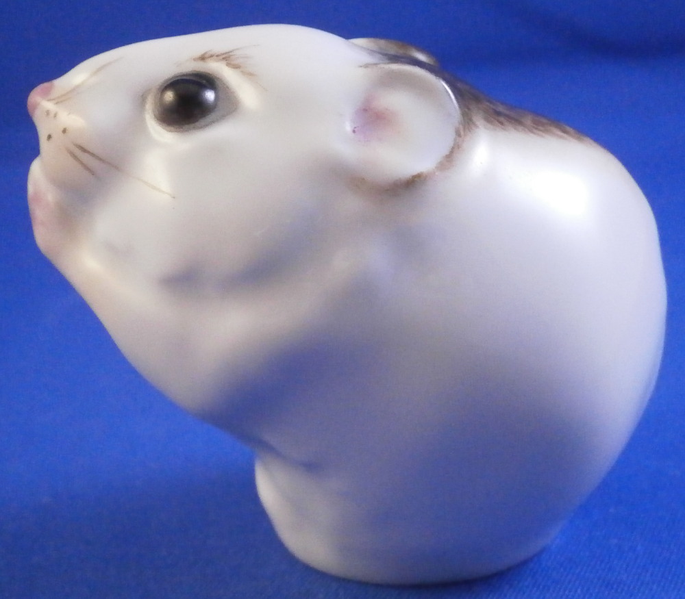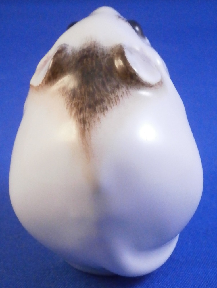 This is the most adorable figurine of a mouse made by Meissen in the 20th century. As cute as they come! Kind of reminds me of the look my daughers give me when they are begging big time for something :) The piece is simply modeled and hand painted superbly with thos big eyes. The figure is in perfect condition. It is 1.875 inches tall, just over 1.5 inches wide and 2.125 inches long. The piece is marked underneath with the under glaze blue crossed swords mark as well as the usual impressed numbers and a red painter's mark as shown. Please email me for more information or other pictures.