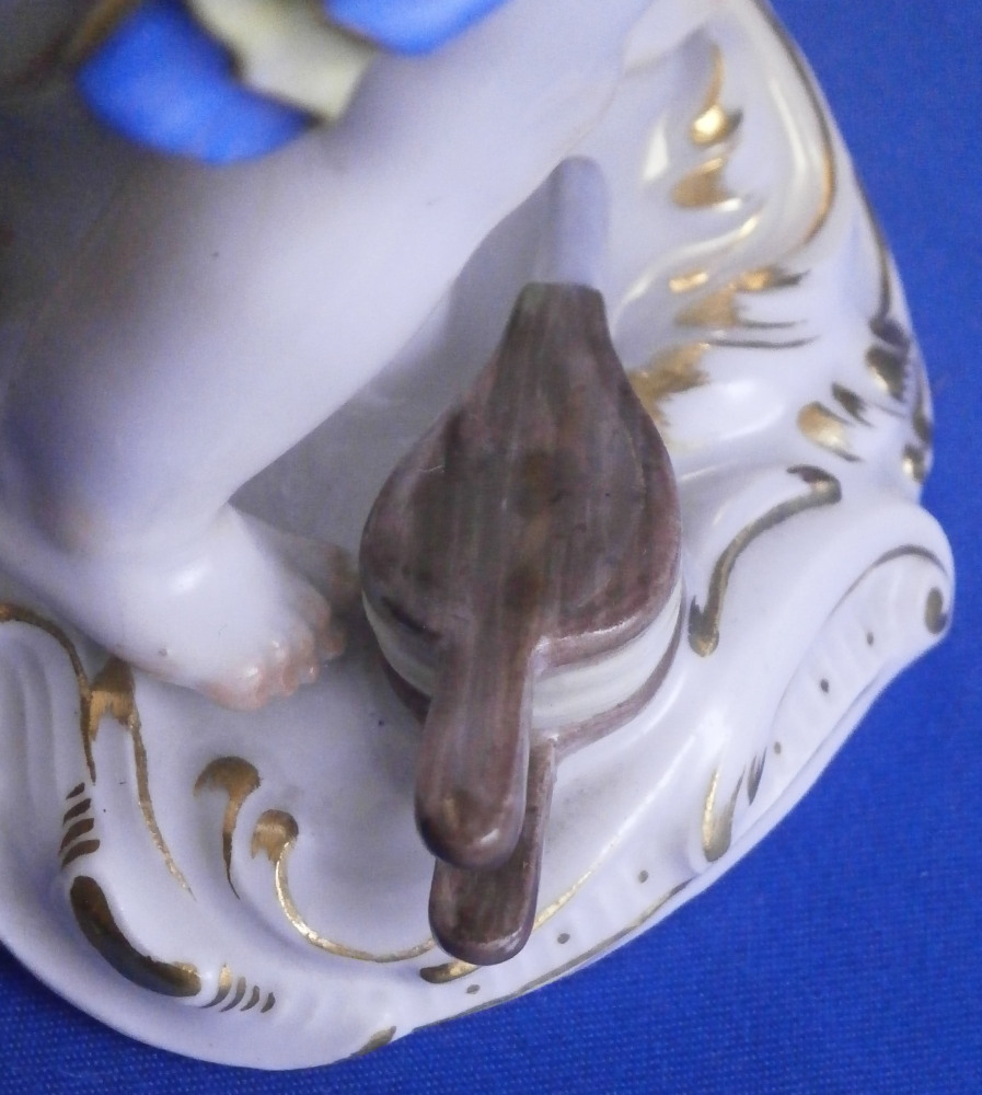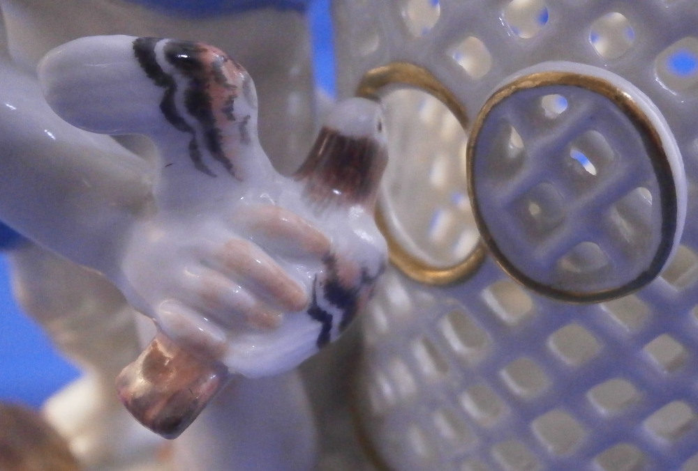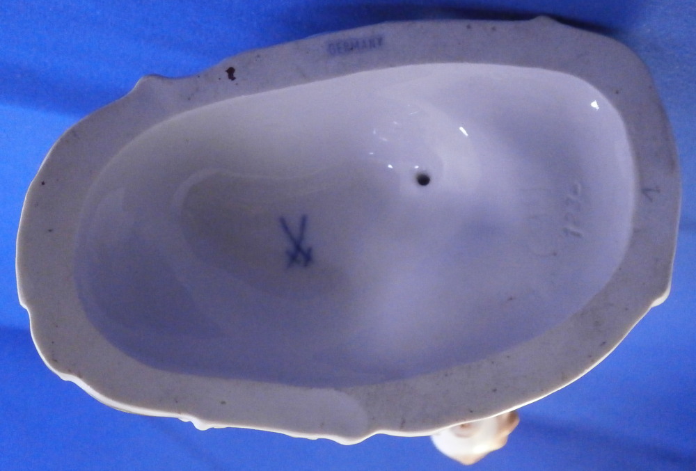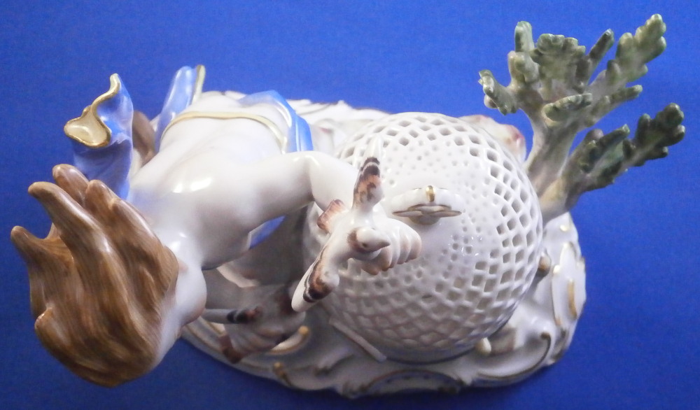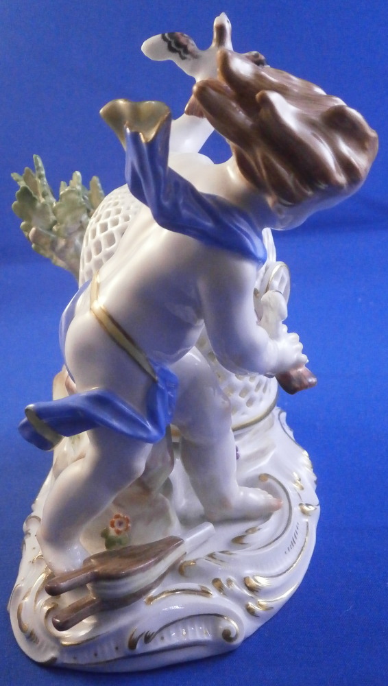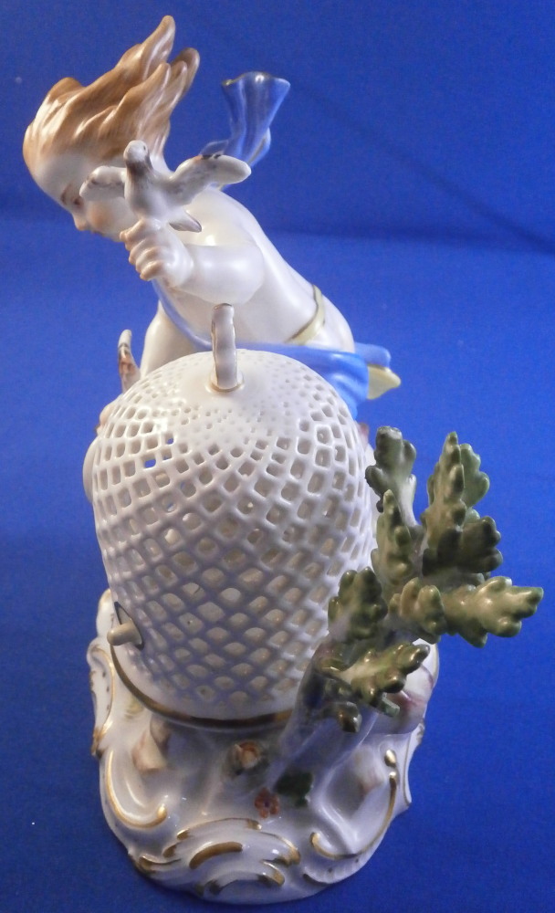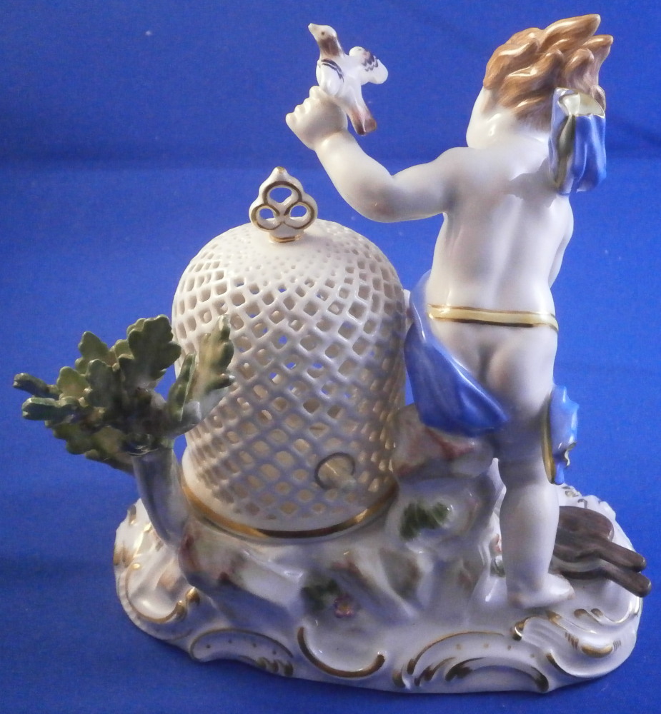 This is a really nice figurine emblematic of the element of air made by Meissen in the mid 20th century. Not a rare figurine by any means but what is very rare about this piece is that it is in perfect condition. I have never seen that before. There is always something worng with these due to all the things sticking out everywhere. The piece is of a putto holding a bird in hisupper hand while trying to put another bird into the superbly reticulated cage using his other hand. A yellow and blue cloth covering him up a bit. A bellow on the base and a young oak tree in the back. The base has lots of scrolls all around highlighted with gilding. This figure is one from the series of elements. I also have water and earth but there is one more out there - fire.The figure is very well modeled and hand painted. It looks stunning on its own or even ncier in the set. The figurine is 5 inches tall, 5 inches wide and 3 inches deep. It is marked with the crossed swords mark underneath the base (first choice) as well as the usual impressed / incised marks and Germany in blue on the edge. Please email me for more information or other pictures.