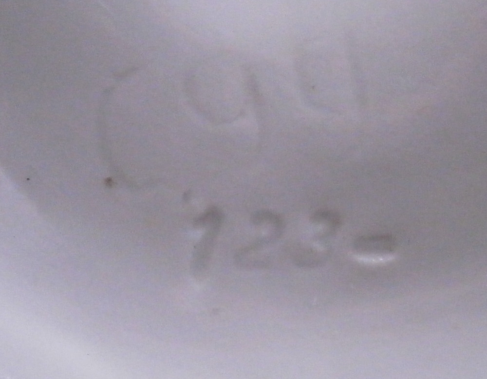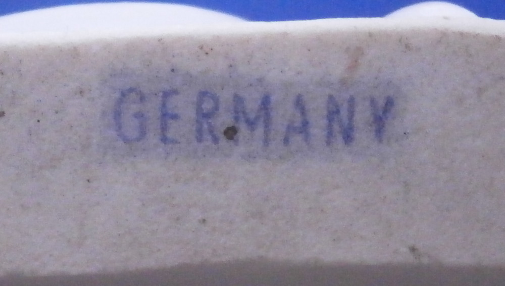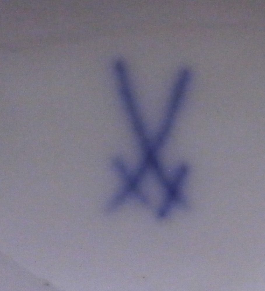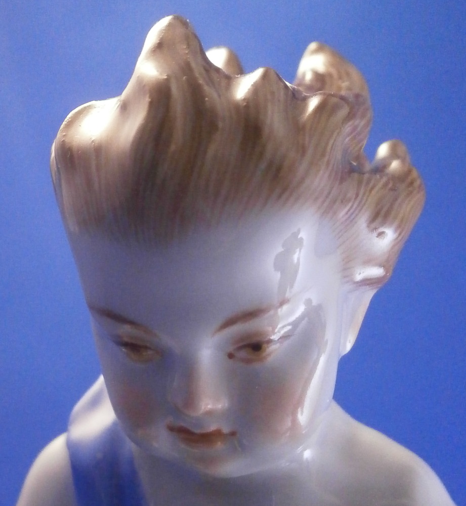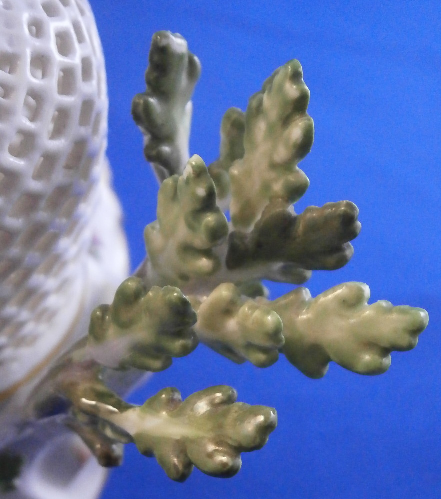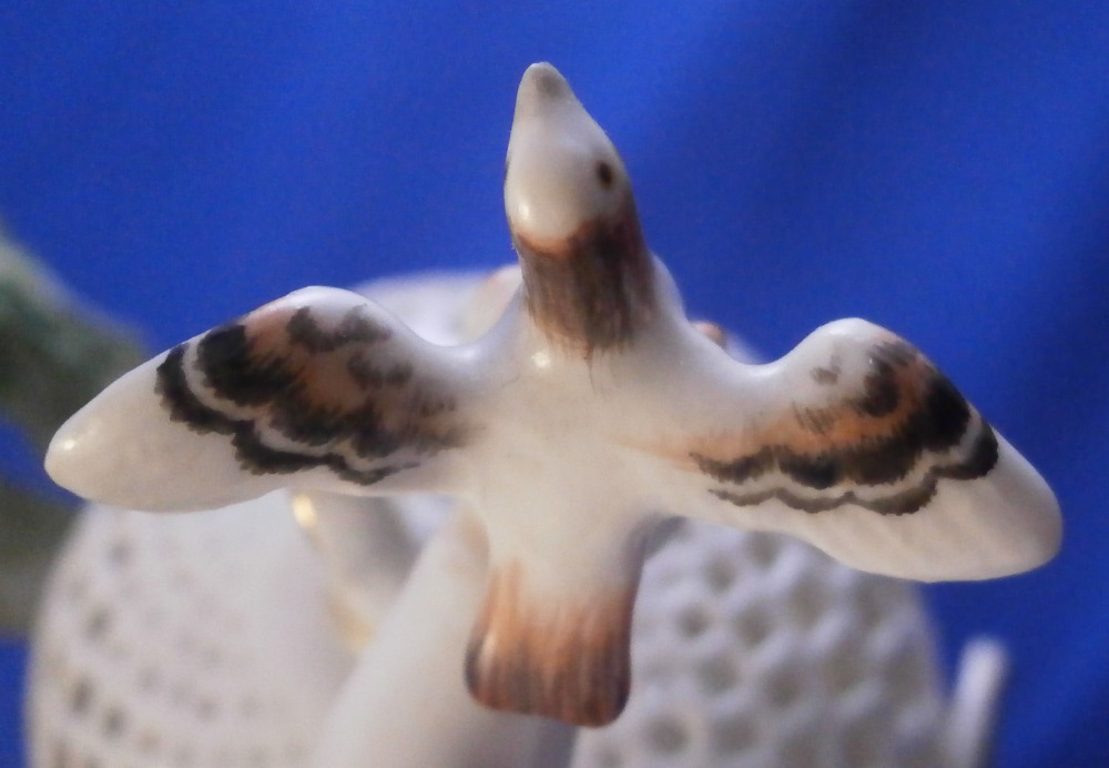 This is a really nice figurine emblematic of the element of air made by Meissen in the mid 20th century. Not a rare figurine by any means but what is very rare about this piece is that it is in perfect condition. I have never seen that before. There is always something worng with these due to all the things sticking out everywhere. The piece is of a putto holding a bird in hisupper hand while trying to put another bird into the superbly reticulated cage using his other hand. A yellow and blue cloth covering him up a bit. A bellow on the base and a young oak tree in the back. The base has lots of scrolls all around highlighted with gilding. This figure is one from the series of elements. I also have water and earth but there is one more out there - fire.The figure is very well modeled and hand painted. It looks stunning on its own or even ncier in the set. The figurine is 5 inches tall, 5 inches wide and 3 inches deep. It is marked with the crossed swords mark underneath the base (first choice) as well as the usual impressed / incised marks and Germany in blue on the edge. Please email me for more information or other pictures.