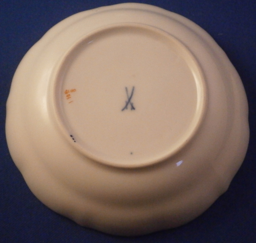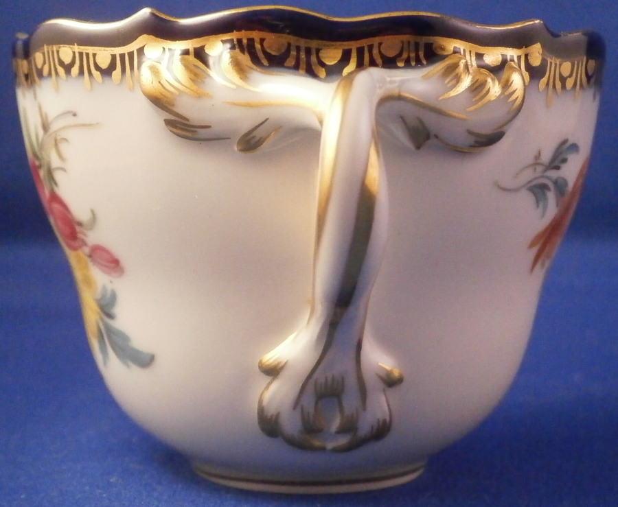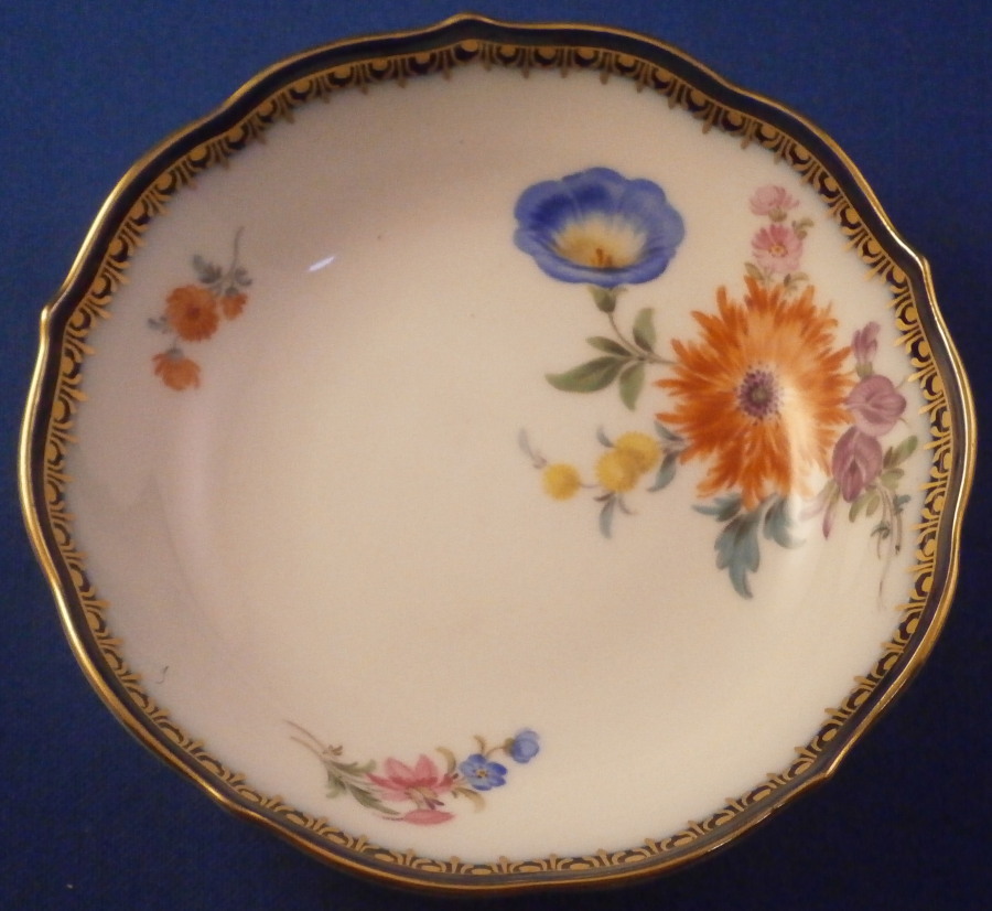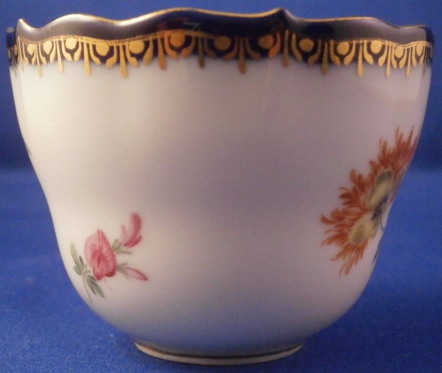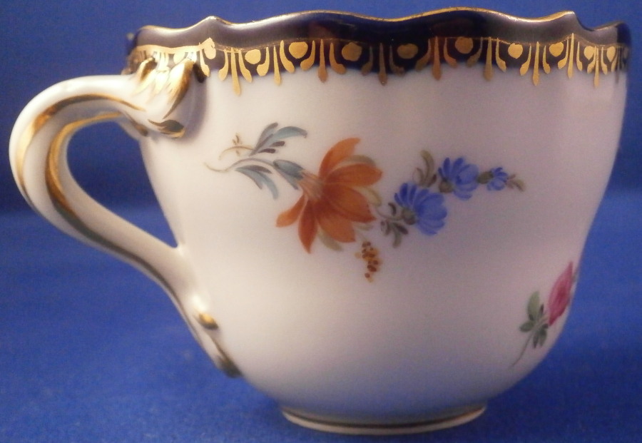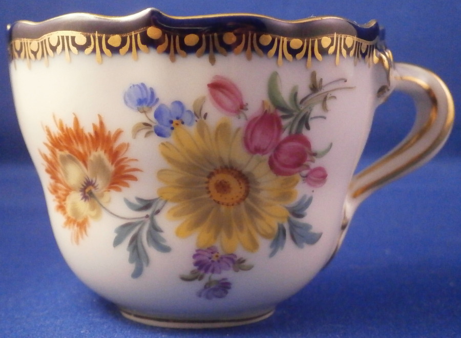 This is a mocha or espresso coffee demitasse cup and saucer made by Meissen in the 20th century. Both pieces are from the so called A_Kante series which refers to the nice cobalt blue ring with gold trim around the rims. Each piece is hand painted with a nice polychrome floral arrangement as well as a little single flower and a small floral arrangement. The edges of the peices have a nice shape to them and the handle of the cup is superb as well. This size cup is not easy to find and I like them better than regular sized pieces since they take up less room in the cabinets. The set is in perfect condition which never hurts either :) It is marked with the under glaze blue crossed swords mark underneath (first quality) as well as the usual impressed and painted marks one expects from pieces of this period as shown. The cup is 2 inches tall and 2.625 inches in diameter. The saucer is just over 1 inch tall and has a diameter of 4.375 inches. Please email me for more information or other pictures.