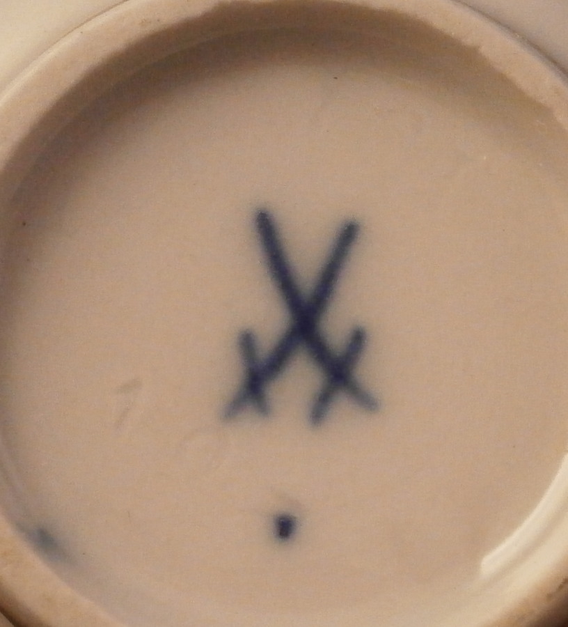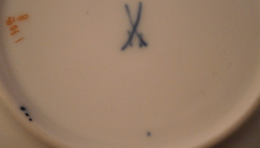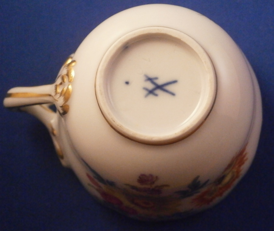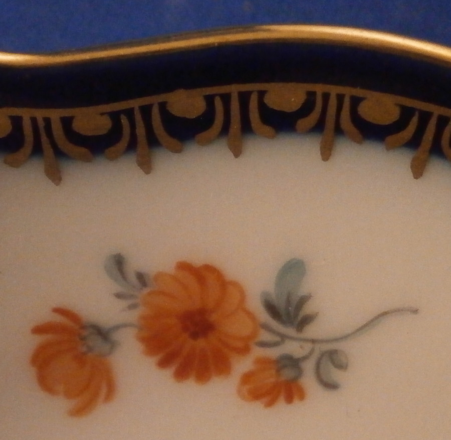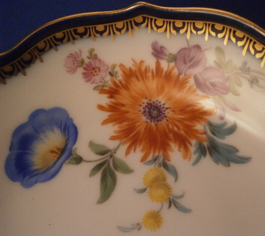 This is a mocha or espresso coffee demitasse cup and saucer made by Meissen in the 20th century. Both pieces are from the so called A_Kante series which refers to the nice cobalt blue ring with gold trim around the rims. Each piece is hand painted with a nice polychrome floral arrangement as well as a little single flower and a small floral arrangement. The edges of the peices have a nice shape to them and the handle of the cup is superb as well. This size cup is not easy to find and I like them better than regular sized pieces since they take up less room in the cabinets. The set is in perfect condition which never hurts either :) It is marked with the under glaze blue crossed swords mark underneath (first quality) as well as the usual impressed and painted marks one expects from pieces of this period as shown. The cup is 2 inches tall and 2.625 inches in diameter. The saucer is just over 1 inch tall and has a diameter of 4.375 inches. Please email me for more information or other pictures.