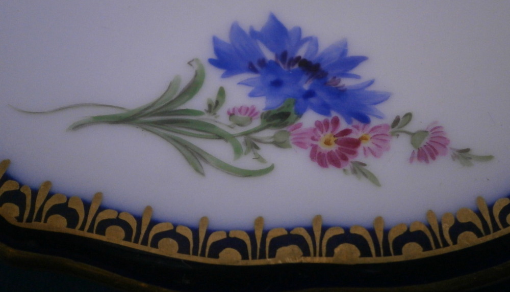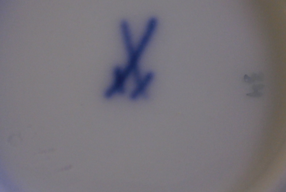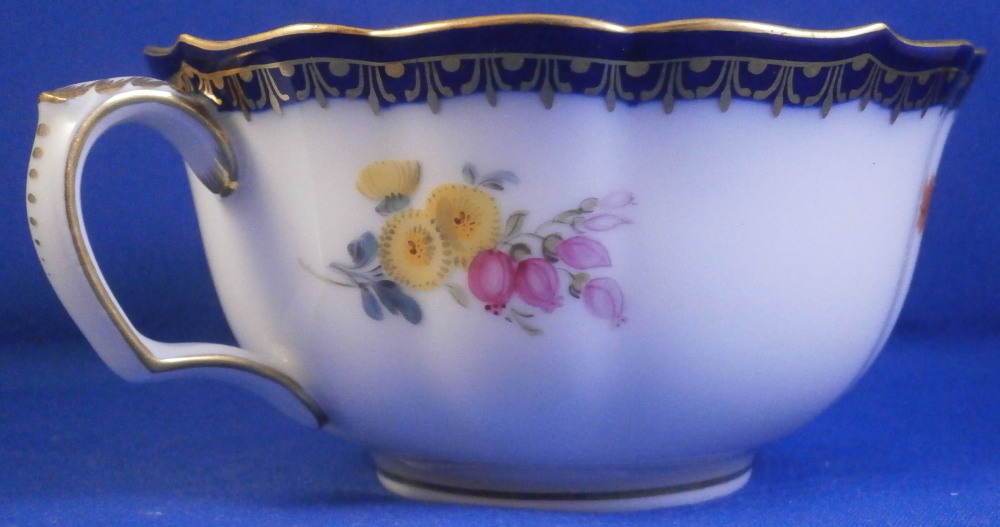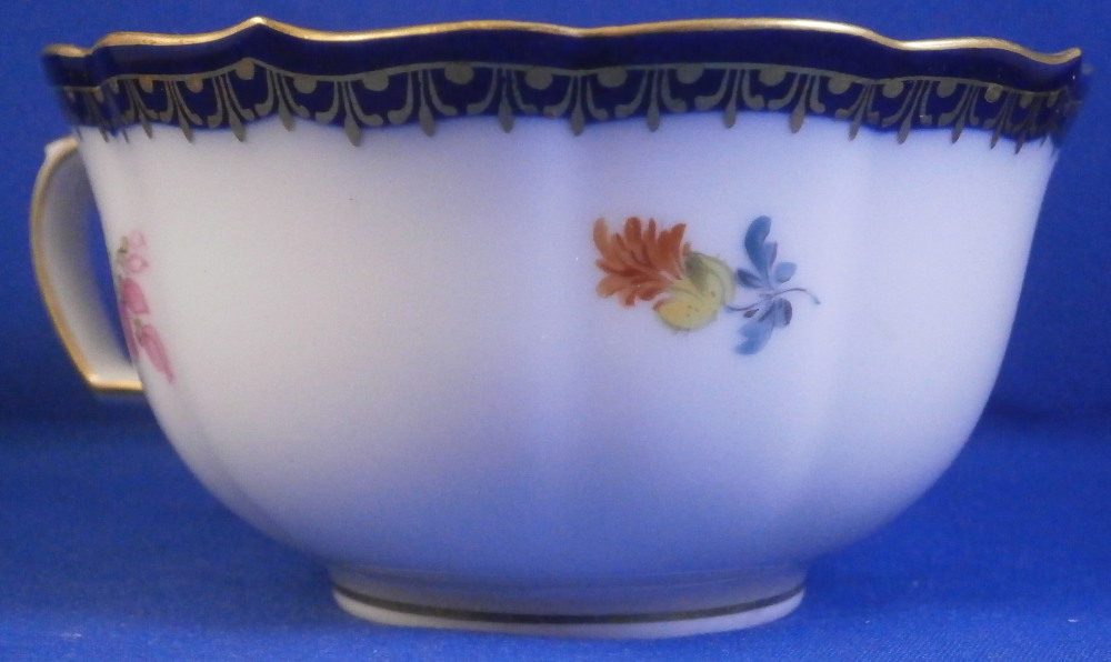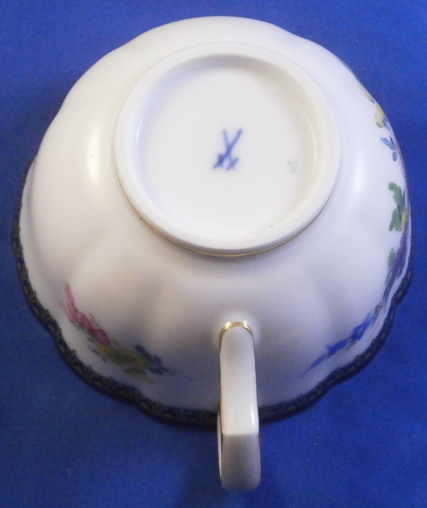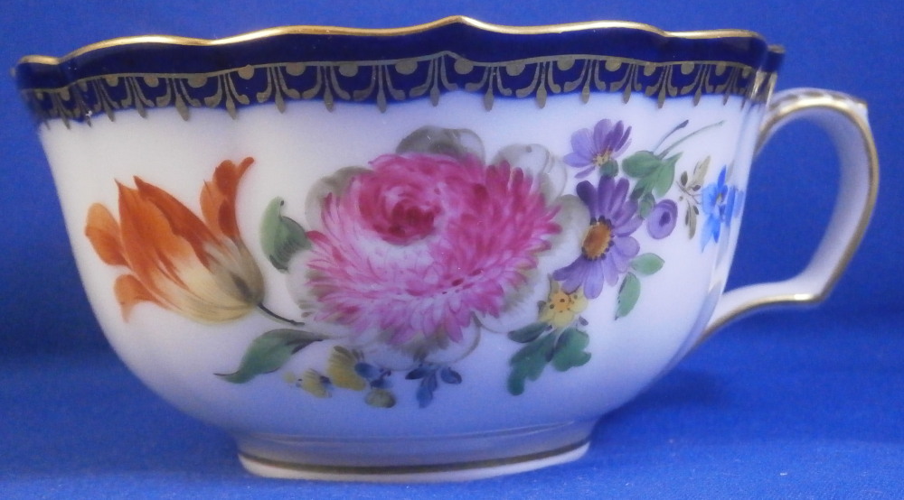 This is a porcelain tea cup and saucer made by Meissenin the 20th century. The decoration is from their A-Kante design with both pieces having a nice edge shape. They are both hand painted with a large polychrome floral arrangement to one side as well as a smaller arrangement and a single flower plus the cobalt blue and gold trim design to the rim that gives this service its name. A nice looking set that is in perfect condition. The saucer is 0.875 inches tall and 5.875 inches in diameter. The cup is 2 inches tall and 3.75 inches in diameter. Both are marked underneath with the under glaze blue crossed swords mark (first choice) as well as the usual impressed numbers, etc. as shown. I also have the sugar dish and creamer up on the site if anyone is interested in multiple pieces from this design. Please email me for more information or other pictures.