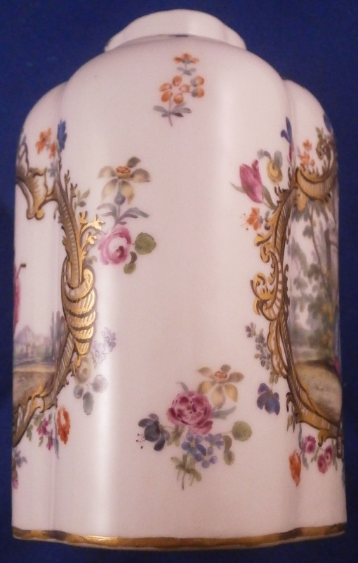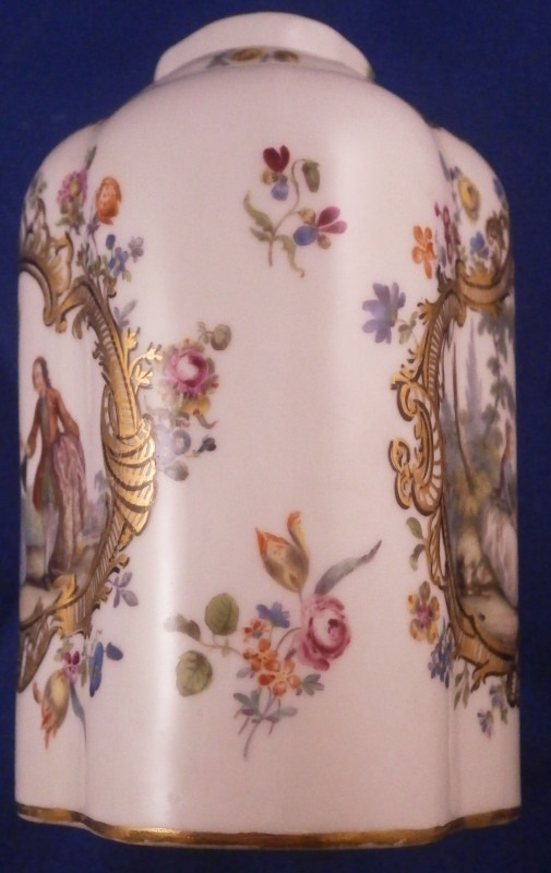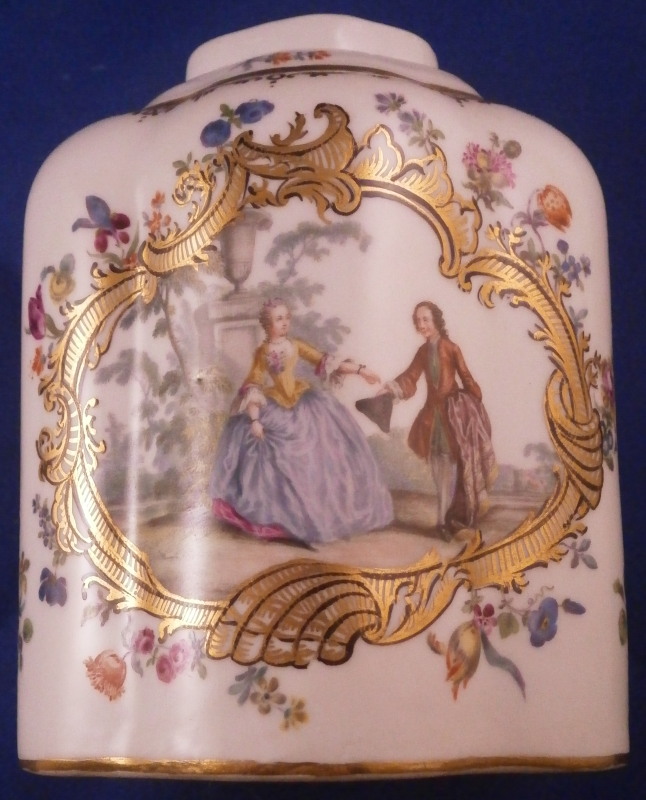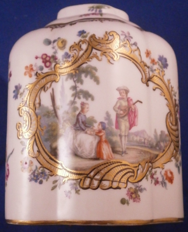 This is a rare treat - a tea caddy / jar made by Meissen around 1750. A much nicer version than most one sees even from Meissen! It has a nice shape to it with a hand painted top notch Watteau style scene to the front and back surrounded by a very fancy black and gold trim with lots of small flowers next to it and more flowers along each side, another fancy gold trim to the shoulder area and tiny flowers along the top (one of which hides a minor firing flaw). The lid has two small scenes to it and a floral finial. Simple gold trim to the bottom edges. The quality of the painting is superb! And the best part is that the piece is in perfect condition which is not something you see very often from this period. No problems at all except for a few tiny firing flaws normal on these early pieces. The teacaddy is not marked which is the normal on the unglazed undersides. They just kind of burned away during the firing process. The quality is an easy way to identify it as a Meissen piece. The jar is about 5 inches tall including the lid, 3.25 inches wide and 2.5 inches deep. Please email me for more information or other pictures.