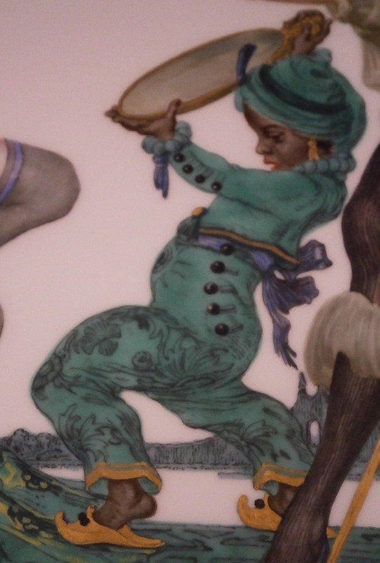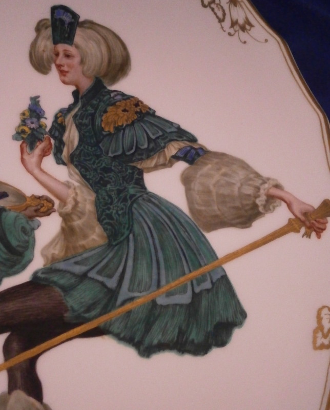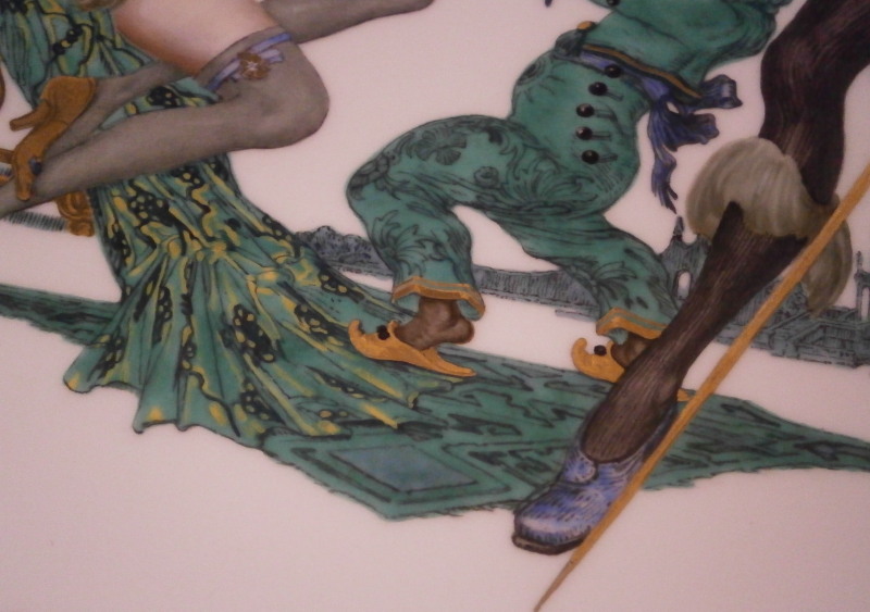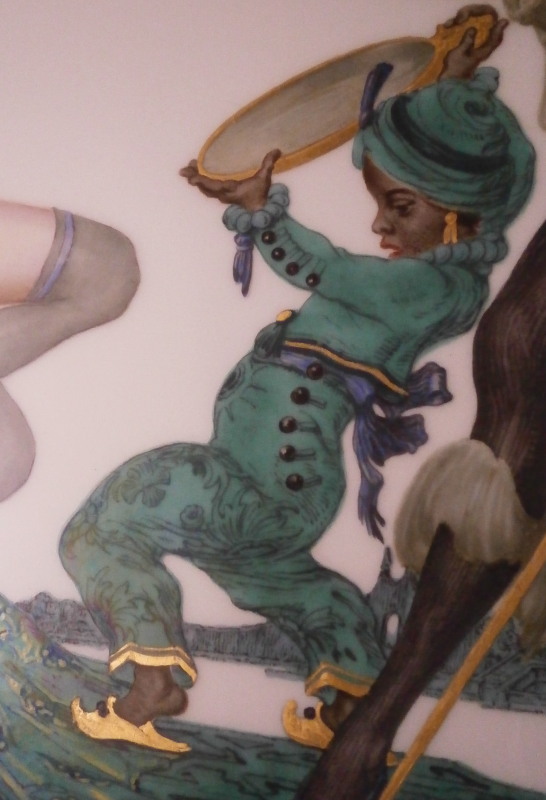 This is a very special plate / charger made by Meissen in the late 19th / early 20th century. I have never seen a piece by them with such a superbly painted beautiful nude lady on in! The piece is very much in the Art Nouveau / Jugendstil taste of the period and has a nice shape to it with a bit of gold trim to the edge and some gold leaf design in six areas along the rim. The center has an amazing scene of a nude flapper looking lady wearing a fancy hat and stockings with a while sitting on a chair with a small blackamoor in front of her holding up a mirror and another lady standing behind him in a fancy costume with a golden staff. A green ruin scene in the background The piece is mostly in the colors of a peacock, green, blue and yellow with lots of gold details I tried to show in the pictures as they stand out superbly at certain angles to the light. One of the nicest pieces I have ever come across by them and very unusual. Probably a special order piece. Looks like it was based on an Opera or play of the period. A stunning and elegant platter! It is larger than normal pieces as well being 13 inches in diameter and just under 1 inch tall. It is marked underneath with the under glaze blue crossed swords (first choice) as well as the usual impressed numbers from this period. The piece is in perfect condition - as nice a piece as you will ever find! Please email me for more information or other pictures.