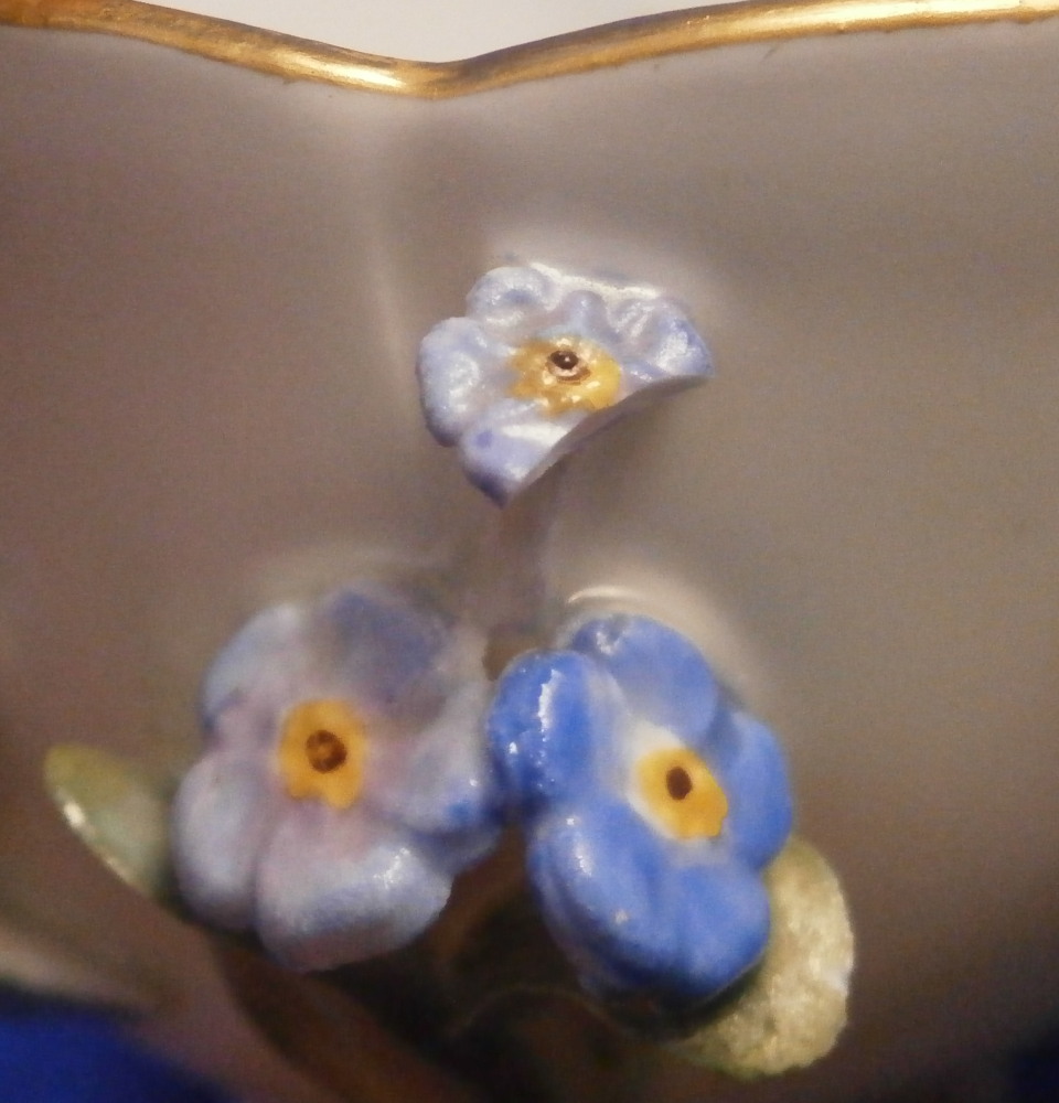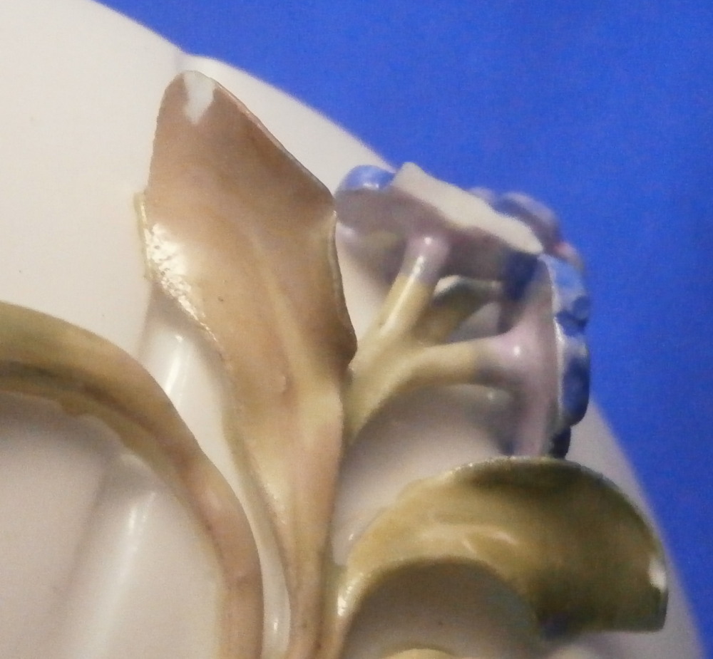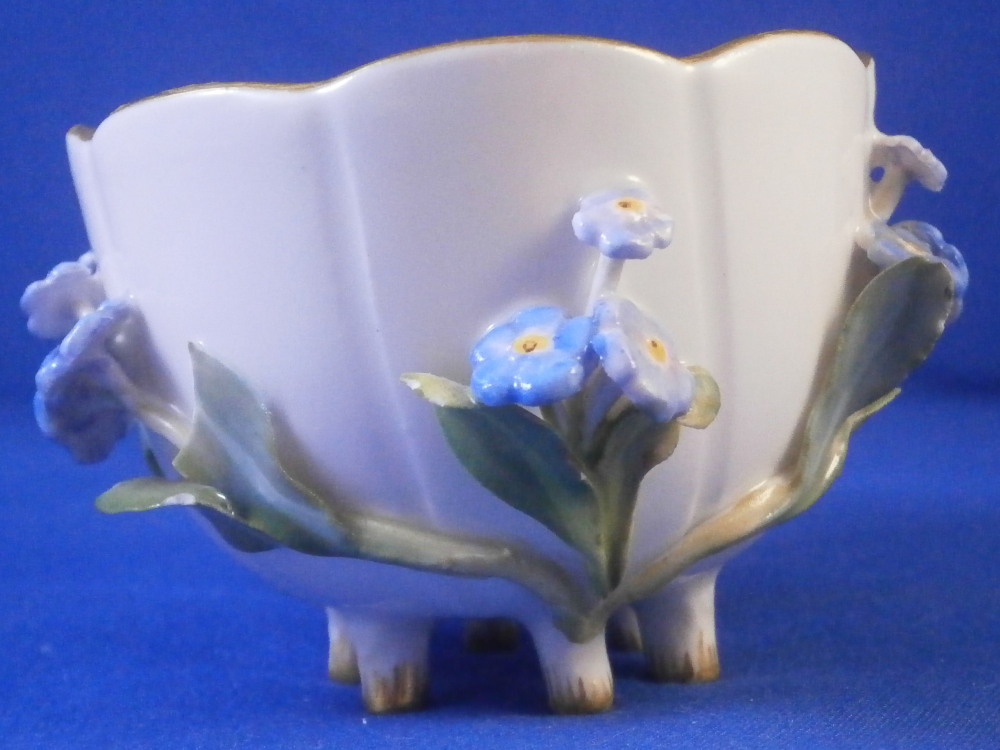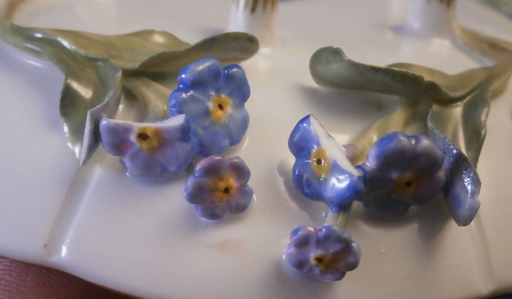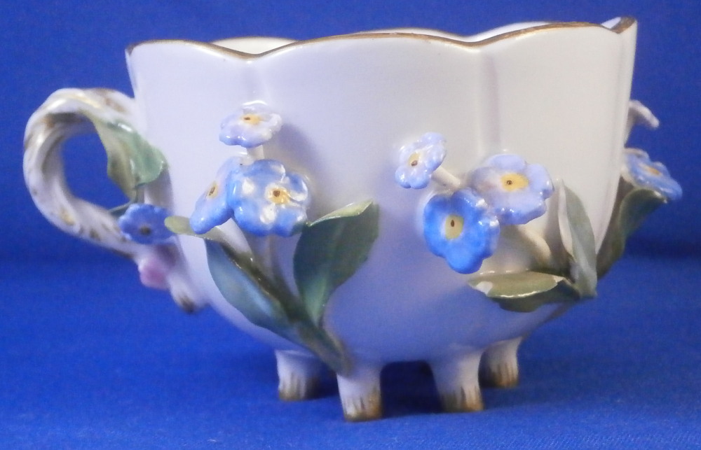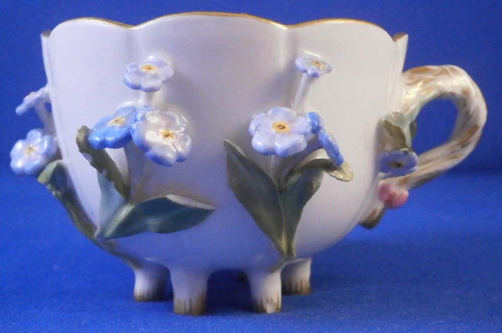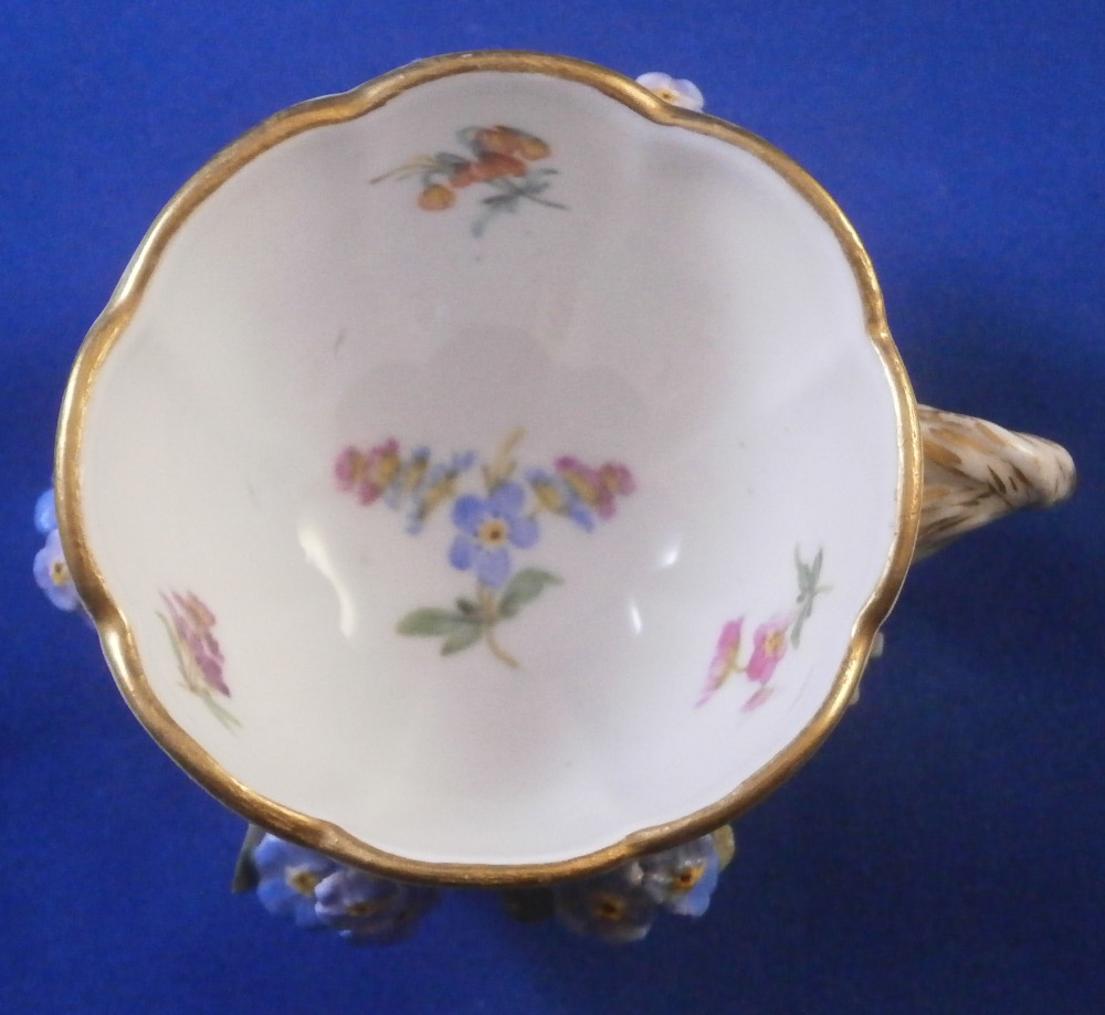 This is a really nice small cup and saucer made by Meissen in the later 19th century. Both are decorated with lots of applied 3D forget-me-not flowers and their leaves on the outside of the cup and bottom of the saucer. Both the cup and saucer sit on six feet and are hand painted with flowers on the inside of the cup and top of the saucer plus a gold trim to the nicely shaped rims. Nice handle to the cup highlighted with gilding and a pink bow and flowers to the top terminal. The cup and saucer are in great condition for this sort of decoration. There is always a little bit of damage and here we have three chipped leaves and one chipped flower plus a tiny chip to a foot on the cup. None are obvious and the piece looks great. The saucer has two chipped leaves and three chipped flowers to it. All in all in better shape than most of this type of decoration I ahve come across over the years. A very nice set to display! Both are marked with the under glaze blue crossed swords mark underneath as well as an impressed number under the saucer. The cup is 1.75 inches tall and 2.375 inches in diameter. The saucer is 0.875 inches tall and 4.25 inches in diameter. Please email me for more information or other pictures.
