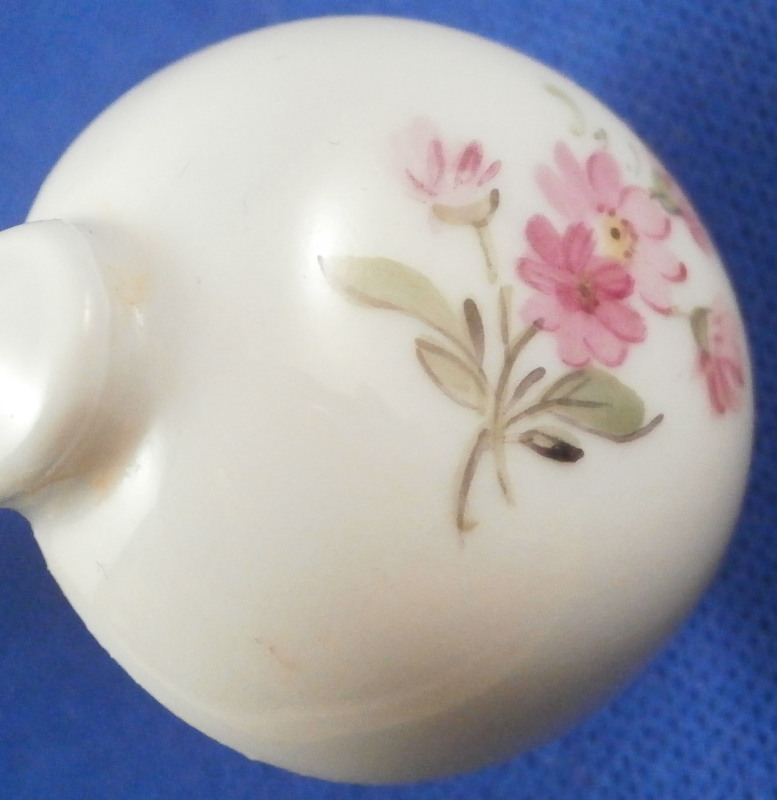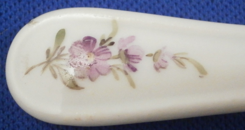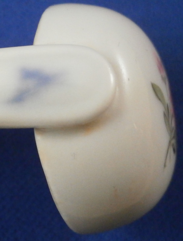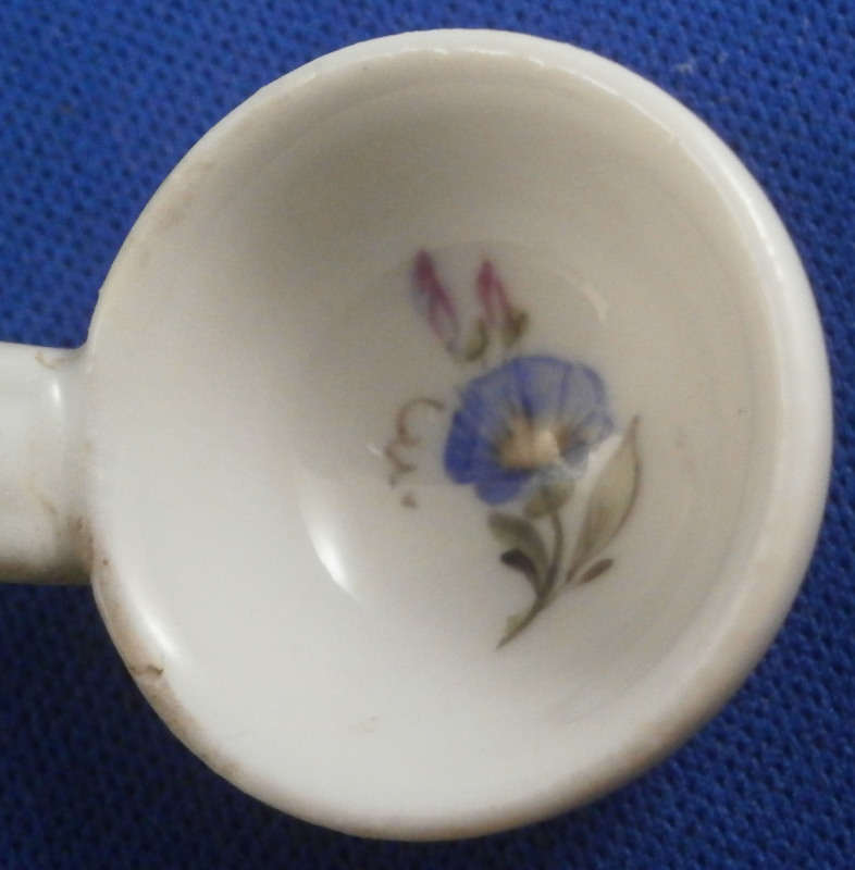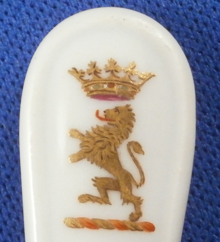 This is an interesting mustard spoon made by Meissen in the late 19th or early 20th century. It is nicely hand painted with their popular little flowers - one on the inside of the bowl, one on the udnerside of the bowl and one to the back end of the handle but the interesting part is an armorial to the front end of the handle of a golden rampant lion with a crown above it. I am sure it is for some sort of English royalty but could not figure out anything specific. The armorial is really detailed as is the crown so maybe someone else that knows more about this sort of thing could help. I would certainly appreciate it! The spoon is marked underneath where the bowl and the handle meet with the under glaze blue crossed swords mark but its fuzzy and hard to tell the age. First quality. It is in perfect condition with some minor wear. The piece is about 4 inches long. The bowl has a diameter of 1 inch and is 0.5 inches deep. Please email me for more information or other pictures.
