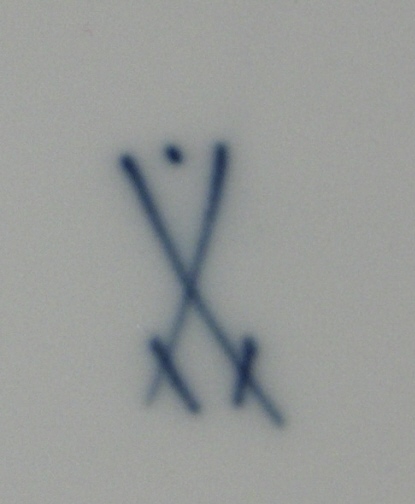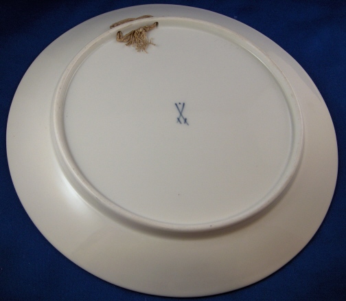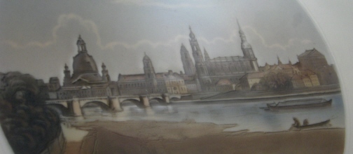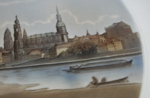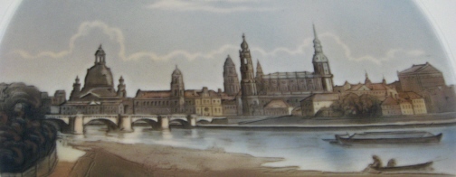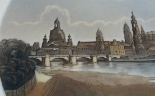 This is a very rare Art Nouveau / Jugendstil porcelain plate made by Meissen in the 1920's. Art Nouveau pieces by Meissen are fairly hard to find and I have never seen this piece anywhere nor could I find it when I looked for it the last few days. The plate is handpainted with the superb scene in the center of the city of Dresden - including the famous Frauenkirche aka Church of Our Lady and the Augustus Bridge, and Katholische Hofkirche plus the river Elbe (I think) in front of them. The porcelain under the buildings has a bit of a 3D effect of the buildings stamped into the paste to give it extra depth which is kind of neat but hard to show in the pics. The scene covers the entire center of the plate with the rim having the name DRESDEN stamped into the top and the armorial of the city of Leipzig (I think again - I know I know it is rare:) on the bottom of the rim. The white rim has a very elegant effect which was the point during this period. An amzing plate! This plate is in perfect condition. It is just over 1 inch tall and 9.875 inches in diameter so a nice size. It is marked underneath with the underglaze blue crossed swords with the dot of the Pfeiffer perios as well as the usual impressed and incised marks. Two holes in the footring for hanging with an old string still in it though I would not use that to hang it these days! Please email me for more information or other pictures.