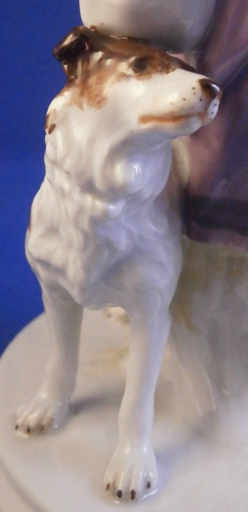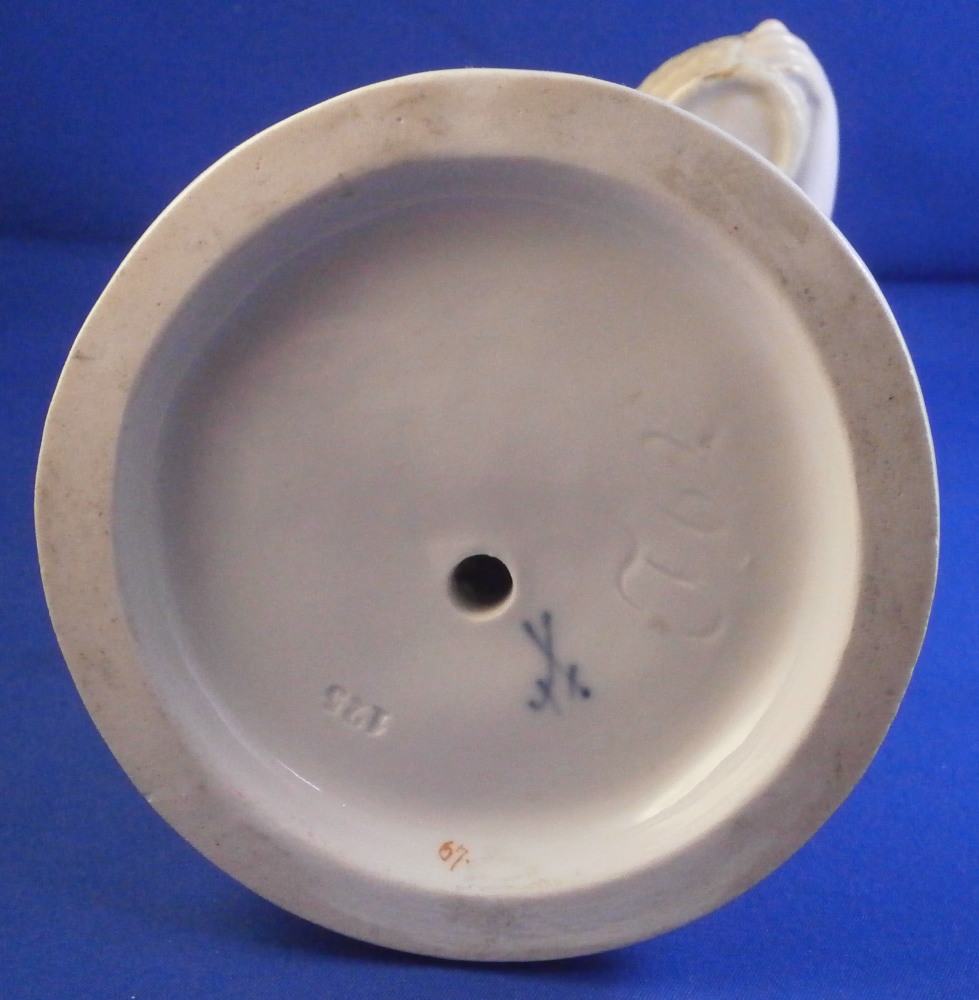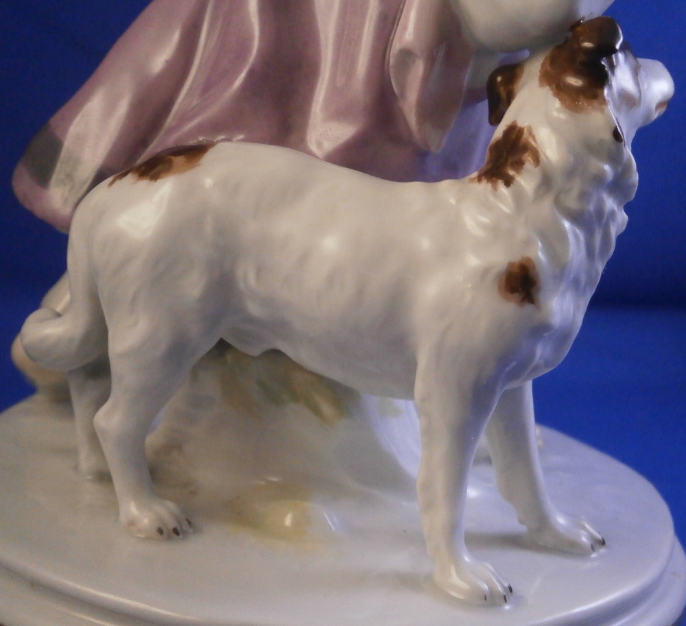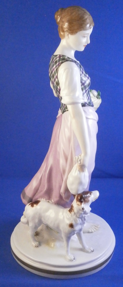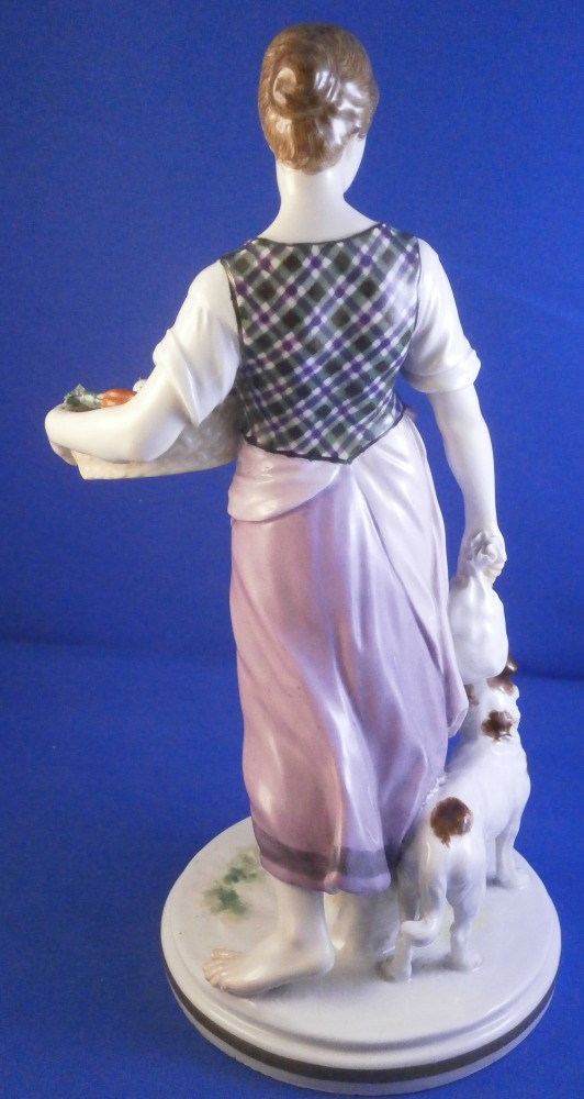This is a figurine of a young lady made by Meissen in the very early 20th century. I could not find an exact year this piece was first modeled but a range from 1901 until 1904 seems to be where it is at. The figure was modeled by Jacob Ungerer and is of a young farmer or gardener holding a basket filled with vegetables in her left hand and a small bag in her right hand. A quail hunting dog by her side which is my favorite part of the piece. The piece is superbly modeled and hand painted in the Art Nouveau / Jugendstil style of the period. She is actually the nicest I could find of this model. An amazing looking piece and larger than many figures one finds from Meissen. The piece is 9.5 inches tall with the base having a diameter of 4.375 inches. The figurine is marked underneath with the under glaze crossed swords mark as well as the model number T62 and the usual impressed and painter's marks as shown. The figurine is in great condition with some damage to the leaves of the vegetable in the basket which is to be expected. I think they changed them soon after the early pieces as many models I saw did not have the intricate leave to their vegetables anymore. It is not obvious at all and the piece displays superbly! Please email me for more information or other pictures.
