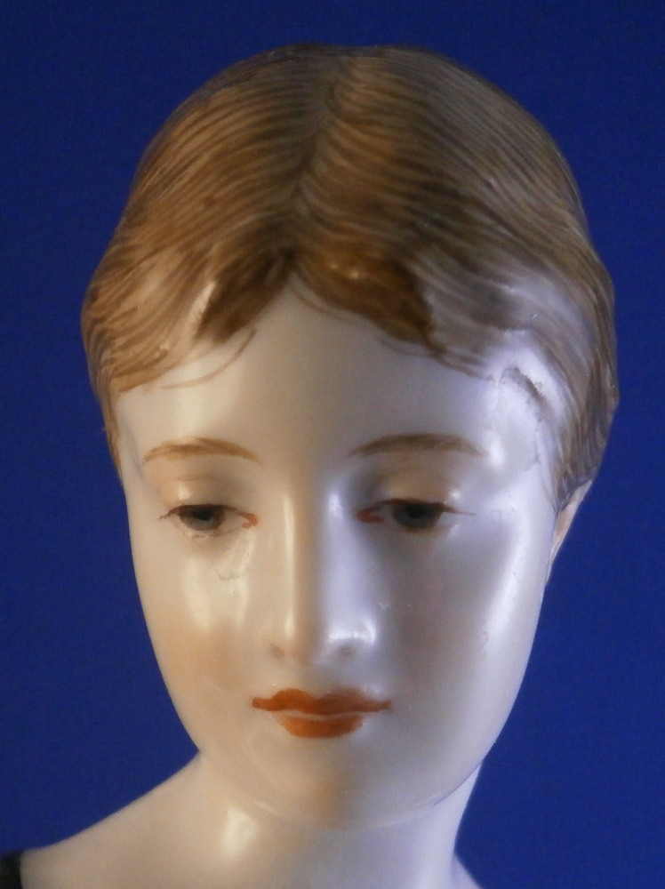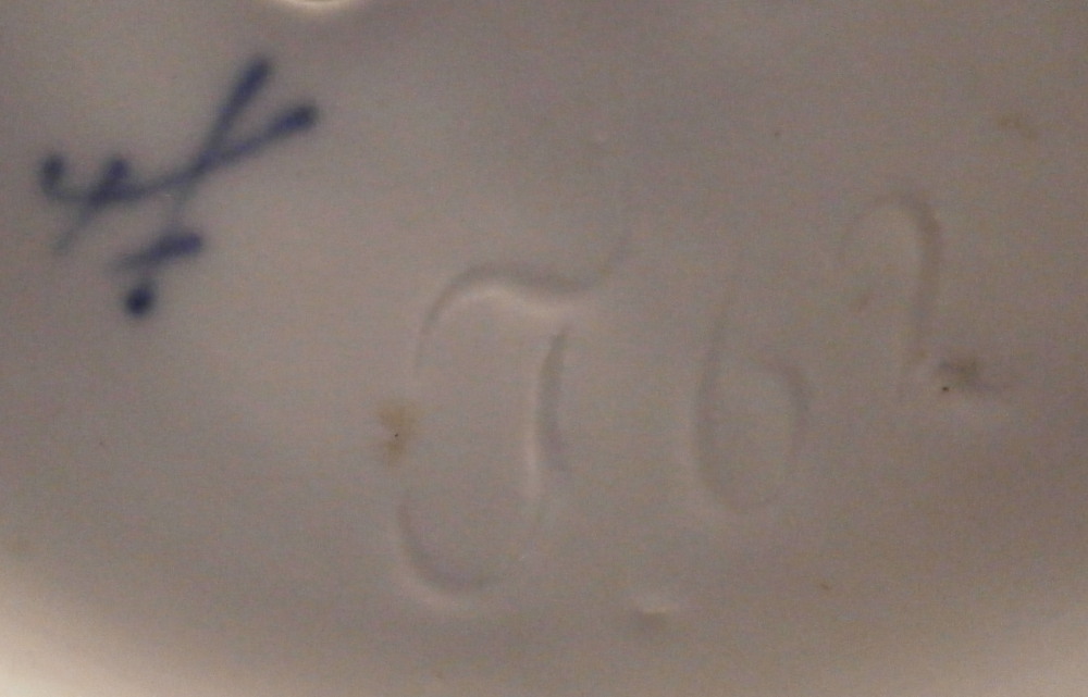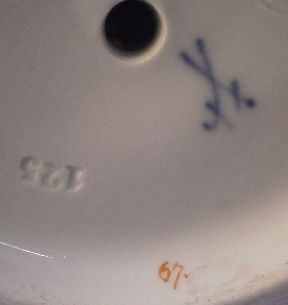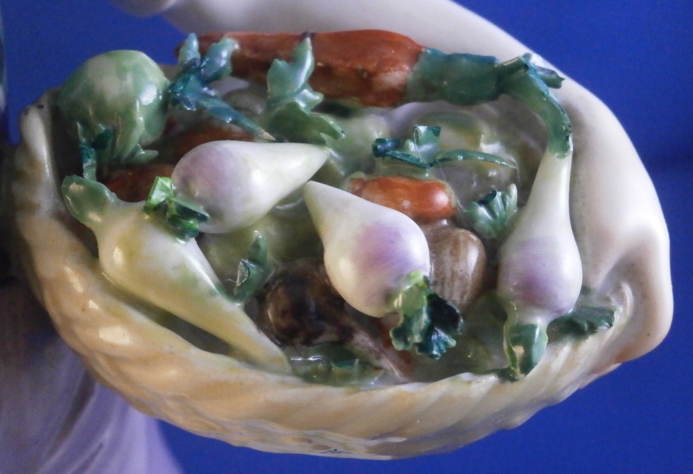 This is a figurine of a young lady made by Meissen in the very early 20th century. I could not find an exact year this piece was first modeled but a range from 1901 until 1904 seems to be where it is at. The figure was modeled by Jacob Ungerer and is of a young farmer or gardener holding a basket filled with vegetables in her left hand and a small bag in her right hand. A quail hunting dog by her side which is my favorite part of the piece. The piece is superbly modeled and hand painted in the Art Nouveau / Jugendstil style of the period. She is actually the nicest I could find of this model. An amazing looking piece and larger than many figures one finds from Meissen. The piece is 9.5 inches tall with the base having a diameter of 4.375 inches. The figurine is marked underneath with the under glaze crossed swords mark as well as the model number T62 and the usual impressed and painter's marks as shown. The figurine is in great condition with some damage to the leaves of the vegetable in the basket which is to be expected. I think they changed them soon after the early pieces as many models I saw did not have the intricate leave to their vegetables anymore. It is not obvious at all and the piece displays superbly! Please email me for more information or other pictures.