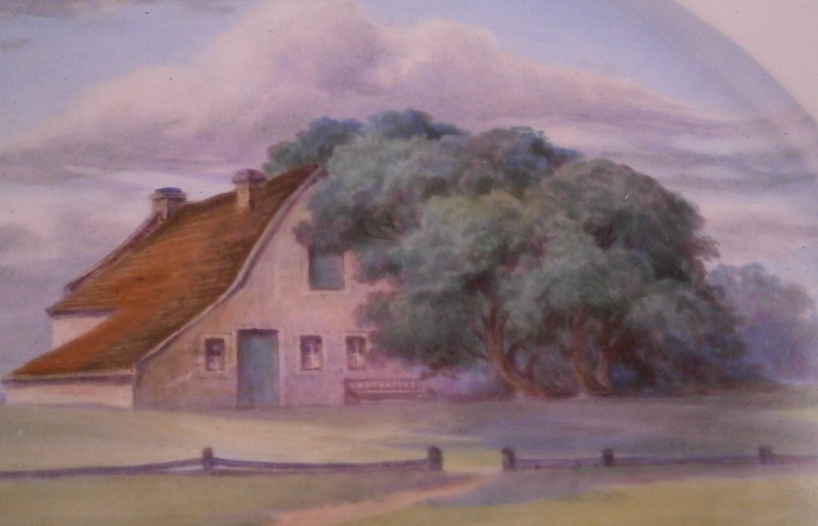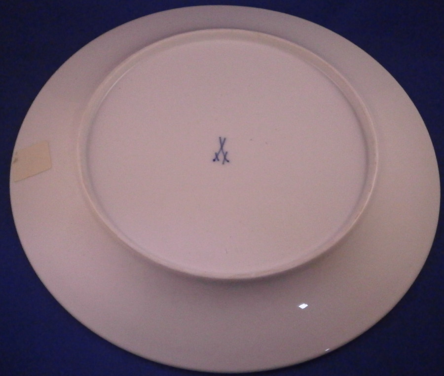 This is a rare Art Nouveau / Jugendstil porcelain plate made by Meissen around 1900. Meissen missed the train a bit in terms of Art Nouveau / Jugendstil and thus their pieces are much harder to find than those of other makers of this period. What they did make were some superb pieces and this is a great example of it. The plate is hand painted with the superb scene covering the entire center which includes a house with some trees next to it, a path leading to the house through a fence and some nice flowers in the front. Superb landscape scene with some clouds above. A perfect piece for this period. The rim being simple and left in the white which makes this a super elegant plate! An amazing plate! This piece is in perfect condition. It is 1.125 inches tall and 10.625 inches in diameter so rather large. It is marked underneath with the under glaze blue crossed swords as well as the usual impressed marks as shown. I ahve a few other plates from this series with different designs if anyone wants to have a pair which would amazing on the wall! Please email me for more information or other pictures.