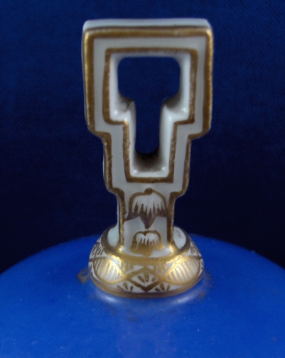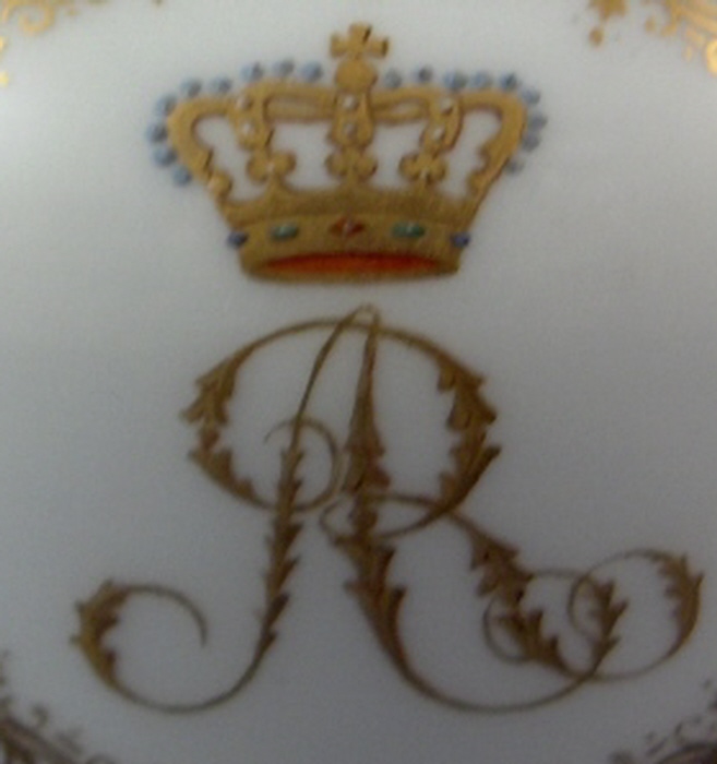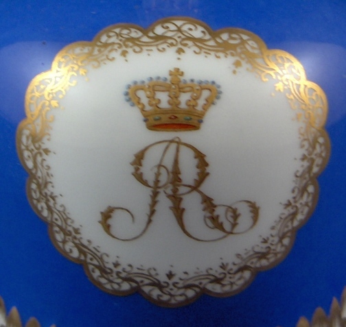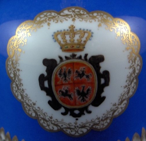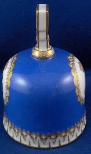 This is a very rare treat - a bell made by Meissen in the 19th century. It is handpainted with a blue ground and lots of nice gilding but the best part is that it has an armorial on it as well as a monogram of Augustus Rex himself - August the Strong or King August II was the founder of the Meissen factory. This is likely an anniversary piece or a special order piece but either way it is extremely rare to have his coat of armor on anything let alone in combination with his monogram. The armorial is very well painted with his crown above it and surrounded by fancy gilding. The AR monogram also has his crown above it and is surrounded by the same fancy gilding. The bell is in perfect condition. It is marked with the underglaze blue crossed swords as shown. The bell is 3.875 inches tall and 2.75 inches in diameter. Please email me for more information or other pictures.