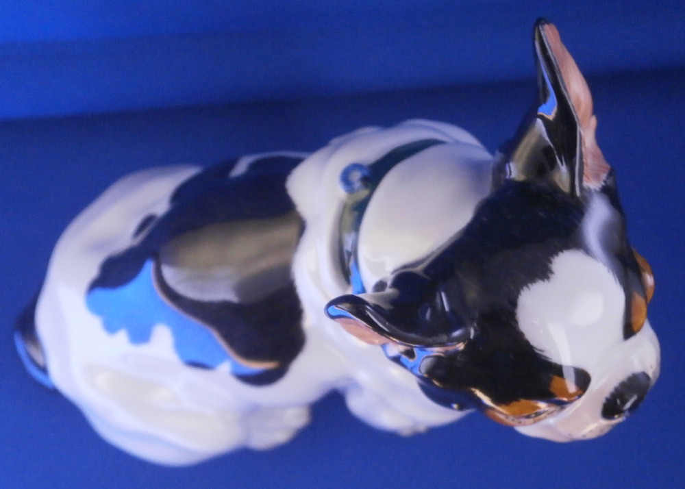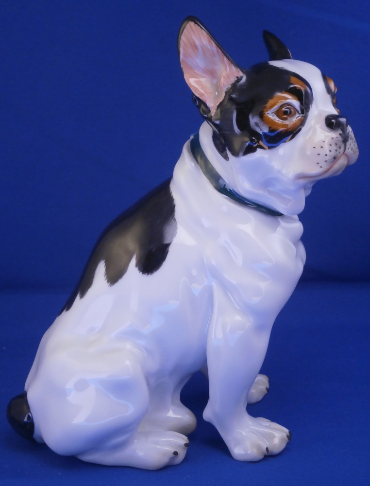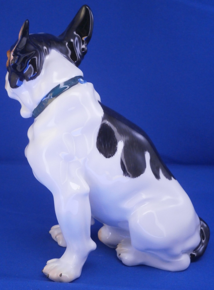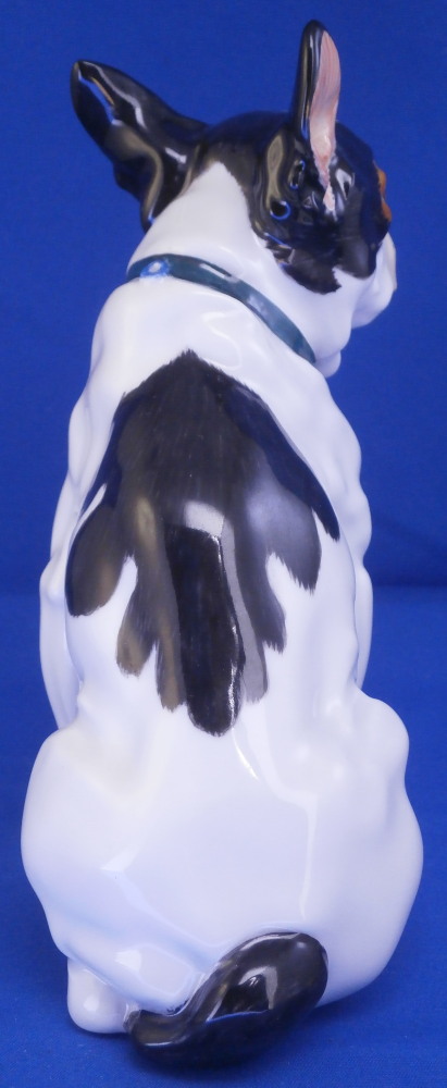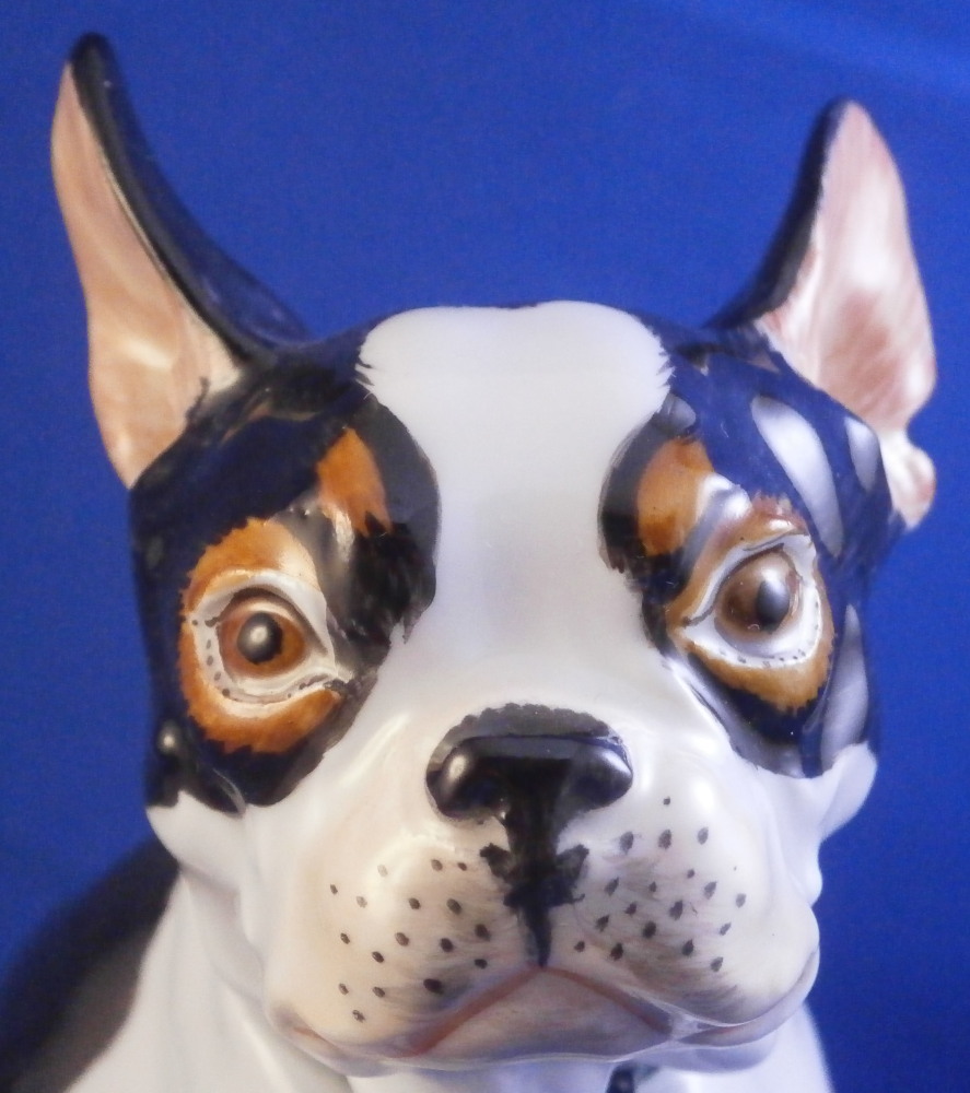 This is a superb figurine of a dog made by Meissen during the mid 20th century. I have seen this described both as a Boston terrier pup and a French Bulldog pup and since I suck at dogs I don't which one is true. Either way he is modelled superbly and hand painted to perfection with the rare under glaze colors Meissen used occasionally on these types of figures. A really nice version of this model. The coloration of the face looks amazing! Nice green collar to give it a little extra detail. The figure was first modeled by Erich Hösel in 1911 I believe. The figurine is in perfect condition which is always nice! It is marked underneath with the under glaze blue crossed swords mark as well as the usual impressed / incised marks and a faint red number 4 as the painter's mark as shown. The piece is just under 6 inches tall, 2.625 inches wide and 5 inches long. A really superb dog figurine - one of the ncest I have seen in a while. Please email me for more information or other pictures.