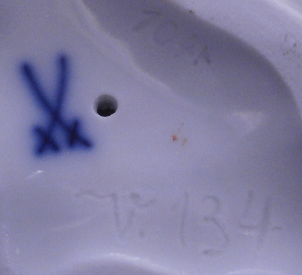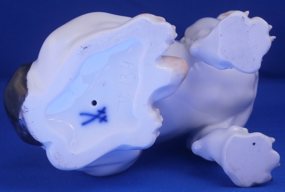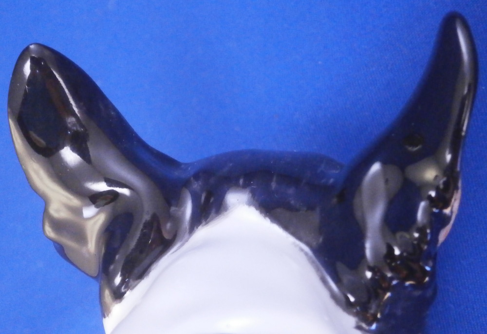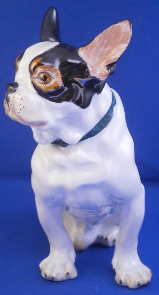 This is a superb figurine of a dog made by Meissen during the mid 20th century. I have seen this described both as a Boston terrier pup and a French Bulldog pup and since I suck at dogs I don't which one is true. Either way he is modelled superbly and hand painted to perfection with the rare under glaze colors Meissen used occasionally on these types of figures. A really nice version of this model. The coloration of the face looks amazing! Nice green collar to give it a little extra detail. The figure was first modeled by Erich Hösel in 1911 I believe. The figurine is in perfect condition which is always nice! It is marked underneath with the under glaze blue crossed swords mark as well as the usual impressed / incised marks and a faint red number 4 as the painter's mark as shown. The piece is just under 6 inches tall, 2.625 inches wide and 5 inches long. A really superb dog figurine - one of the ncest I have seen in a while. Please email me for more information or other pictures.