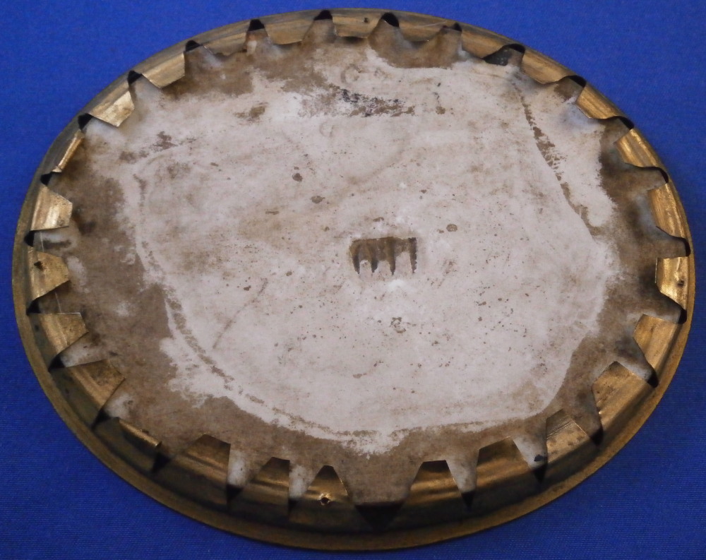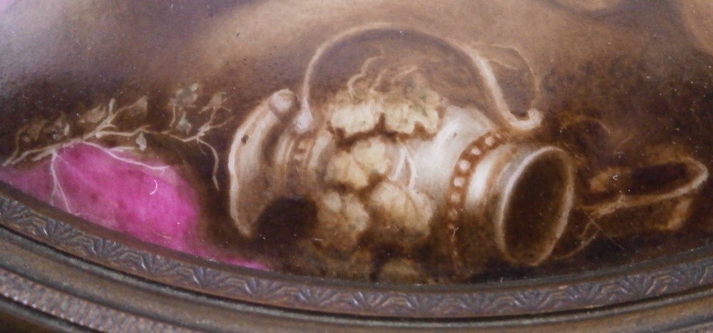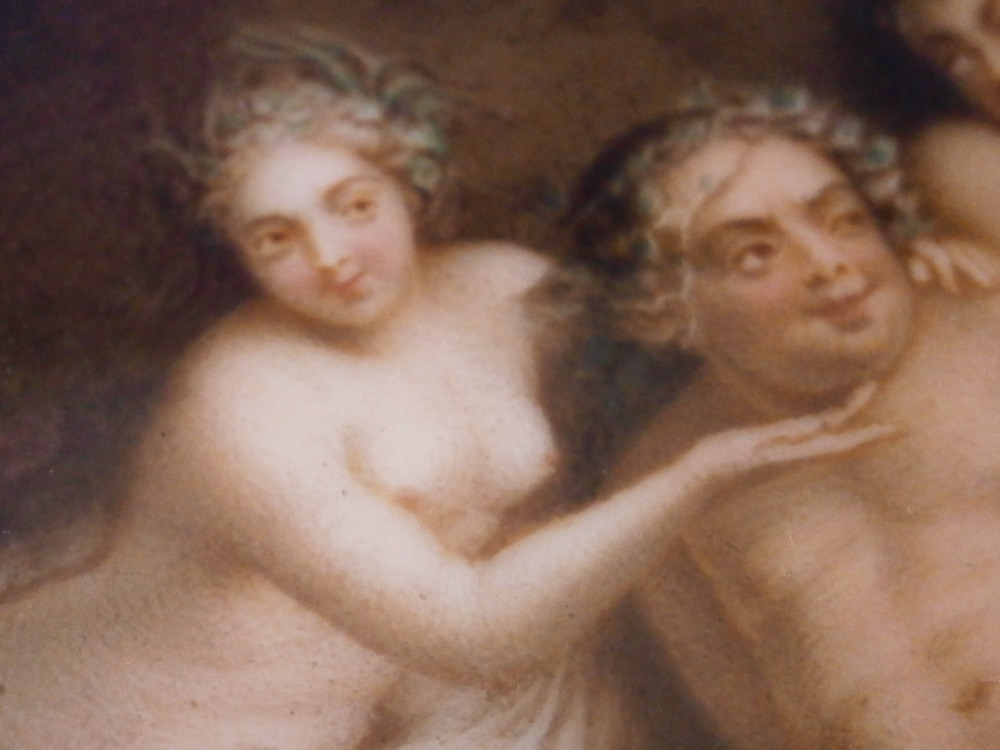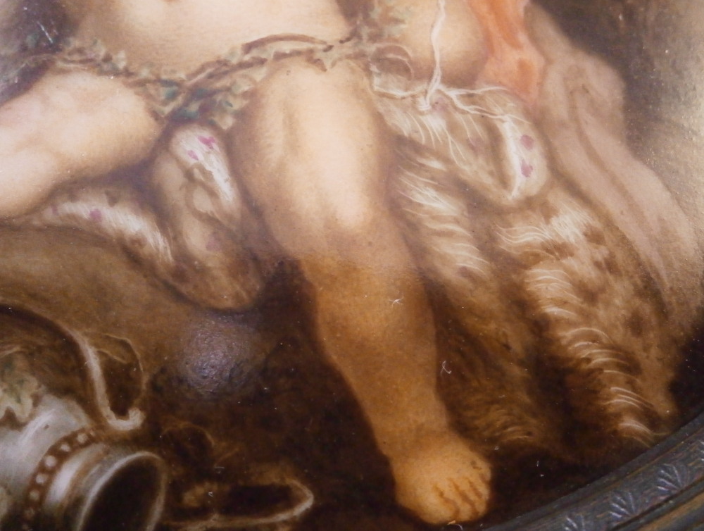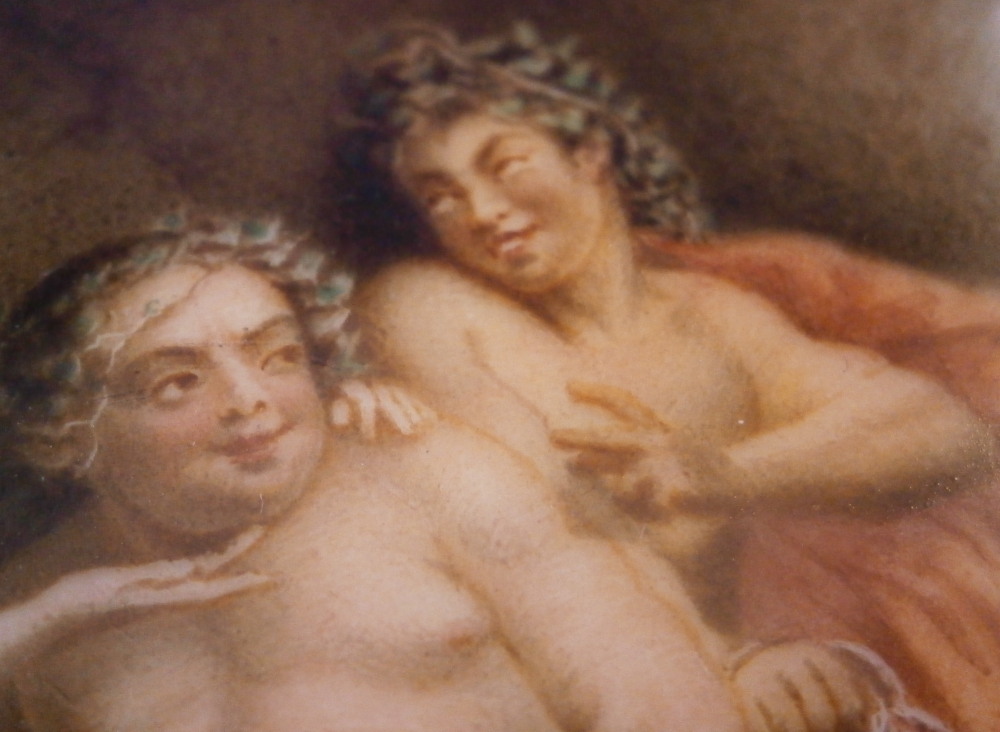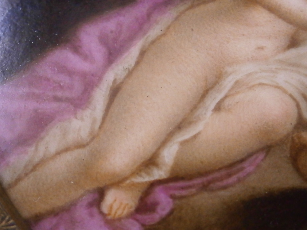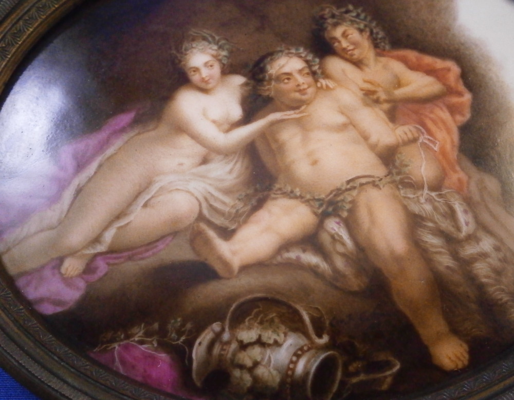 This is a superb plaque made by Meissen around the mid 18th century. The oval porcelain piece is hand painted with a superb scene of what looks to be Bacchus aka Dionysus or the god of wine among other things in the center with a nude lady - possibly the goddess Venus to the left and a figure on the right that looking at his face might be the god Pan. The three are lying / sitting in what looks to be a cave with a shrub by the opening. There is a leopard pelt under them and Venus has a pink and a white cloth by her some of which are covering her mid section but her breasts are exposed. Pan has an orange cloth. There is a jug covered with grape leaves on the ground in front of them. A superbly painted piece that is very detailed and of top quality! It comes in a brass (I think) frame that looks ncie enough. It has some nice details to it and held onto the plaque by metal prongs bent over the back of the plaque. The frame has darkened with age but could be polished. The porcelain is in great condition except for a small chip to the top edge hidden by the frame when on display! The plaque is only marked by an impressed number 110 or something along those lines. It is unglazed and any mark that might have been there is gone. There is however no doubt as to the maker looking at the quality! Definitely a Meissen piece! The entire piece and frame are 0.375 inches thick, 4.625 inches wide and just under 4 inches high. The plaque is 4.25 inches wide and 3.375 inches high. Please email me for more information or other pictures.