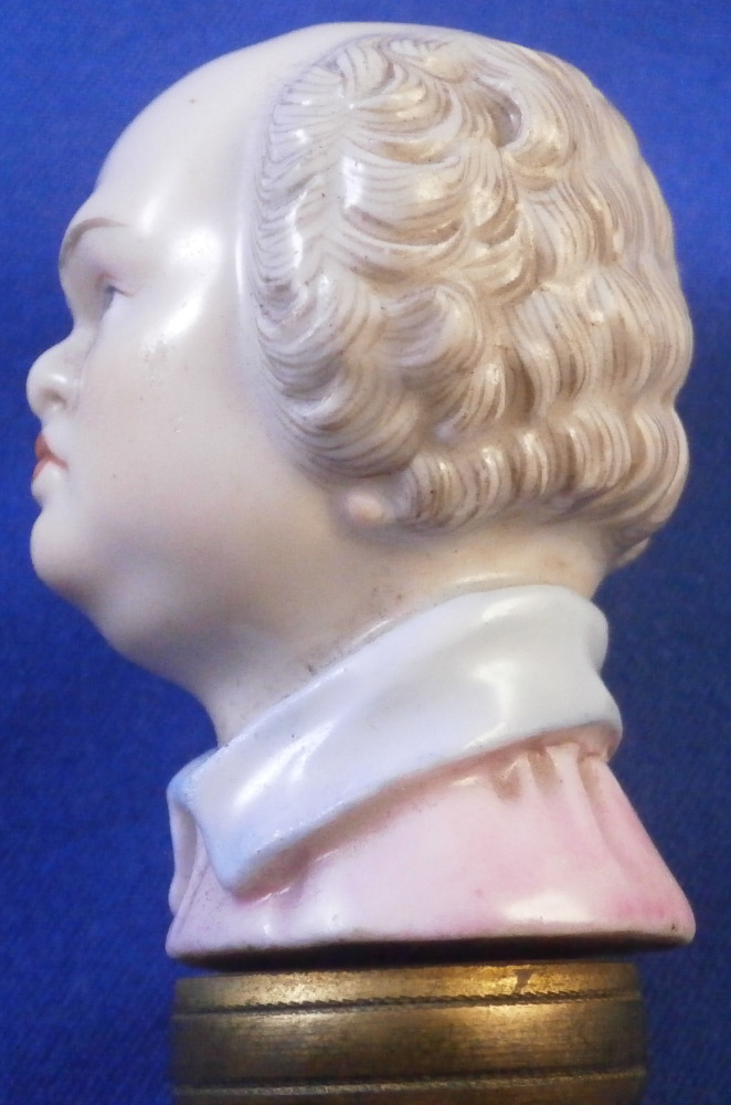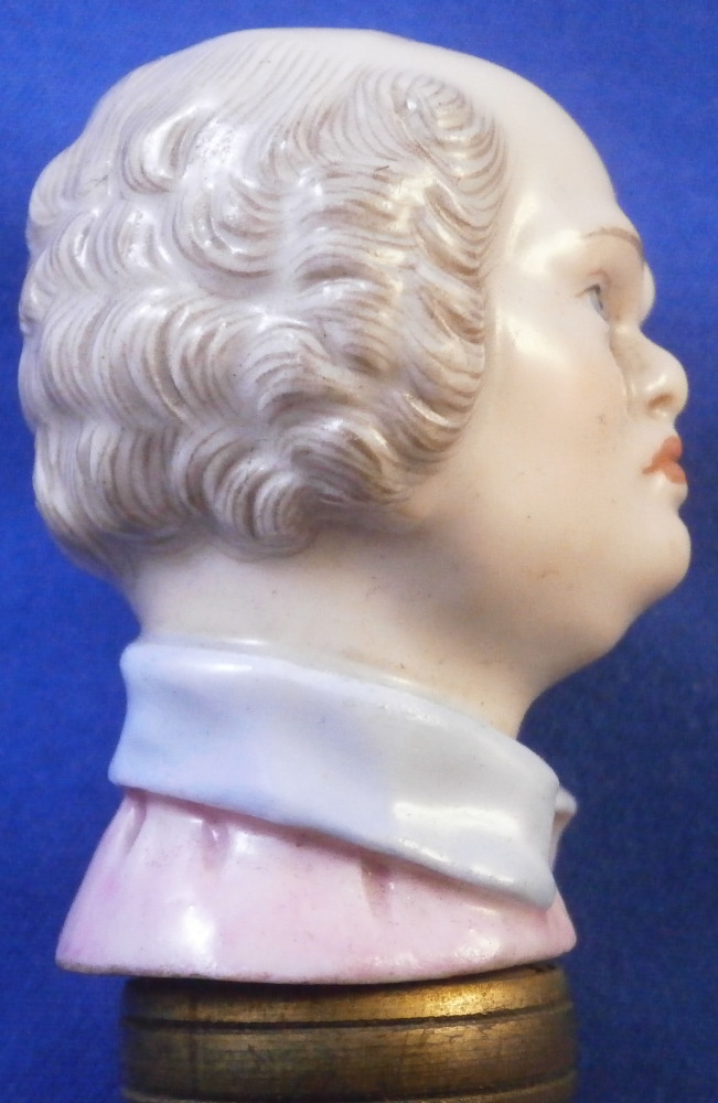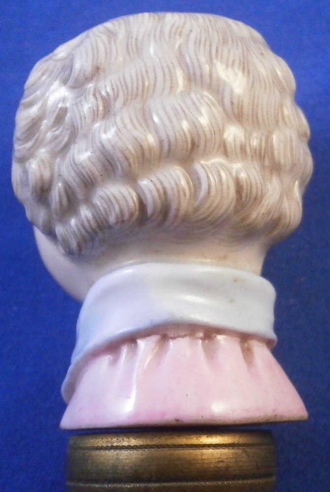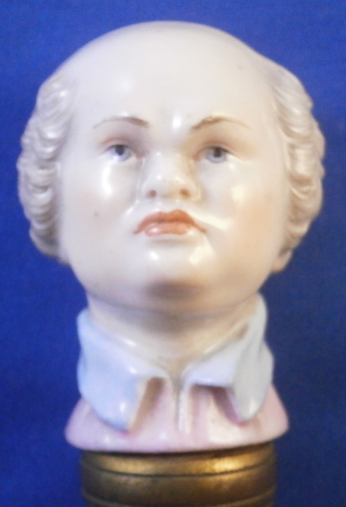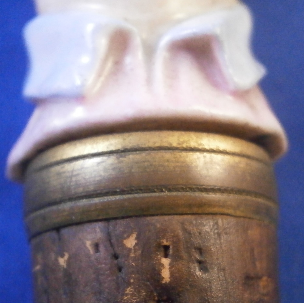 This is a rare figural bottle stopper made by Meissen during the mid to late 19th century. It is in the form of a bald gentleman with hair around the sides and back. He is wearing a pink shirt with a light blue collar. The piece is nicely modeled and hand painted perfectly. A superb example of one of these stoppers! There are a few different models of these stoppers out there and they are all great. I have quite a few of them for sale on the site now. The porcelain head is connected to a cork which is still the original one! The cork has a decorative metal ring to the top that is probably brass and could use a polish. It is held together by a thin metal rod with a plate on the bottom to hold the cork. The cork looks original and was definitely used. It is very dry but looks nice. The porcelain head is in perfect condition! The stopper is marked underneath as shown which is possible since the cork does slide down so the connection to the bottom plate that hold the cork in must be lost. The entire piece is 3.625 inches tall. The cork is 2 inches long and 0.75 inches in diameter. The head is 1.625 inches tall and 1.25 inches wide. Please email me for more information or other pictures.