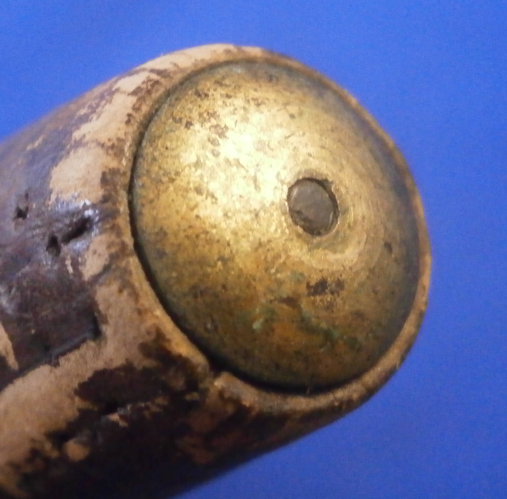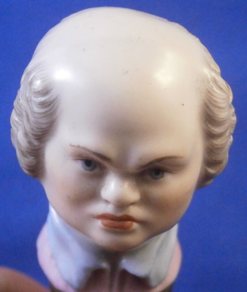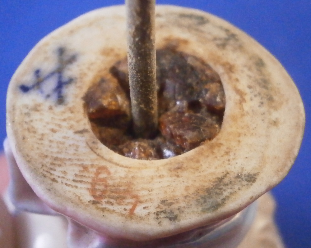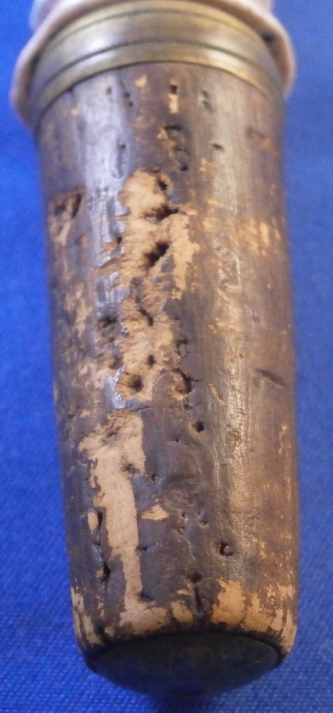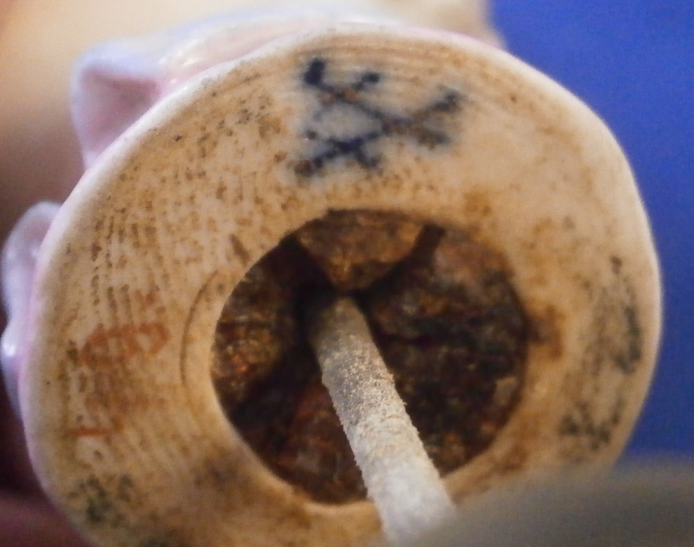 This is a rare figural bottle stopper made by Meissen during the mid to late 19th century. It is in the form of a bald gentleman with hair around the sides and back. He is wearing a pink shirt with a light blue collar. The piece is nicely modeled and hand painted perfectly. A superb example of one of these stoppers! There are a few different models of these stoppers out there and they are all great. I have quite a few of them for sale on the site now. The porcelain head is connected to a cork which is still the original one! The cork has a decorative metal ring to the top that is probably brass and could use a polish. It is held together by a thin metal rod with a plate on the bottom to hold the cork. The cork looks original and was definitely used. It is very dry but looks nice. The porcelain head is in perfect condition! The stopper is marked underneath as shown which is possible since the cork does slide down so the connection to the bottom plate that hold the cork in must be lost. The entire piece is 3.625 inches tall. The cork is 2 inches long and 0.75 inches in diameter. The head is 1.625 inches tall and 1.25 inches wide. Please email me for more information or other pictures.