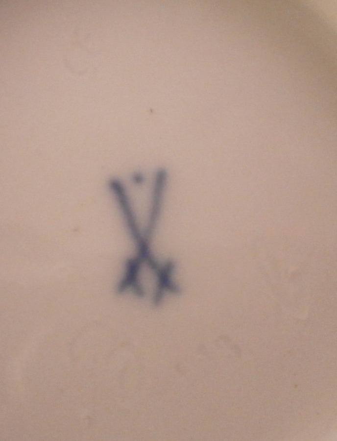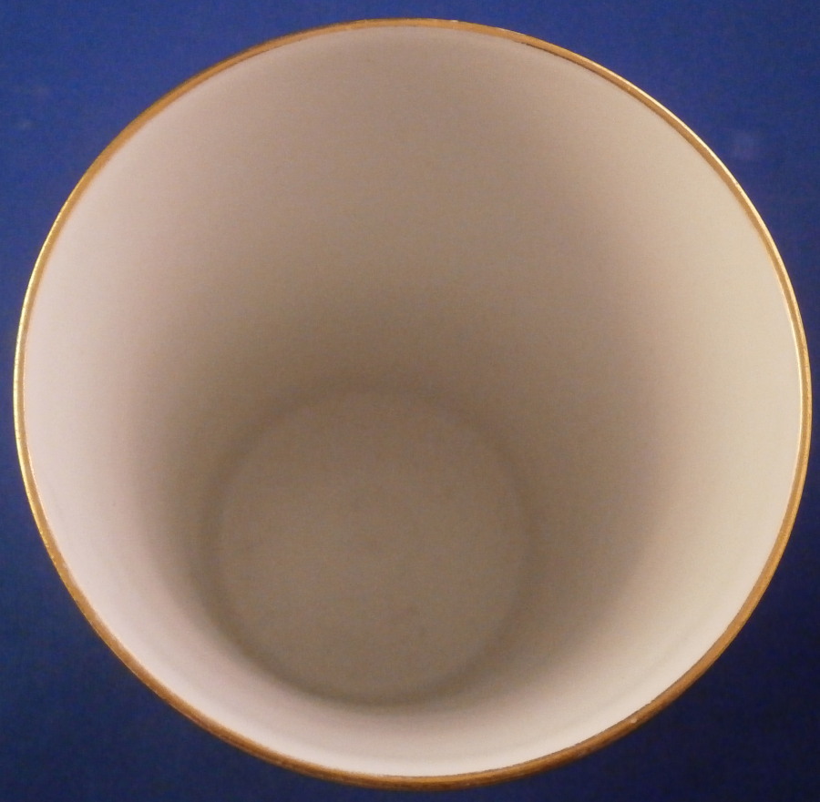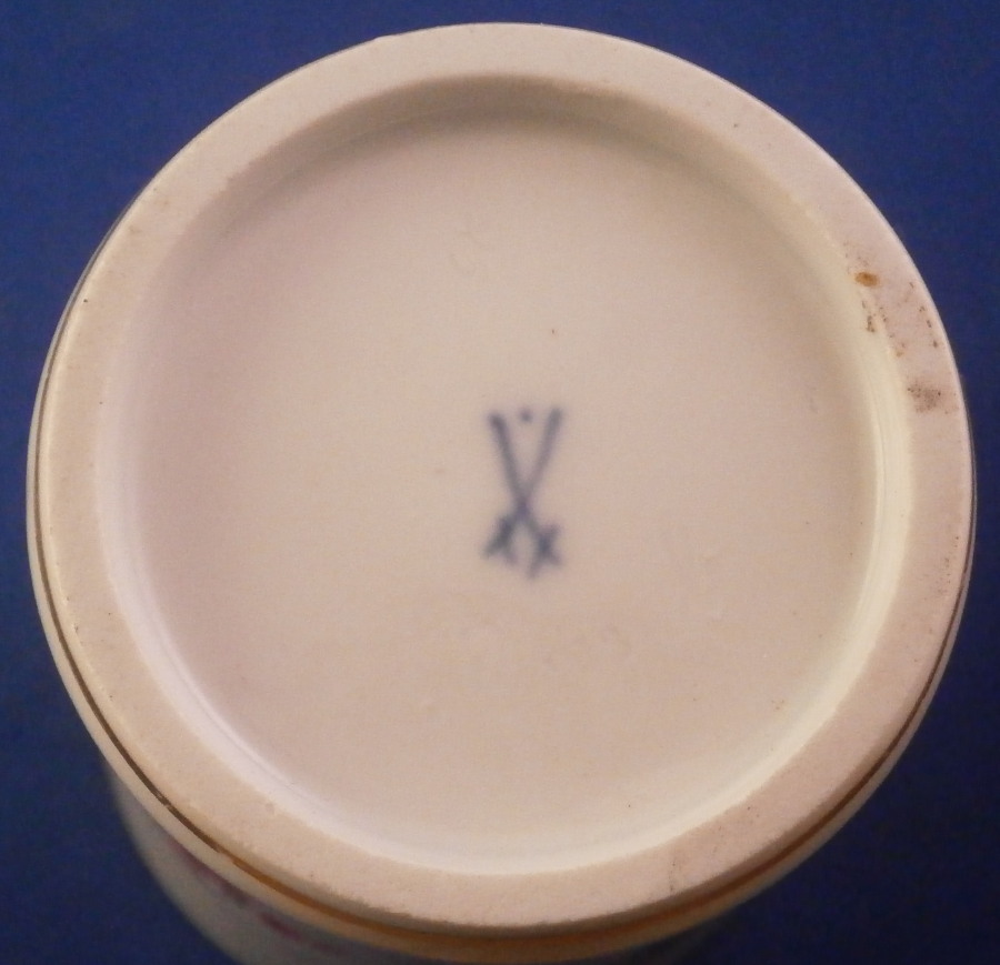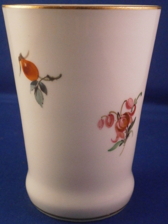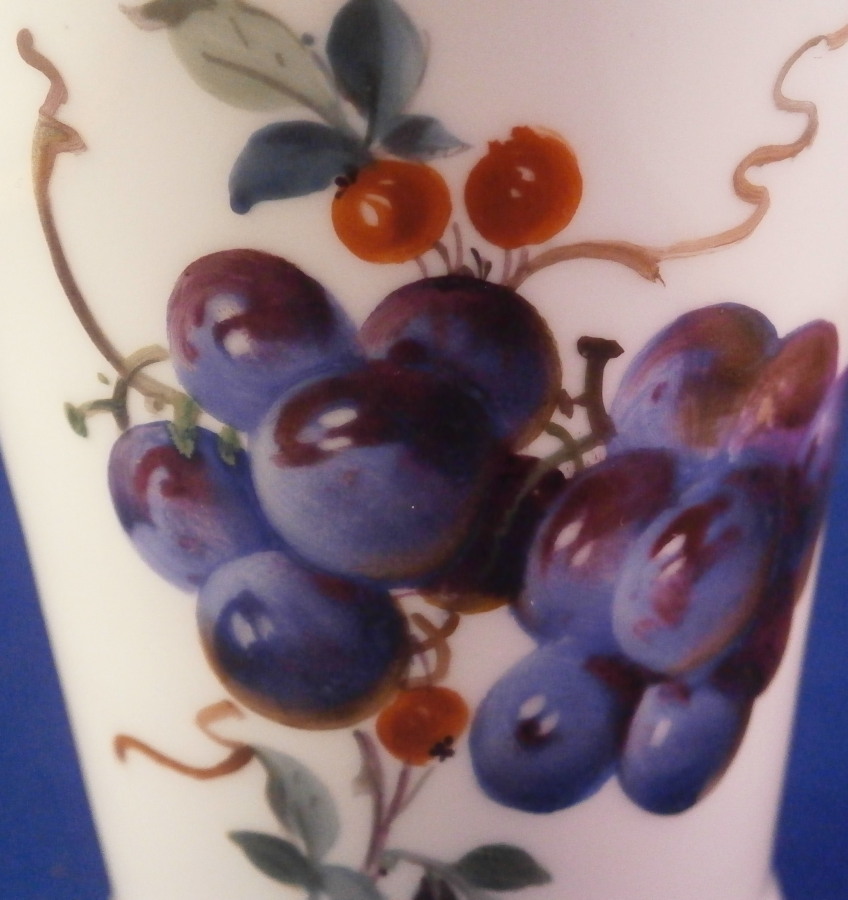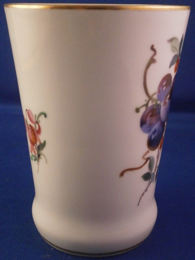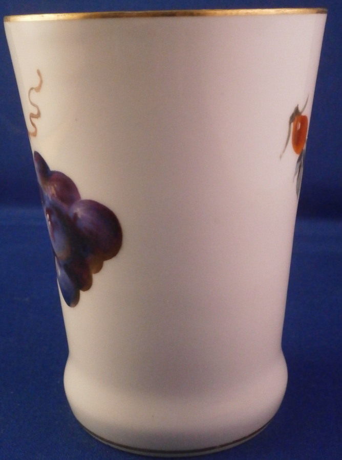 This is a rare drinking cup or tumbler made by Meissen during the Pfeiffer period. I have not come across this style and size before and if you jsut saw a picture you might confuse it with one of those little shot glasses they made but it is much larger. Perfect for drinking your next glass of wine in style - the closest you will get to a wine glass from Meissen :) The piece is hand painted with a nice bunch of purple grapes as well as some read berries and its leaves on the front and a small flower and red berry on the back. Gold trim to the top and bottom. The piece is in perfect condition with just a touch of wear to the gilding along the top. It is marked with the under glaze blue crossed swords mark (first choice) underneath as well as a painter's mark and the usual impressed marks as shown. The cup is 4 inch tall and just under 3 inches in diameter. Please email me for more information or other pictures.