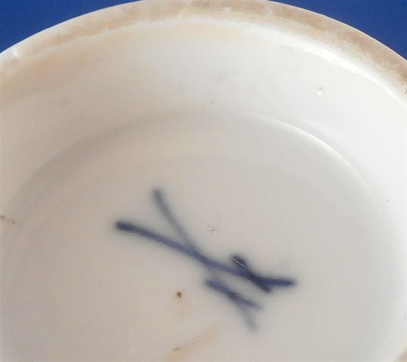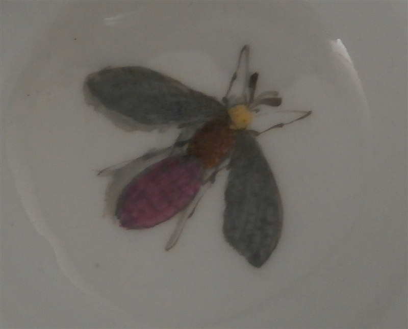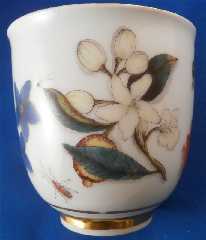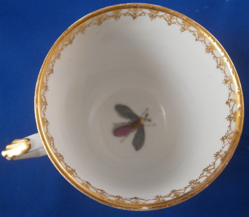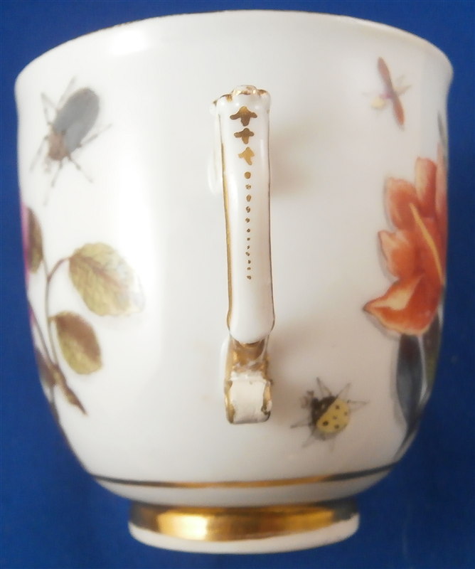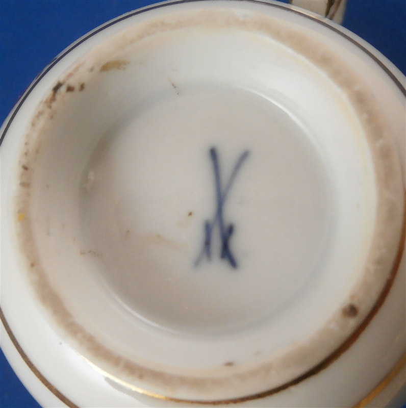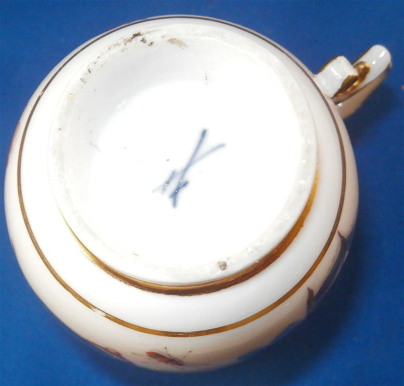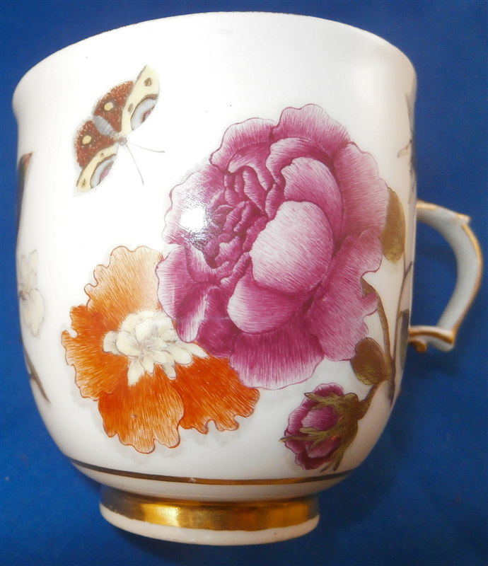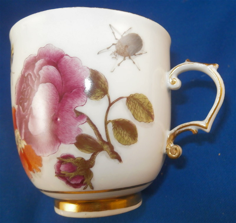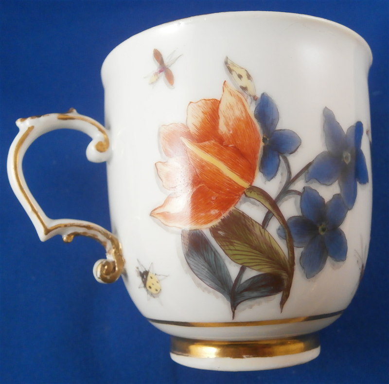 This is an amazing early cup made by Meissen in about 1735-45. It is handpainted with the nicest woodcut style flowers I have ever seen and not just one set but three different ones and these are not just the normal flowers but they each have their shadows a style attributed to Klinger though that has never been proven. If he did paint in this style this piece would definitely have been painted by him!! There are also some bugs in between the flowers which have their shadows as well. Great bug on the bottom inside. Nice handle shape as well as gold trim. About as decorative a piece as I have ever come across. The cup is marked with the straight blue crossed swords underneath as well as something impressed on the footringside itself though I cannot make it out. Might be a number which means it dates to around 1740-45 rather than a bit earlier or a bossierer's mark which would date it earlier maybe even before 1735. The piece is in great condition but sadly not perfect otherwise this would be the cup of the century :) The bottom end of the handle (that scroll looking thing) has been restored and that end of the handlel has a hairline to it but the top is fine so it was never! off. The cup is 2.75 inches tall and 2.75 inches in diameter. Please email me for more information or other pictures.
