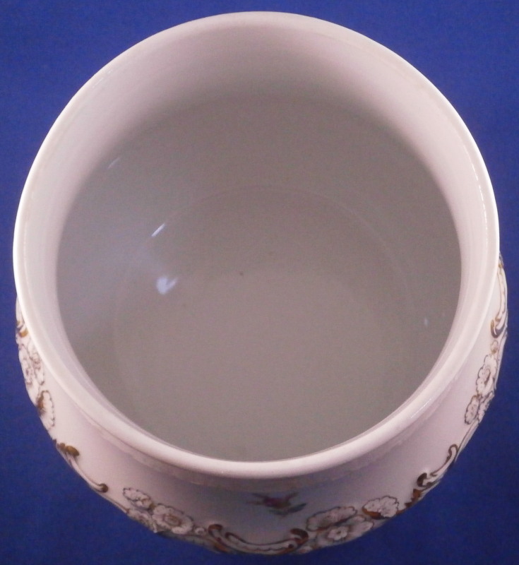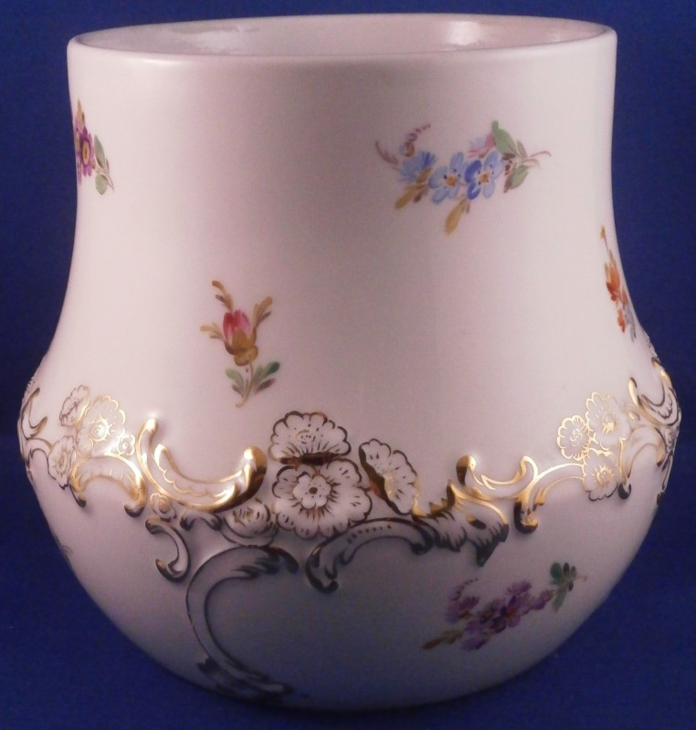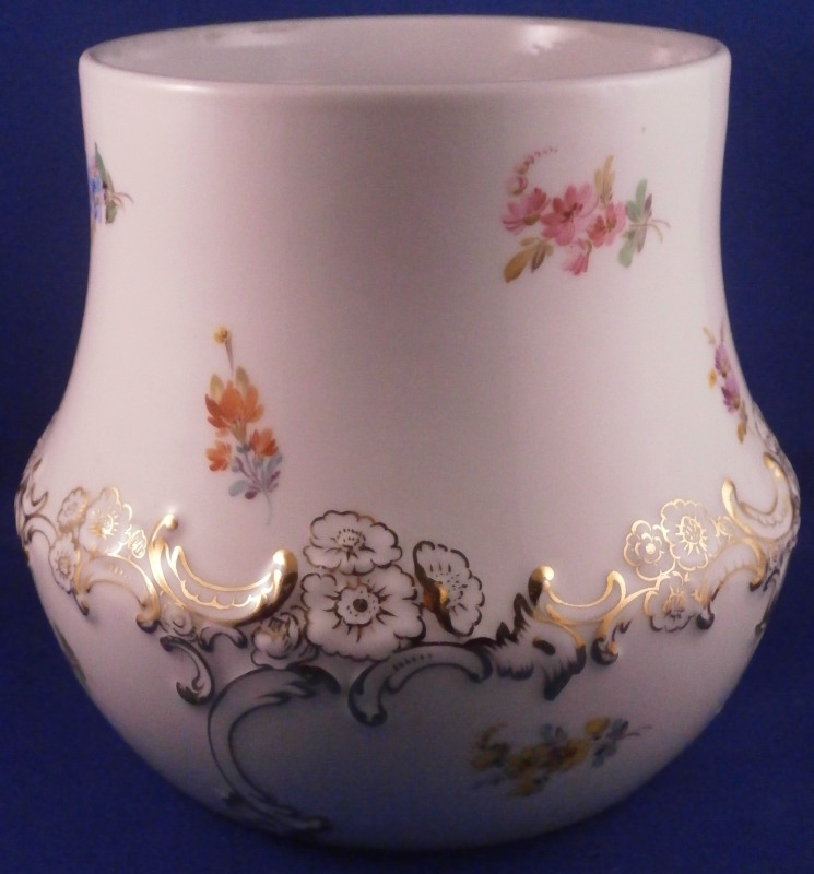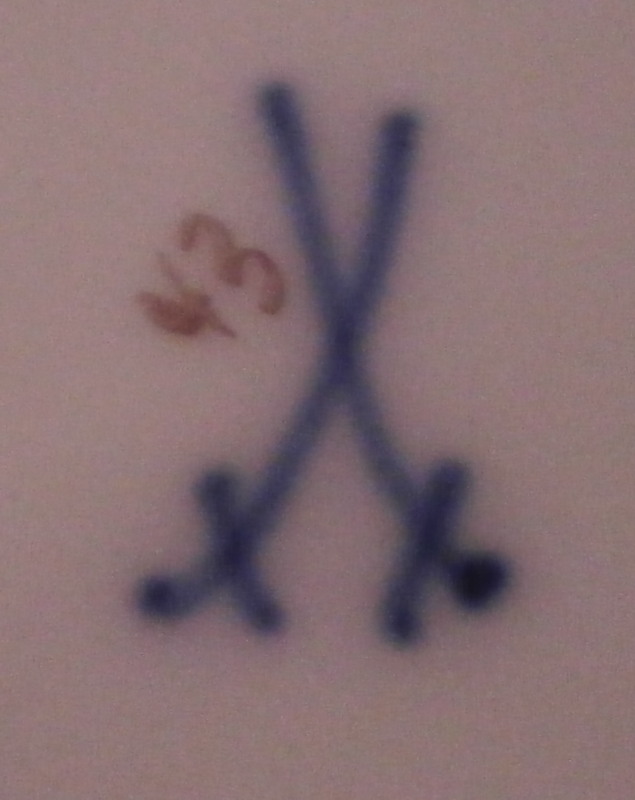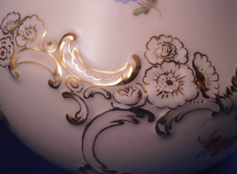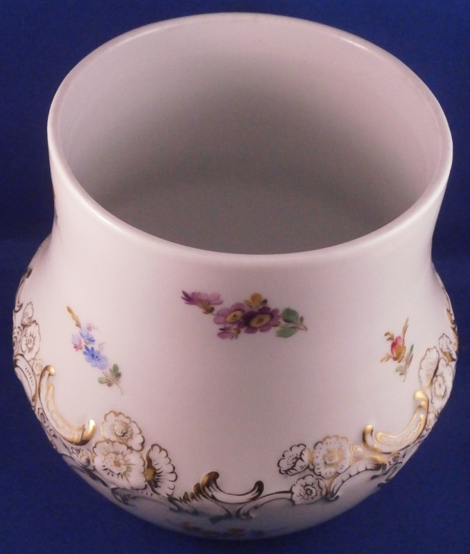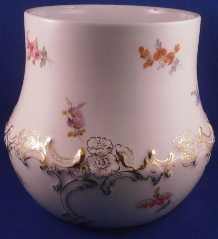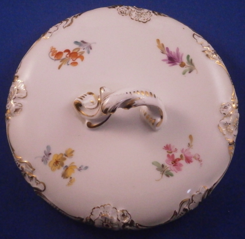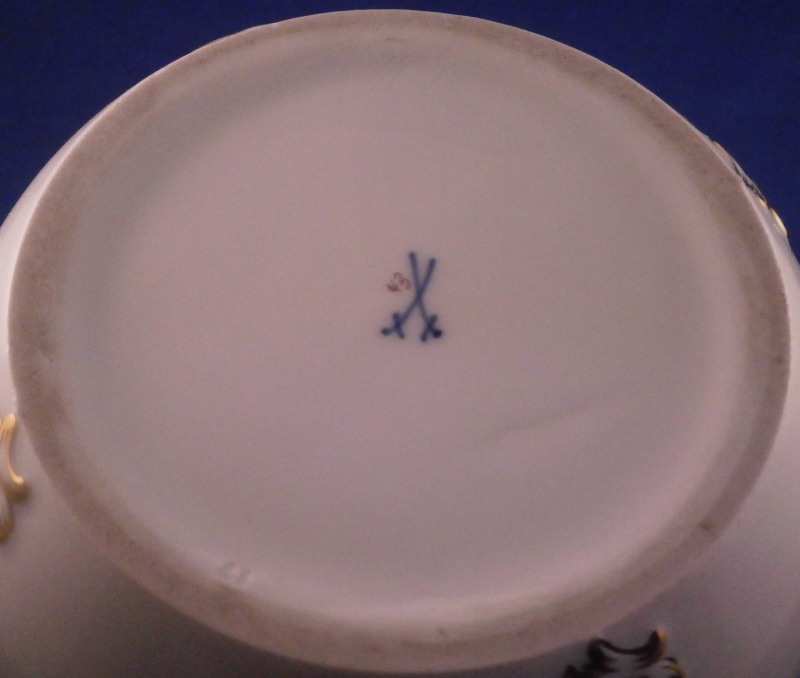 This is a hard to find cookie jar / biscuit barrel / lidded container made by Meissen in the late 19th century. It is from the B-Form service and hand painted with scattered single flowers with a really nice gold trim on a raised design. The gold flowers are especially nice. The handle on the lid has a nice shape to it and some gilding as well. These are not easy to find especially in good condition! The size is perfect to use for any number of purposes. The lidded jar is in perfect codition with a scratch or two and some light wear to the top edge where the lid sits which is normal. it displays perfectly. It is about 7 inches tall including the finial and has a diameter of about 6.25 inches tall. The main body is marked underneath with the under glaze blue crossed swords mark (first choice), a painter's mark 43 and an impressed number as shown. Please email me for more information or other pictures.