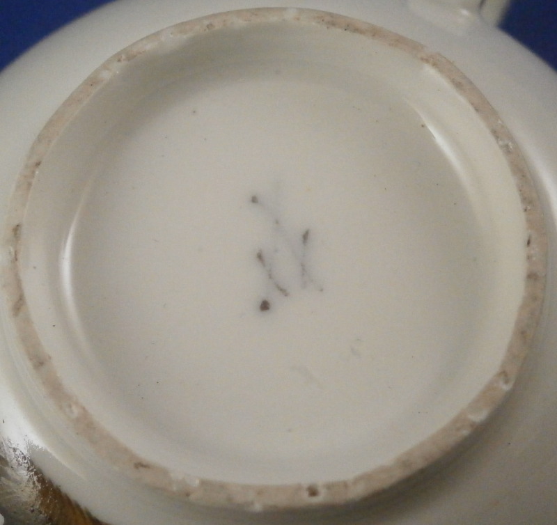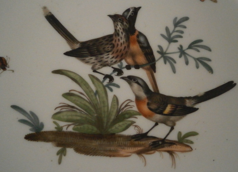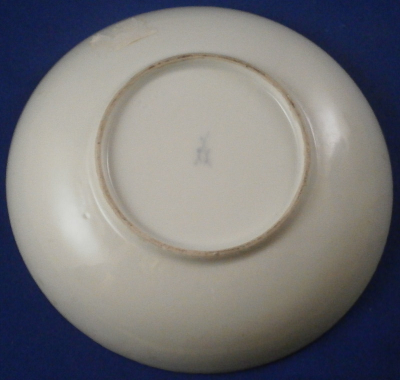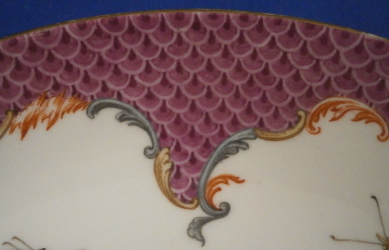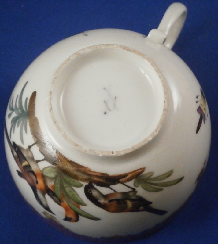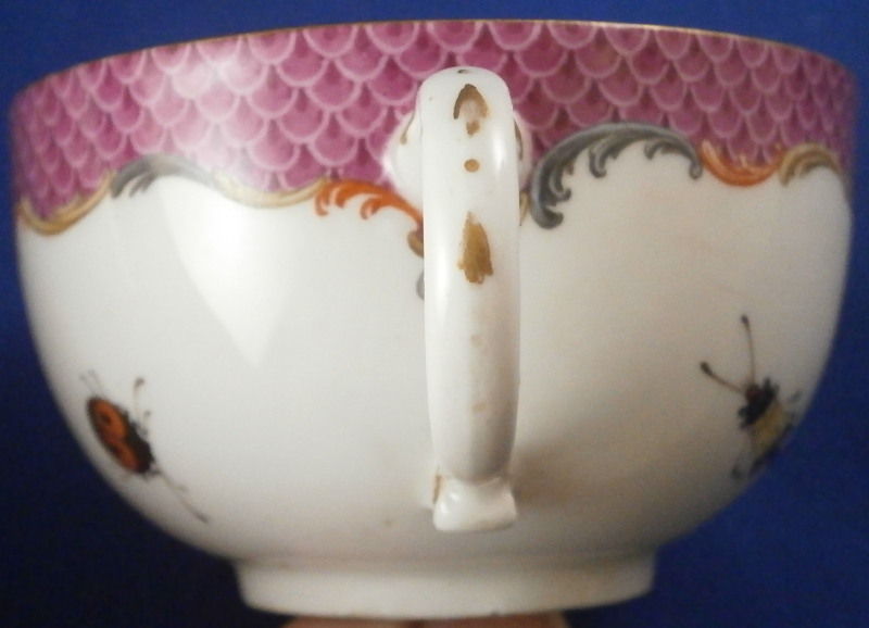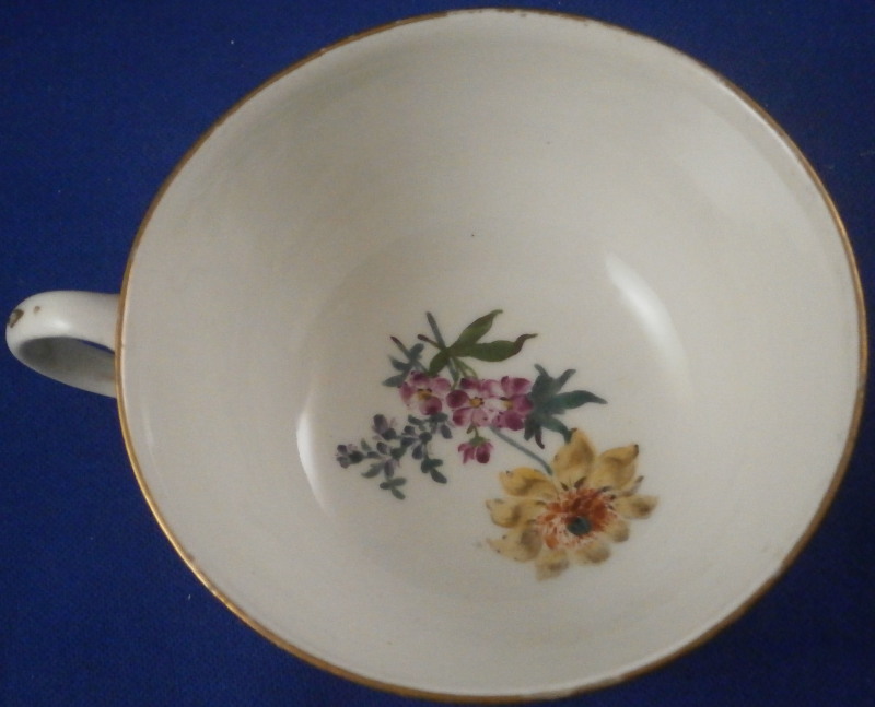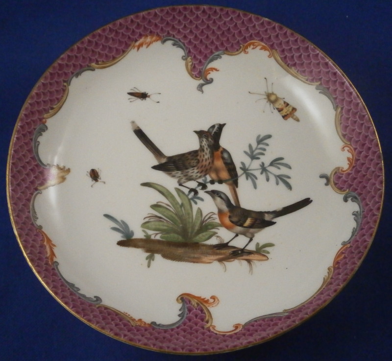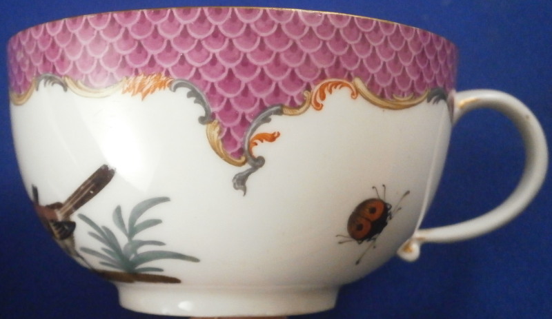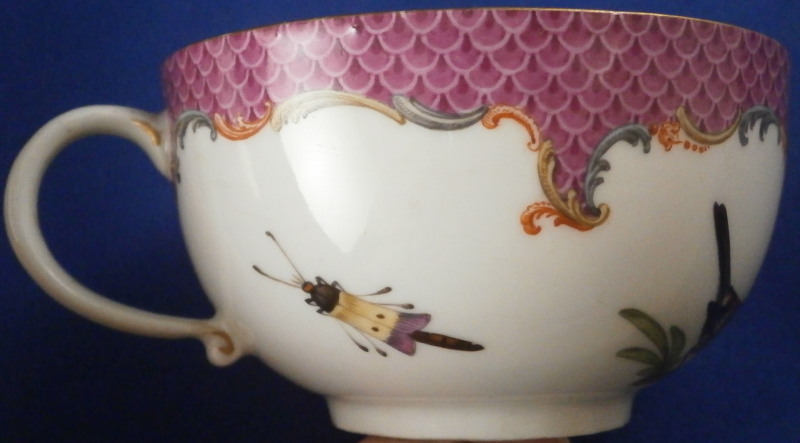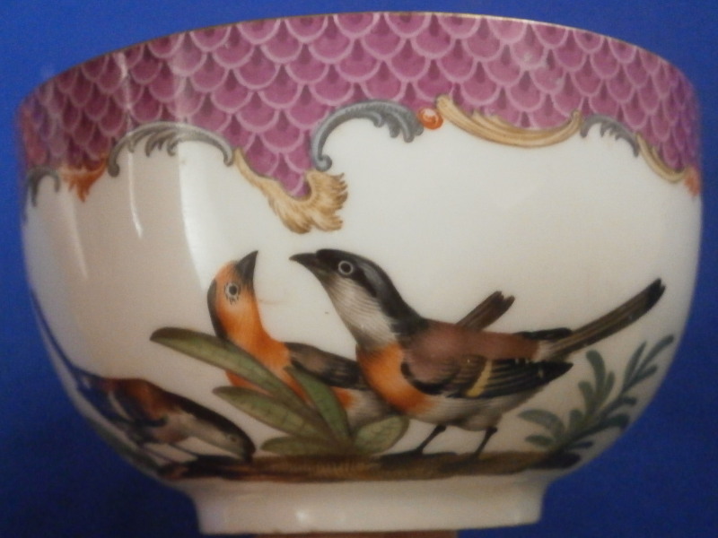 This is an amazing cup and saucer made by Meissen in about 1750. Both the cup and saucer have a hand painted large bird scene on them as well as a several small scattered insects. Nice floral arrangement in the bottom of the inside cup but my favorite part is the superb puce trim to the rim highlighted with a blue, orange and yellow scrollwork along the bottom edge. One of the best trims they had and with the quality of these scenes this would have been a top piece for this period and with that any period in the history of Meissen! The cup and saucer are in perfect condition with some very minor wear mostly to the gold trim along the edges and to two spots of the tails on the birds of the saucer. The saucer is about 1.125 inches tall and 5.25 inches in diameter. The cup is 1.75 inches tall and 3.125 inches in diameter. Both pieces are marked with the underglaze blue crossed swords mark with the dot between the bottom as well as the usual impressed number. Please email me for more information or other pictures.