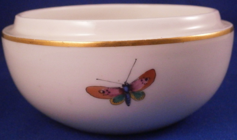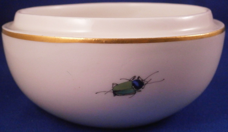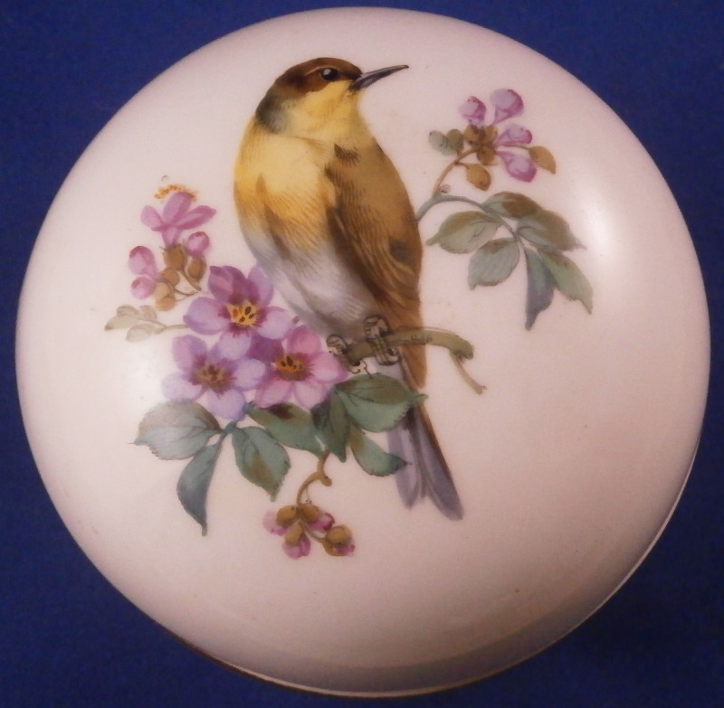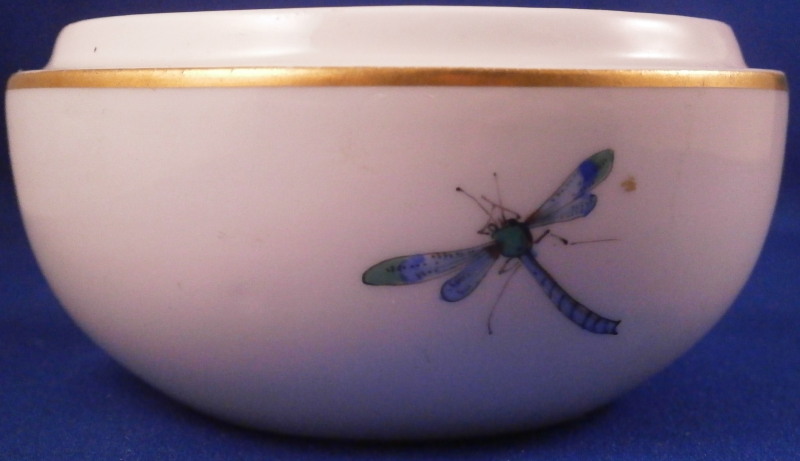 This is a nice lidded box made by Meissen in the 20th century. One finds the flower versions of the boxes fairly regularly but the scenic examples are much harder to come by! The piece here has a nice hand painted bird scene to the top including some flowers, a gold trim to the edges and three bugs along the side of the bottom. I especially like the dragon fly! A really nice little piece! The box is in great condition with just some very minor age realted marks and a stray gold spot near the dragon fly and an area to the inside that the glaze missed. It displays perfectly! The box is marked underneath with the under glaze blue swords mark as shown as well as the usual impressed marks. The bottom and lid together are 2.75 inches tall and 3.5 inches in diameter. Please email me for more information or other pictures.