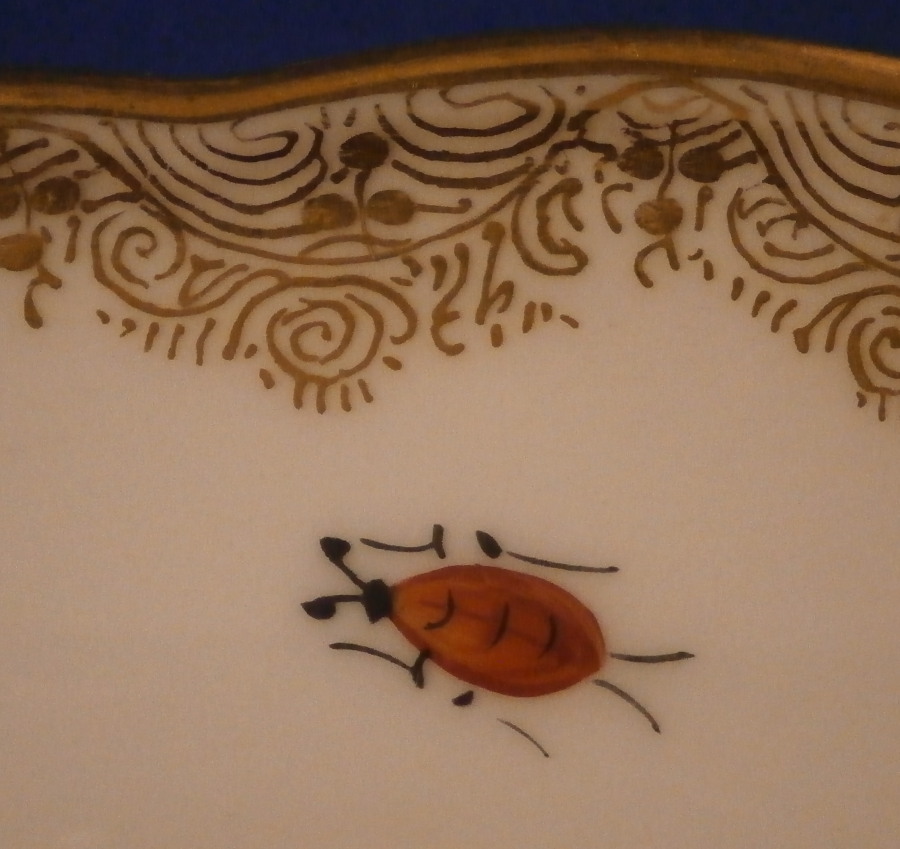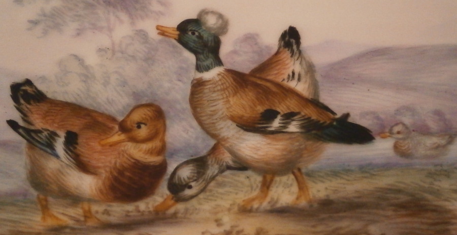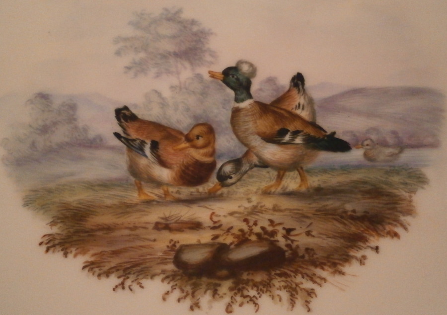 This is a great plate made by Meissen in the mid to late 19th century. It is hand painted with a superb duck scene in the center including three ducks in a nice landscape surrounding. The rim has one of their nicer fancy gold trims to it. This type of gold trim is more common on cobalt ground pieces they made. The edge is a bit wavy rather than just plain round which adds to the piece and there are five single bugs / insects painted along the rim. It looks stunning on display! The plate is marked with the under glaze blue crossed swords mark underneath as well as the usual impressed numbers. It is about 1.125 inches tall and 8.25 inches in diameter. It is in perfect condition. Please email me for more information or other pictures.