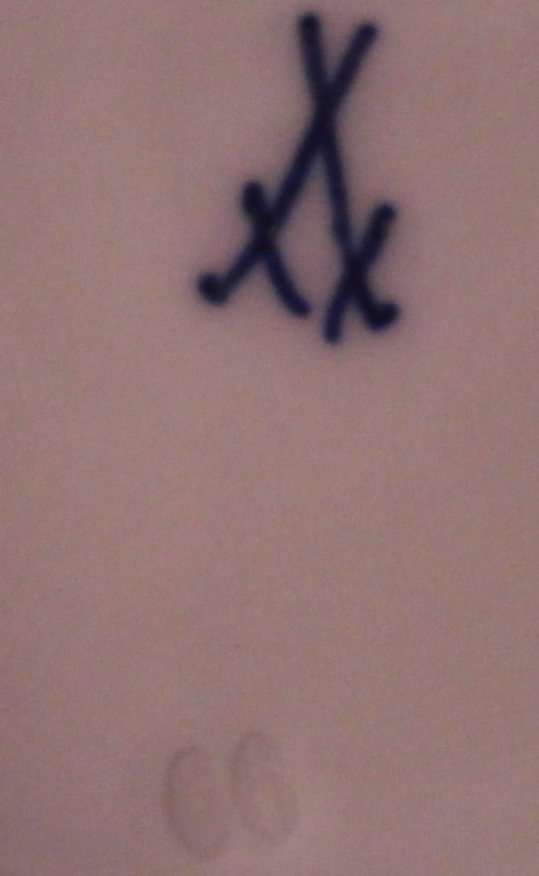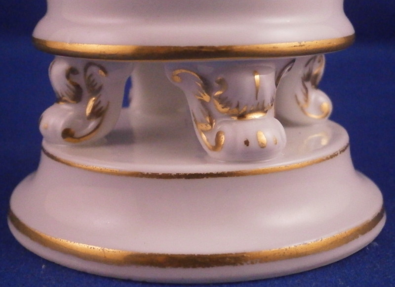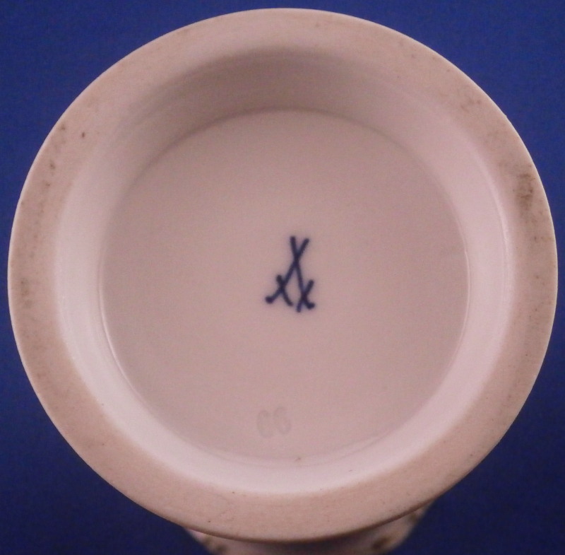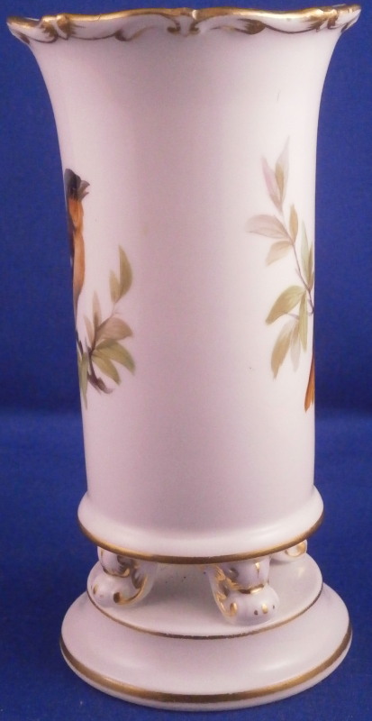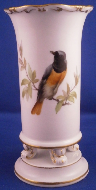 This is a really nice bird scene vase made by Meissen in the 19th century. It is hand painted with a superb bird scene to the front as well as the back with a bird sitting on a tree branch with its leaves in both scenes. The vase has a really nice shape to it with the main body sitting on four feet that sit on a round base. The top edge has a nice shape to it as well. Some well placed gold trim make this a very elegant piece! A really a stunning vase with two scenes that are superb! The piece is marked to the bottom with the under glaze blue crossed swords with the pronounced hilts mark in blue as well as an impressed number as shown. The vase is 5.5 inches tall and 2.875 inches in diameter. It is in great condition with a tiny gilded over chip to the top edge and some minor wear to the gilding. Please email me for more information or other pictures.