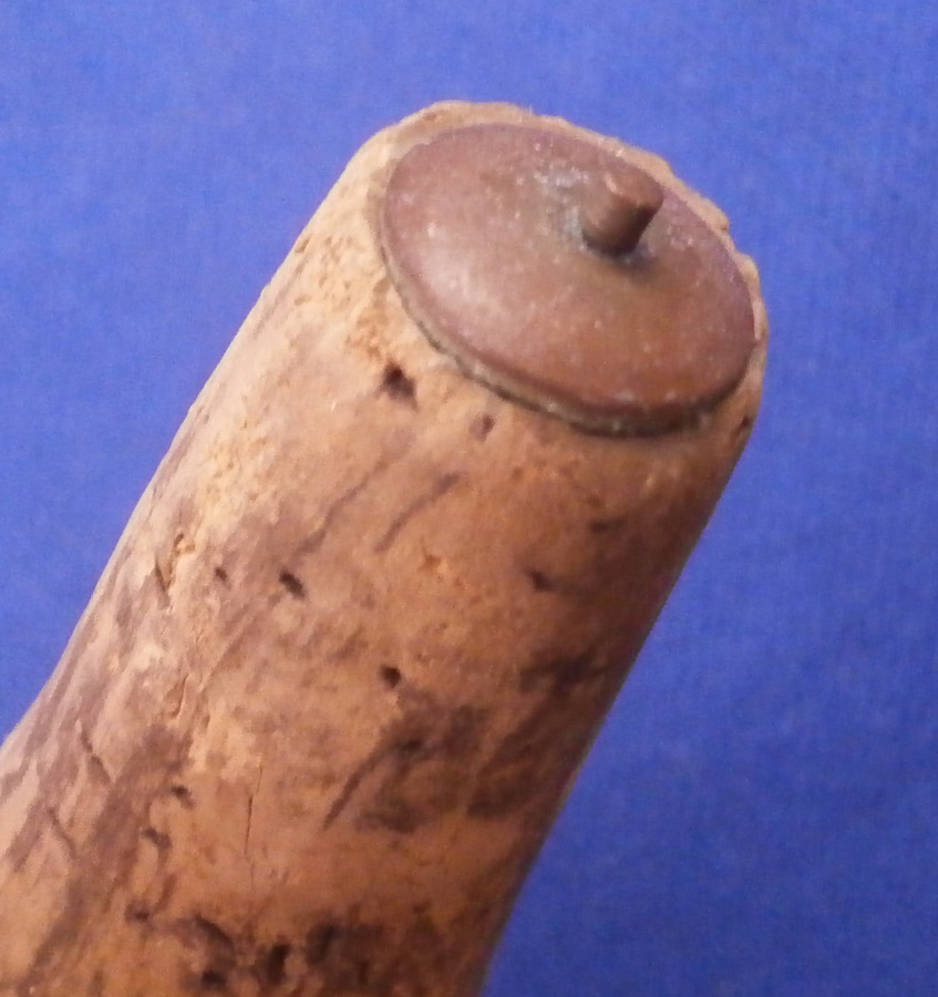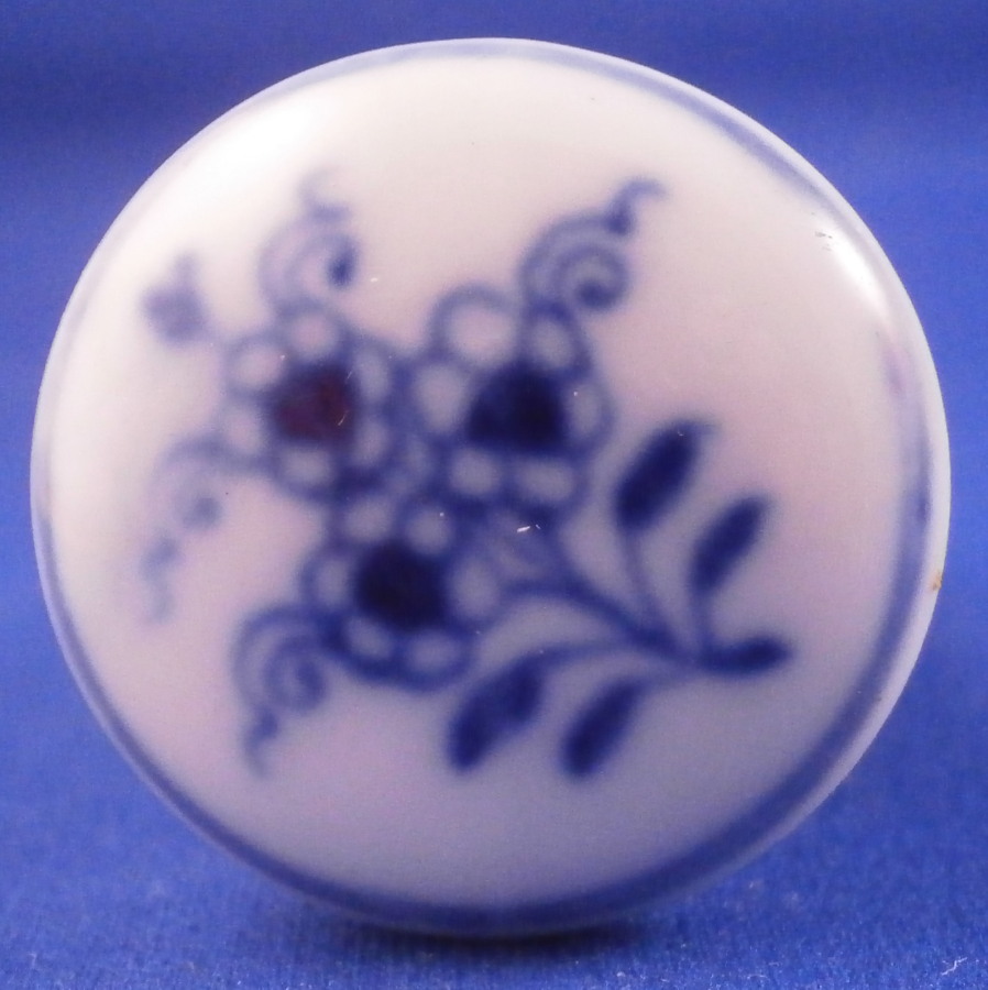 This is a bottle stopper made by Meissen in the mid to late 19th century. It is a simple form with a blue strawflowers / blue onion type design to the top and a bit of blue line trim. Simple but very elegant and it would go very well with any blue and white collection - strawflower or blue onion! The cork is attached with a metal rod stuck inside the porcelain and a metal plate at the bottom screws onot the rod. This one does not unsrwe and come apart so I cannot access the mark but since it's mate did come apart and was marked with the crossed swords I know they are made by Meissen. It's hard to find blue and white stoppers so it is a nice find! The cork is old and was used and has dried out but it is in decent shape and can be used as is. It's in better shape than the one on the other piece! The porcelain part and metal parts are all in perfect shape. The entire piece is 2.875 inches tall. The cork is 1.875 inches long and the porcelain top is 1.125 inches in diameter and 0.875 inches tall. Please email me for more information or other pictures.