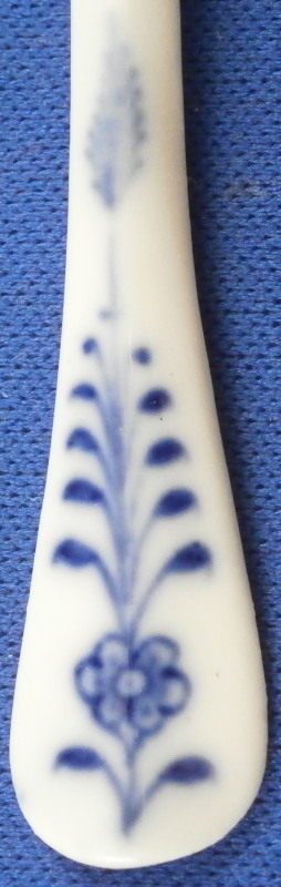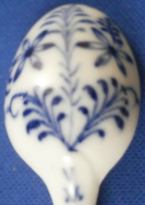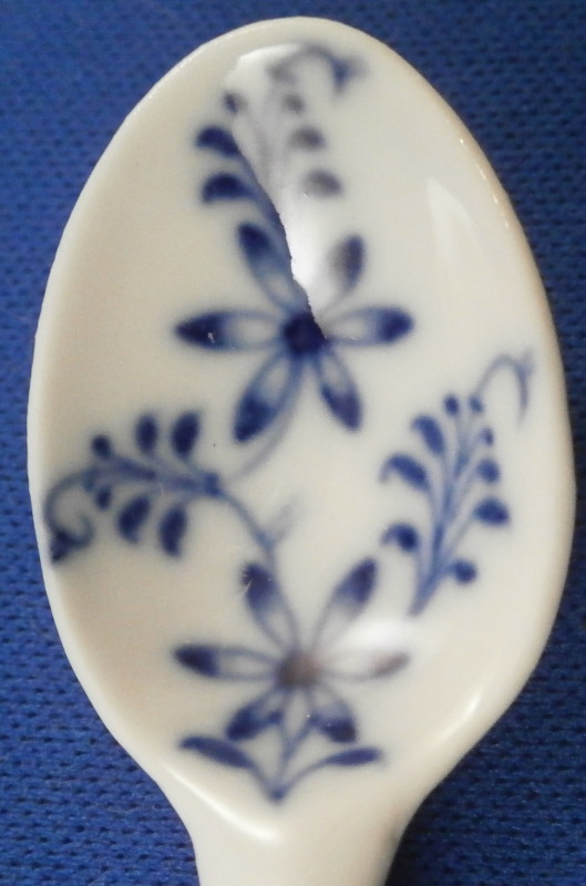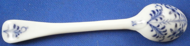 This is a small and rare treat - a blue and white tea spoon made by Meissen in the 19th century. I have owned and seen a few tea spoons over the years but never a blue and white ones like this. I cannot quite figure out if this was meant to be in the blue onion or the strawflower design but either way it is superbly hand painted with a nice floral design to the front as well as the back of both the bowl part and the end of the stem as shown. Marked underneath where the bowl and the handle meet with the under glaze blue crossed swords mark as shown. First quality. It is in perfect condition. The piece is 4.125 inches long with the bowl part being 1.25 inches long, 0.875 inches wide and 0.375 inches deep. Please email me for more information or other pictures.