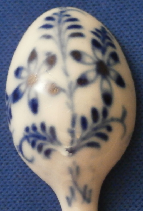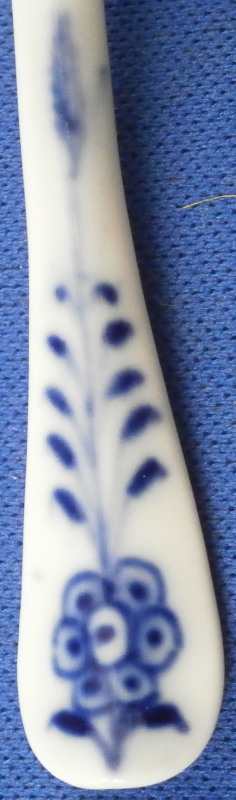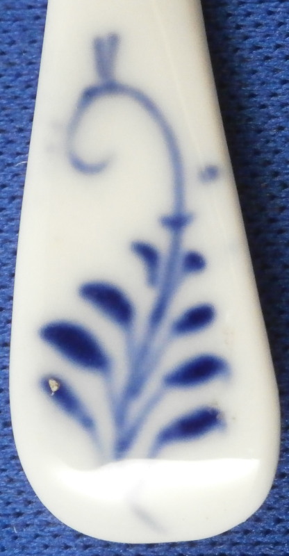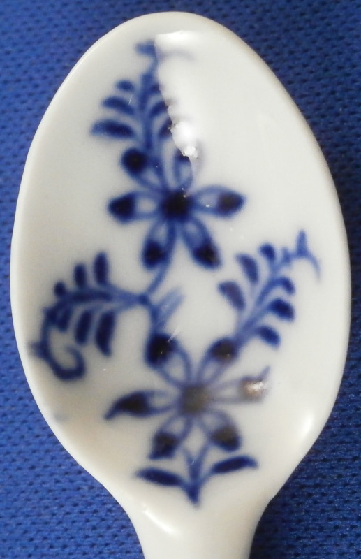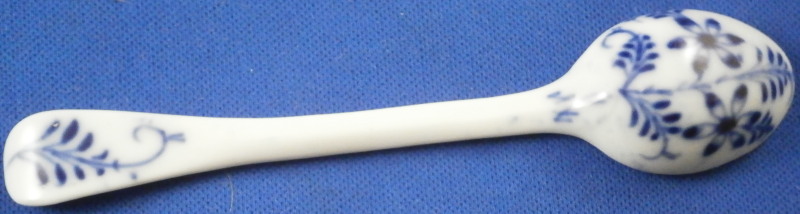 This is a small and rare treat - a blue and white tea spoon made by Meissen in the 19th century. I have owned and seen a few tea spoons over the years but never a blue and white ones like this. I cannot quite figure out if this was meant to be in the blue onion or the strawflower design but either way it is superbly hand painted with a nice floral design to the front as well as the back of both the bowl part and the end of the stem as shown. Marked underneath where the bowl and the handle meet with the under glaze blue crossed swords mark as shown. First quality. It is in perfect condition. The piece is 4 inches long with the bowl part being 1.125 inches long, 0.875 inches wide and 0.375 inches deep. Please email me for more information or other pictures.