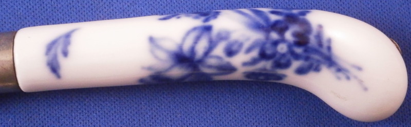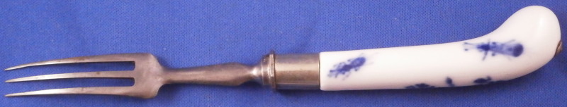 This is a nice porcelain handled fork made by Meissen in the 19th century or maybe even earlier. It has the hole at the end of the handle where the metal fork part goes through the porcelain and comes out at the end. These were not made that way in the newer versions. Sadly the tines are probably not original anymore but were replaced.The porcelain is hand painted with their under glaze blue floral and insect design one sees fairly often on plates and such but not often on silverware. It includes a nice floral arrangment as well as small single flower and two bugs. The mark would be where the ferrule sits between the blade and the porcelain but it is secured well and won't budge and I am not playing with it to get to the mark. The forks is in great condition with just a small flaw to the bottom end of the porcelain from when it was made - it is tiny but can be seen in the second picture if you really look hard enough underneath the bottom end of the flower stems. It's a glaze miss which is not that rare on early pieces. The whole thing is about 7 inches long with the porcelain being about 3 inches long. Please email me for more information or other pictures.