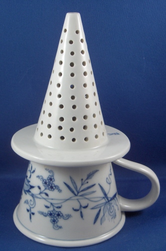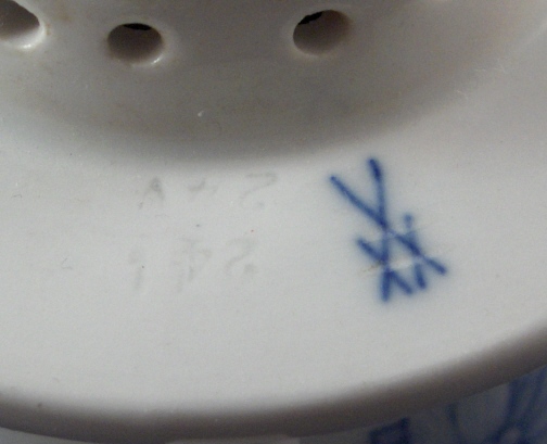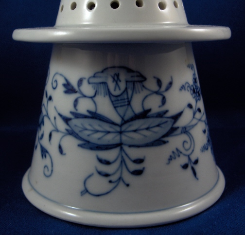 This is a bit of something different than the usual Meissen one sees. It is actually something meant to be used in the kitchen. A strainer/funnel handpainted with the blue onion pattern all around the top part. It dates to the 20th century and is in superb condition. Marked with the underglaze blue crossed swords under the rim in the center with two slashes through it. There are two spots on the handle where the glaze didn't take perfectly and thus the second quality mark. Also impressed numbers next to the mark. The funnel is 6.5 inches tall and has a top outer diameter of 3.625 inches. The center ring is about 3.5 inches in diameter and the pierced part is 3.5 inches tall. Please email me for more information or other pictures.