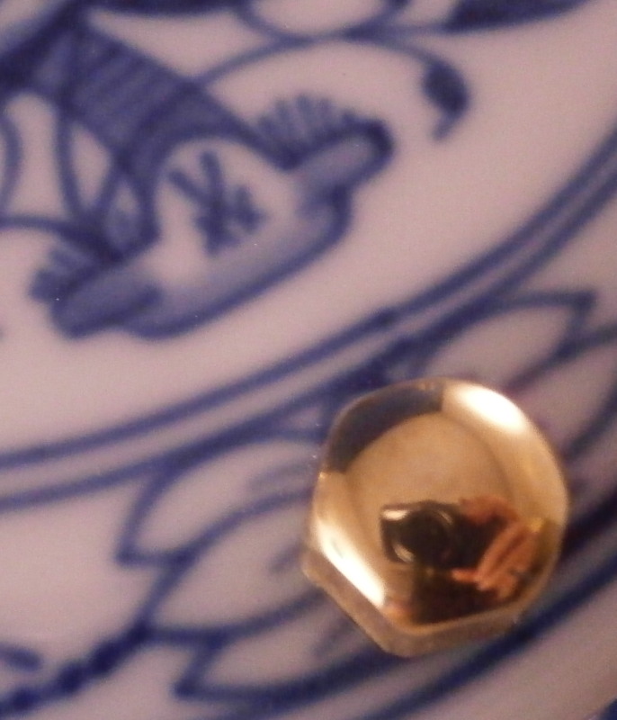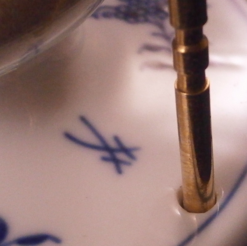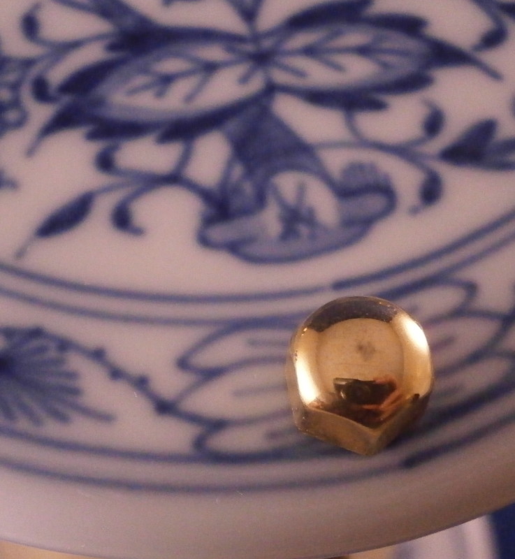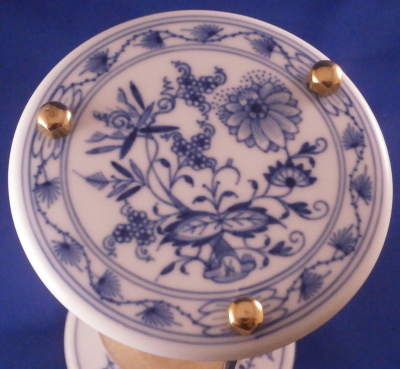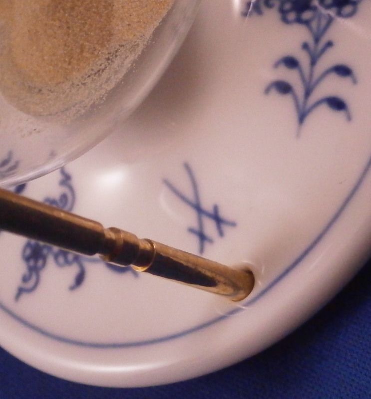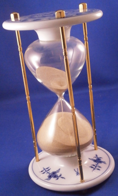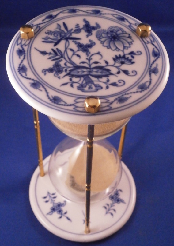 This is a very rare treat - an hour glass made by Meissen in the 20th century. I have never come across one until I recently bought two of which one sold right away. So here is one last chance to get this rare piece! The hour glass is made up of two porcelain circular discs decorated in ther famous blue onion / Zwiebelmuster design with the hour glass center being made of glass with plastic rings between the glass and the porcelain to protect it. Everything is held together by three brass (I think) columns with nice nuts at the ends. A bit of a decoration was cut into the brass to make it more elegant. Just an amazing and fun piece and a definite must have for the collector of Meissen Blue Onion pieces or hour glasses for that matter. A very delicate and elegant piece! It is in perfect condition with some oxidation on top of one of the metal nuts where it was rubbed a bit from use. Each of the porcelain pieces is marked in the "stalk" of the onion as well as on the other side near one of the brass pieces as shown. The entire piece is 7 inches tall has a diameter of 3.875 inches. Please email me for more information or other pictures.