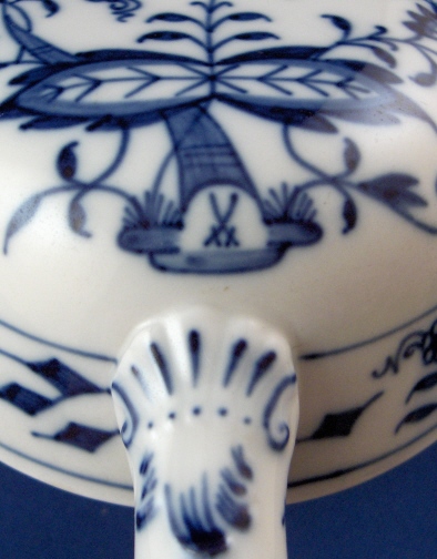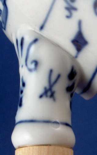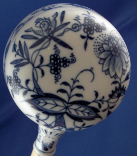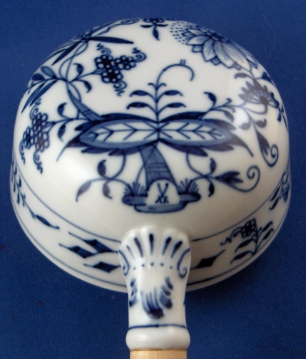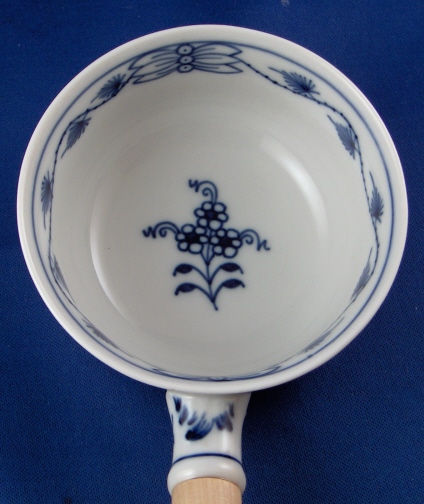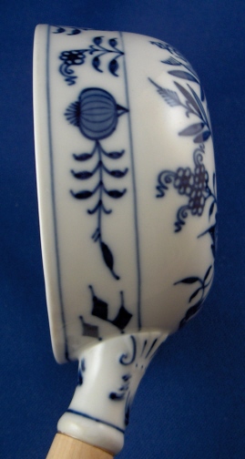 This is a nice large ladle with its wooden handle made by Meissen in the 20th century (I think). It is handpainted with the famous Blue Onion design in underglaze blue which looks really nice here! The wooden handle has a nice shape to it and a string at the end to be able to hang it in your kitchen :) The ladle is in perfect condition. It is 1.625 inches deep and 3.625 inches in diameter. The wooden part is 9 inches long. The porcelain is marked twice with the underglaze crossed swords mark - once in the design in the bottom of the stem and once where it attaches to the wooden handle. Please email me for more information or other pictures.