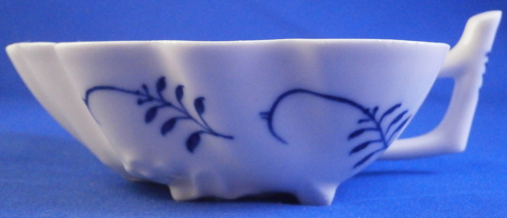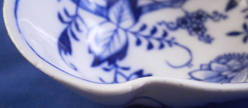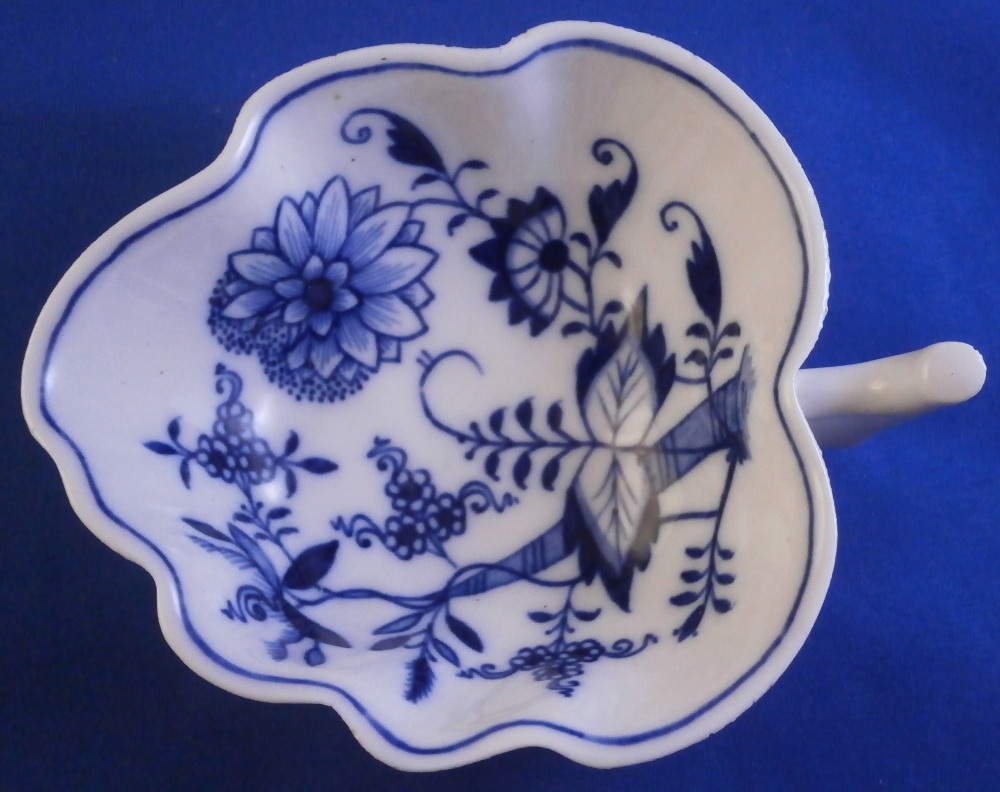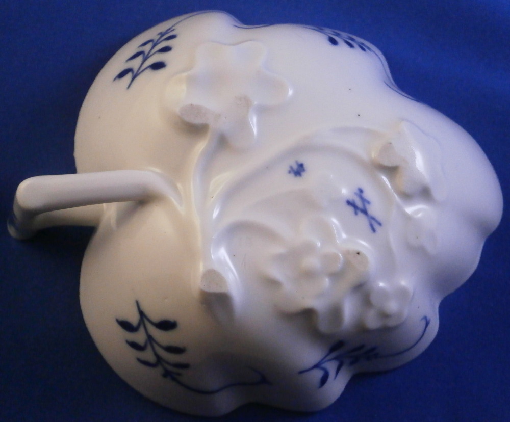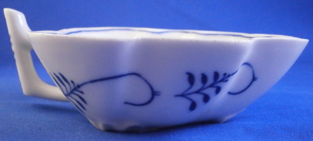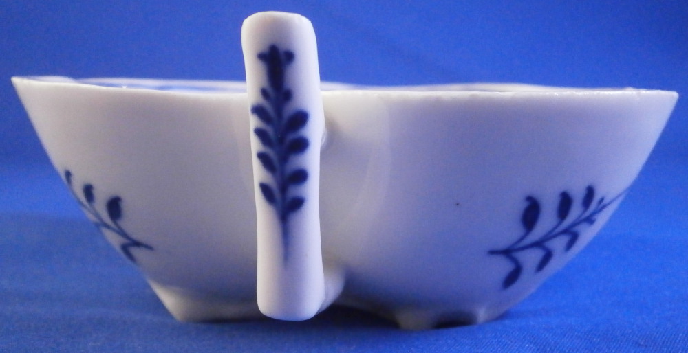 This is a leaf shaped dish made by Meissen in the 19th century before they added the crossed swords to the bottom of the stalk part of the decoration. Could be used as a pickle dish or to serve sorbet or anything else for that matter. The piece is decorated with thir famous blue onion design to the inside with four blue designs to the outside and a molded design of leaves and flowers to the udnerside. Handle attached to the outside. The dish is in great condition and displays perfectly but the entire edge is rough like something went wrong during the firing process and there are tiny chips and I mean tiny. Probably why it was deemed a second choice piece! But when sitting there you cannot tell at all. The dish is marked underneath with the under glaze blue crossed swords (two cuts across them denoting it being a second choice piece) as well as a blue painter's number and a impressed number 15 as shown. The dish is 1.5 inches tall plus the handle which sticks up a bit, 4.75 inches wide (including the handle) and just under 4 inches deep. Please email me for more information or other pictures.