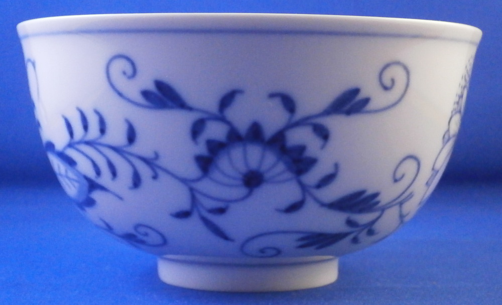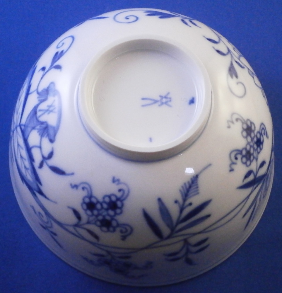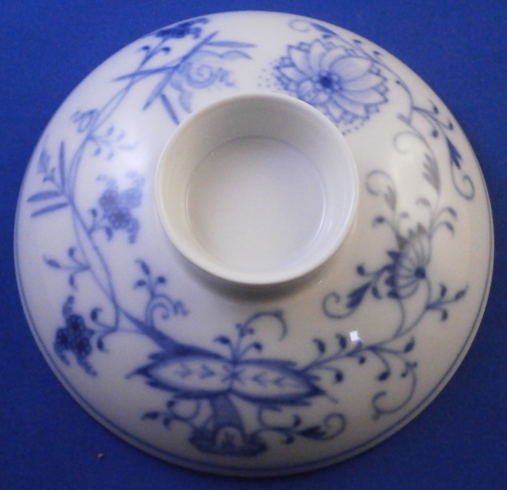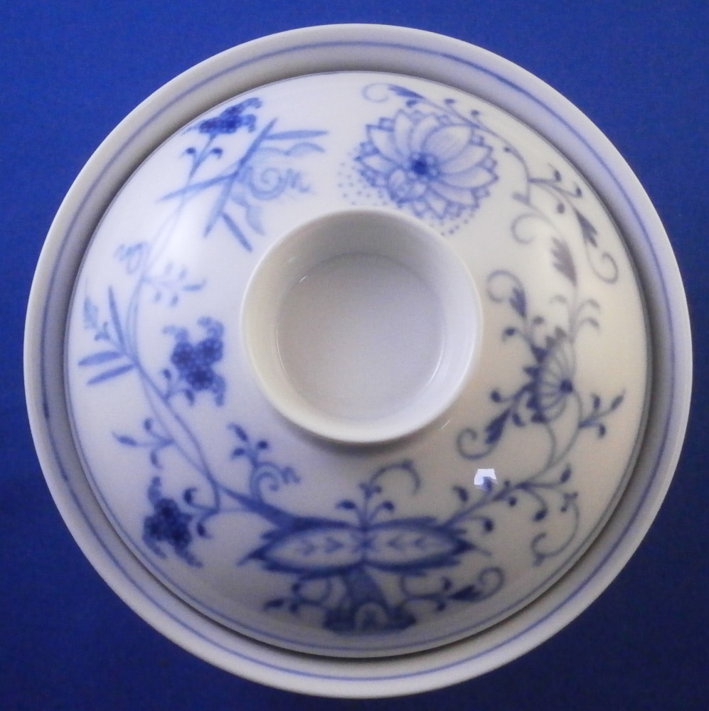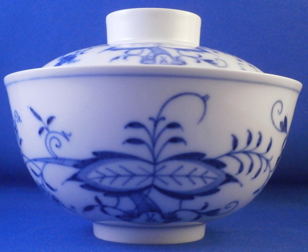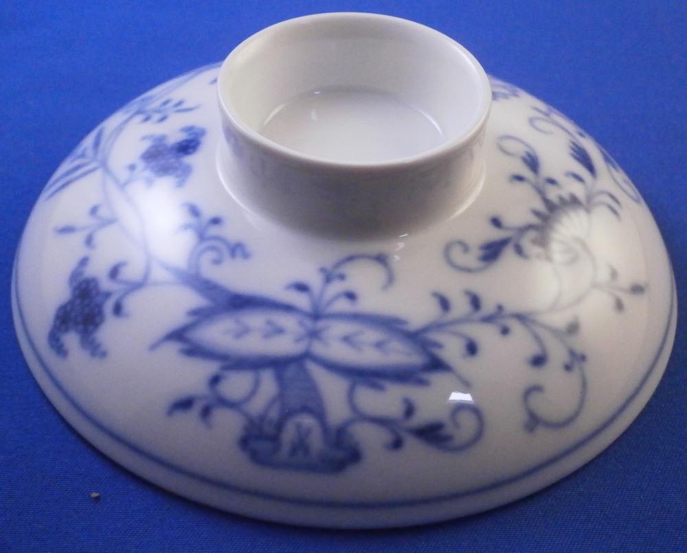 This is a very hard to find piece of blue onion - a rice bowl with its lid made by Meissen in the 20th century. Both pieces are decorated with their famous Zwiebelmuster design in under glaze blue. The mortar all around the outside with a bit of a blue trim to the inside rim and brass mounts to the ends of the handles. The pestle is decorated all around as well as the top. Really a nice looking set and one the kitchen or pharmaceutical / chemist blue onion collector won't find again anytime soon. Both pieces are marked with the under glaze blue crossed swords mark, the mortar on the underside as well as in the "onion" stalk and the pestle on top as well as in the "onion" stalk. The mortar also has the usual impressed marks one finds on Meissen of this period as shown. The mortar is just over 3.5 inches tall with a top diameter of 4.625 inches. The handles stick out about an inch from there. The pestle is 5.5 inches long and 1.625 inches in diameter at the widest part. Both are in perfect condition. Please email me for more information or other pictures.