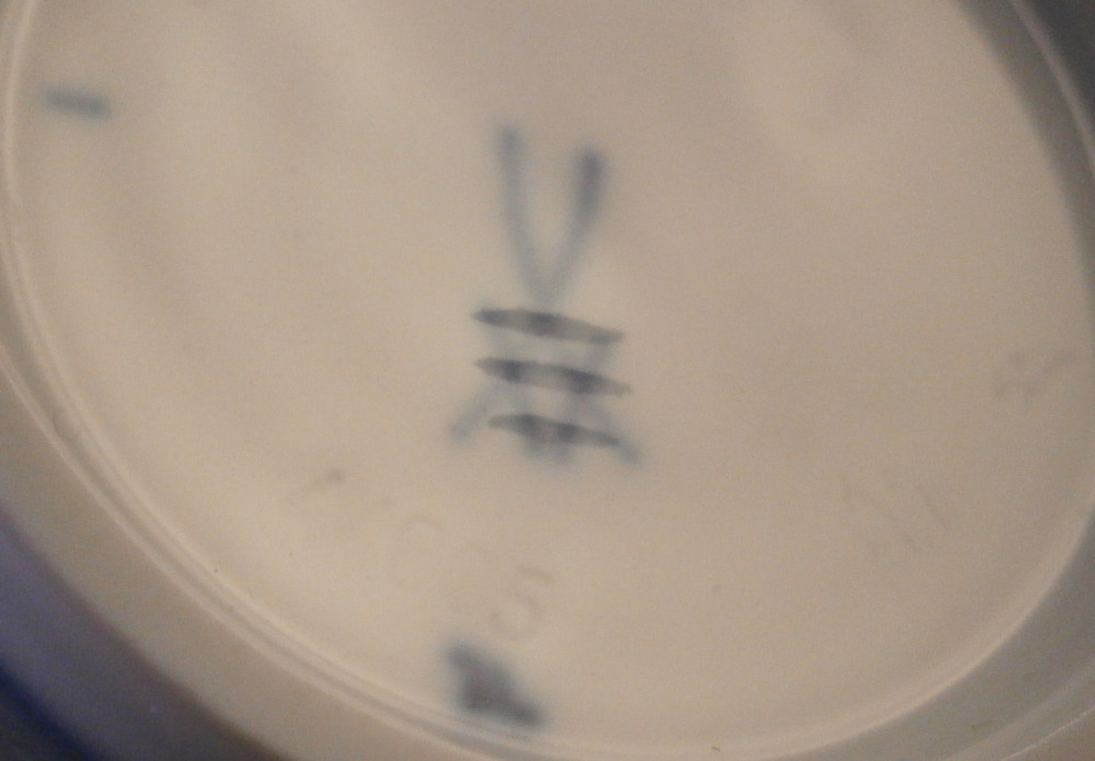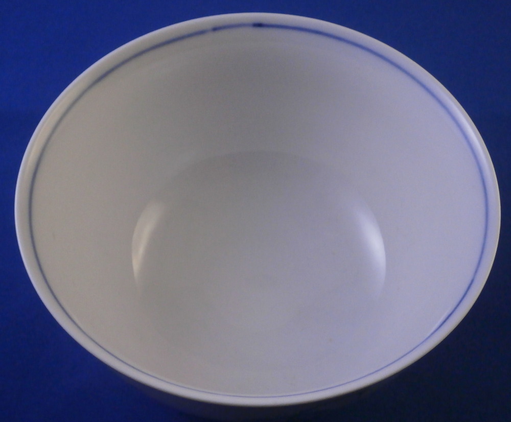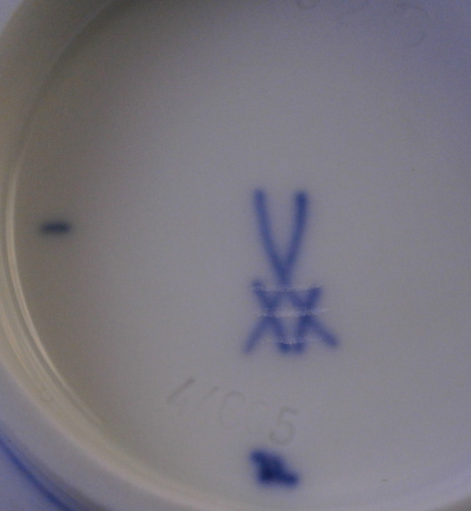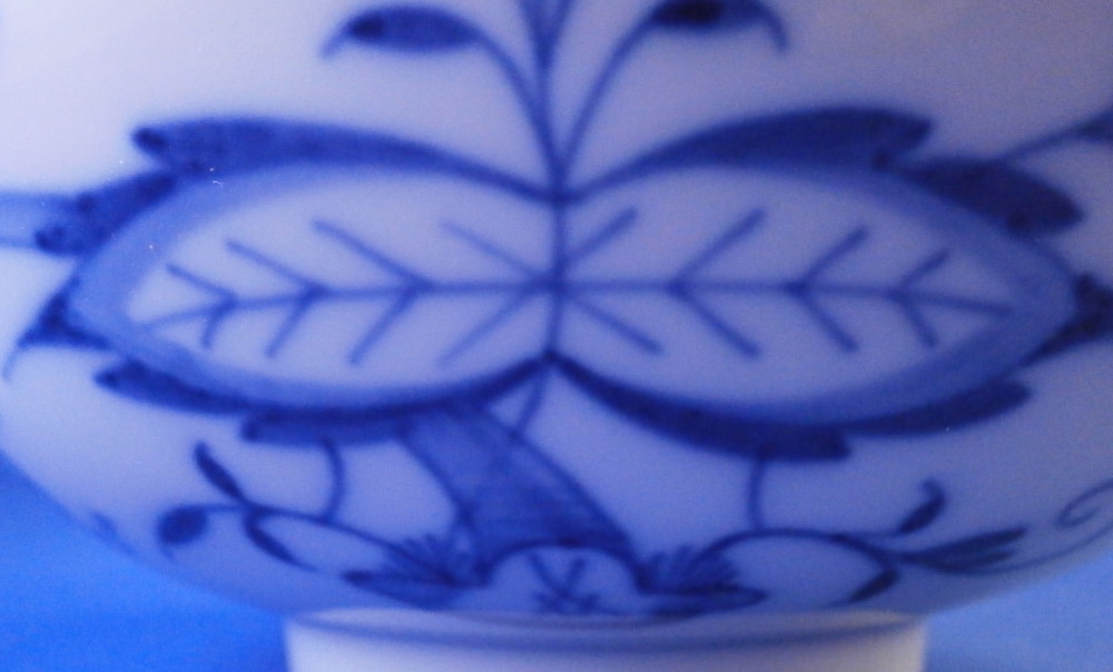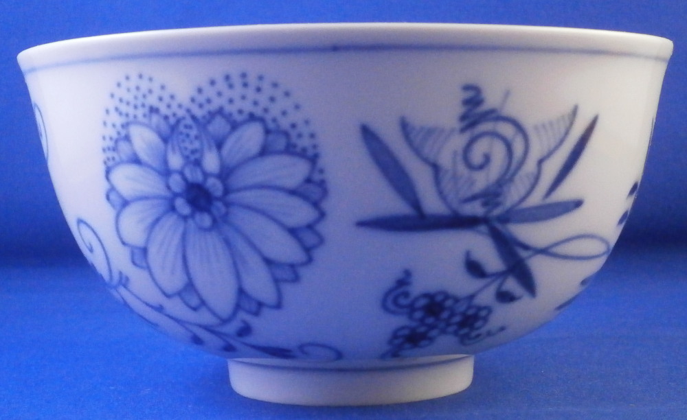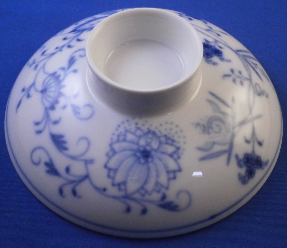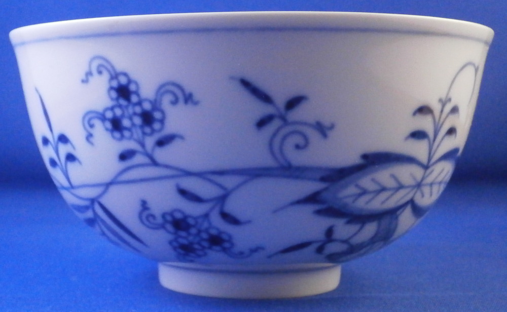 This is a very hard to find piece of blue onion - a rice bowl with its lid made by Meissen in the 20th century. Both pieces are decorated with their famous Zwiebelmuster design in under glaze blue. The mortar all around the outside with a bit of a blue trim to the inside rim and brass mounts to the ends of the handles. The pestle is decorated all around as well as the top. Really a nice looking set and one the kitchen or pharmaceutical / chemist blue onion collector won't find again anytime soon. Both pieces are marked with the under glaze blue crossed swords mark, the mortar on the underside as well as in the "onion" stalk and the pestle on top as well as in the "onion" stalk. The mortar also has the usual impressed marks one finds on Meissen of this period as shown. The mortar is just over 3.5 inches tall with a top diameter of 4.625 inches. The handles stick out about an inch from there. The pestle is 5.5 inches long and 1.625 inches in diameter at the widest part. Both are in perfect condition. Please email me for more information or other pictures.