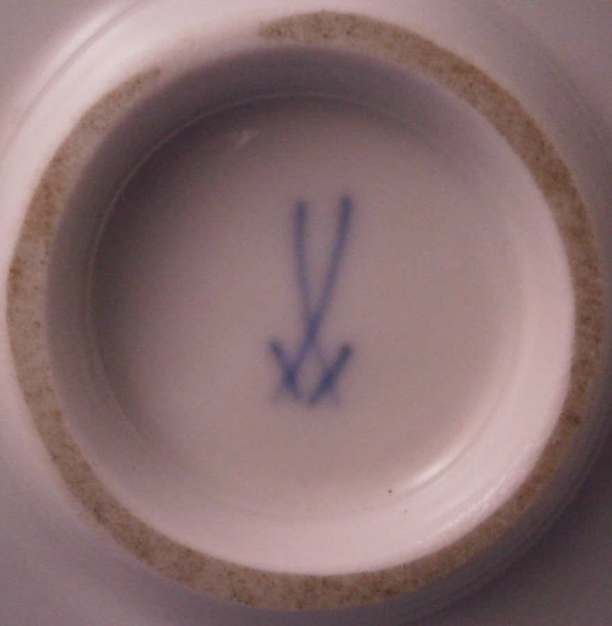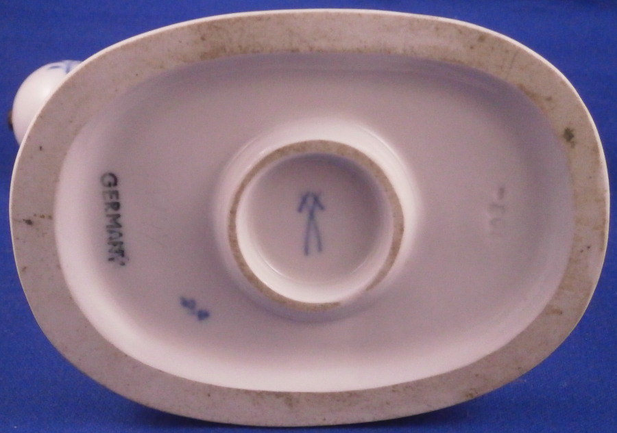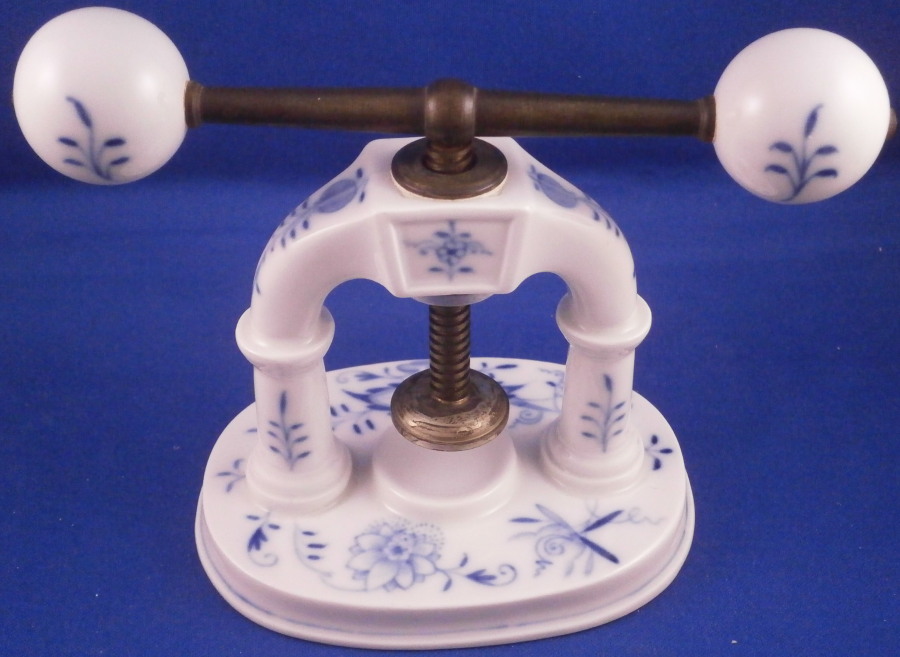 This is the one of those rare items made by Meissen in the early 20th century - a nutcracker. Nutcrackers are rather rare to begin with in this style but the Meissen ones are almost impossible to find and I have only owned one other blue onion decorated one before this one. The piece is decorated with their famous Blue Onion / Zwiebelmuster design all around with the tiny crossed swords in the bottom of the stalk. The round handles to either end of the metal top piece have a little bit of a blue design on them as well. The piece is in superb condition with some oxidation to the metal parts. The mechanics are very smooth which is typical of their nutcrackers - much nicer than the cheaper versions! The piece is about 4.625 inches tall (when screwed down all the way), 6.25 inches wide including the handles and 3.25 inches deep. It is marked underneath with the underglaze blue crossed swords mark (first choice!), a blue painter's mark 84. and the usual impressed / incised marks as shown and GERMANY. A really nice piece! Please email me for more information or other pictures.
