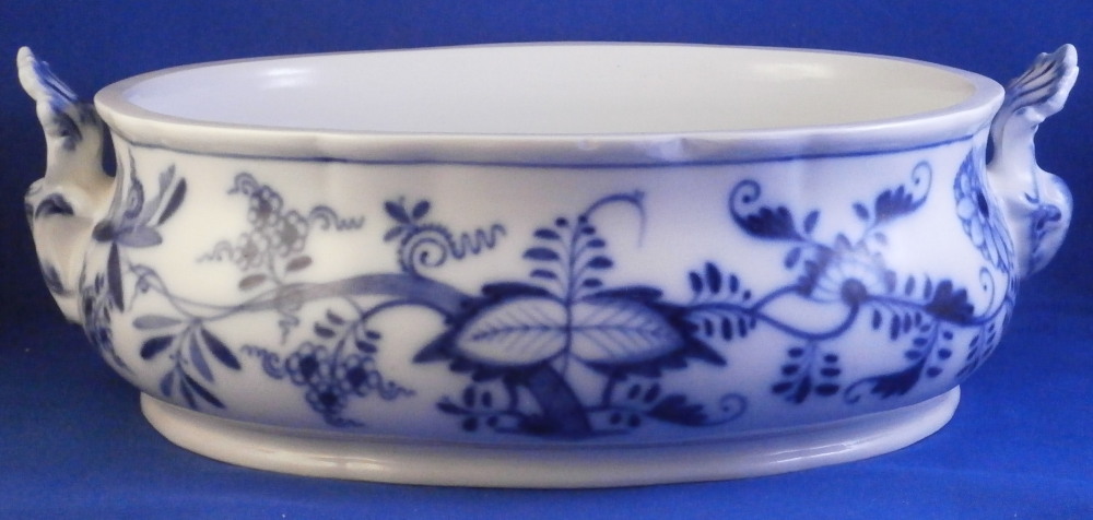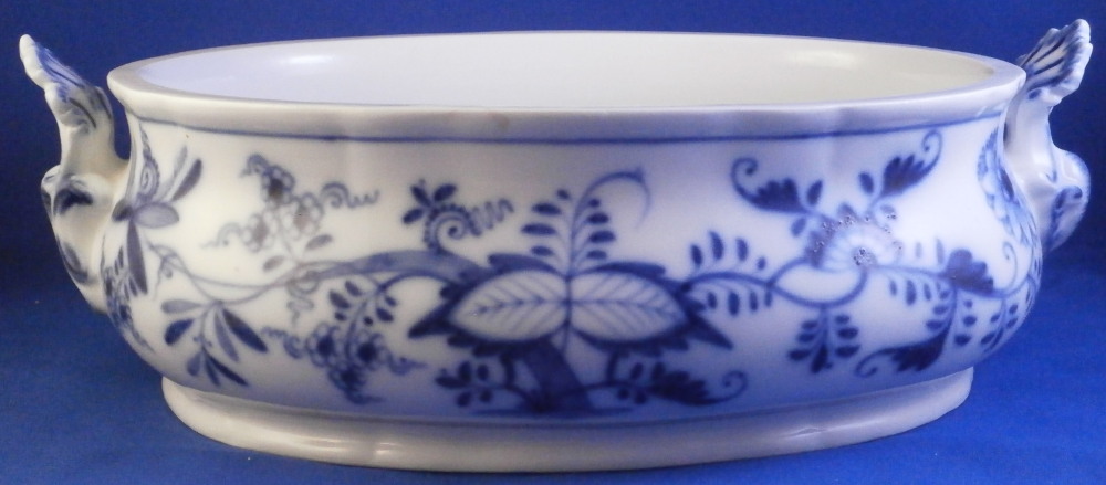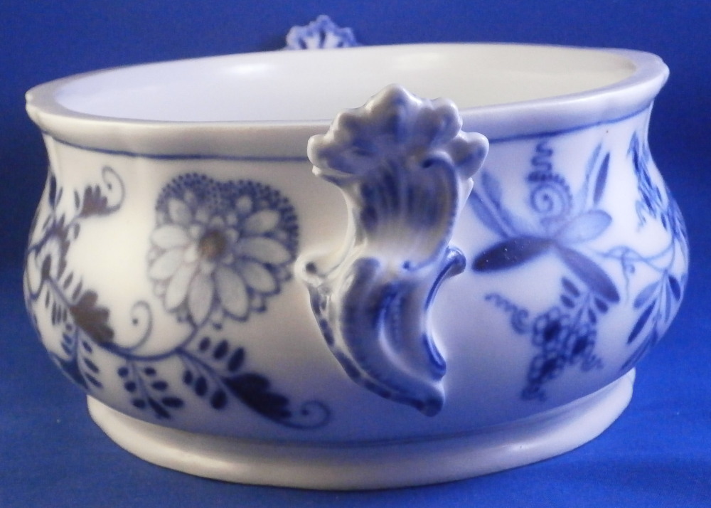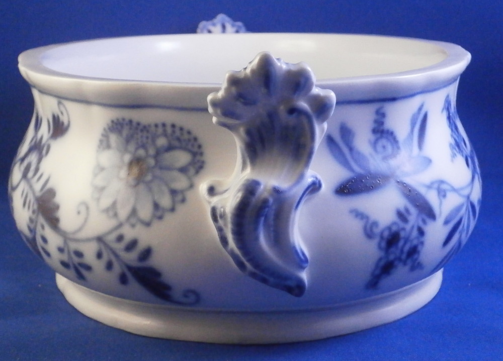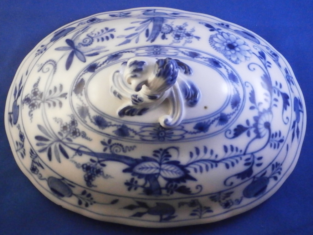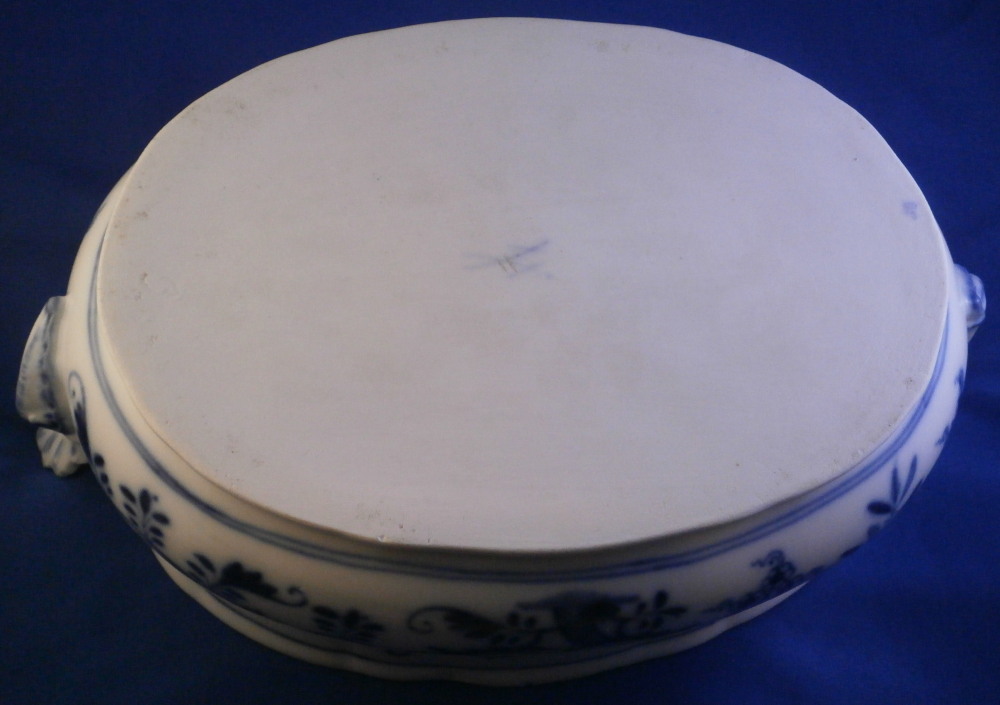 This is a tureen / terrine made by Meissen in the mid to later 19th century before they added the crossed swords to the bottom of the stalk of the "onion". The tureen is marked with the under glaze blue crossed swords with two cuts across it denoting it to be a second choice piece. The piece is of a great size - not gigantic nor tiny so perfect for use for your meals. It is decorated with their famous blue onion design all around with a nice finial to the top of the lid and handles to either side of the bottom piece. The lidded dish is in good condition with a large brown spot from the firing process to the top of the lid as shown, a small chip to the edge of the lid and a small and larger chip to the edge of the bottom piece right next to each other. These were ground down a bit to hide them better and the set displays nicely and is ready for everyday use. The lidded piece including the finial is 7.25 inches tall, 10.5 inches long and 7 inches in wide. Please email me for more information or other pictures.