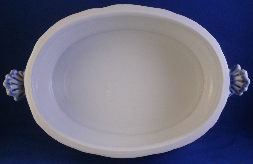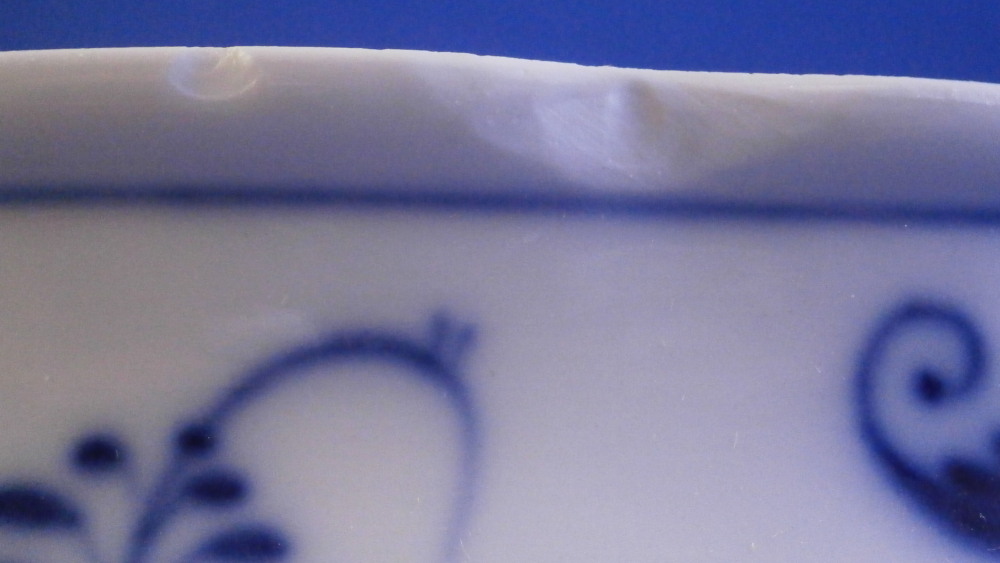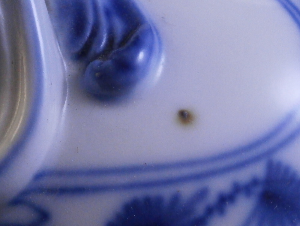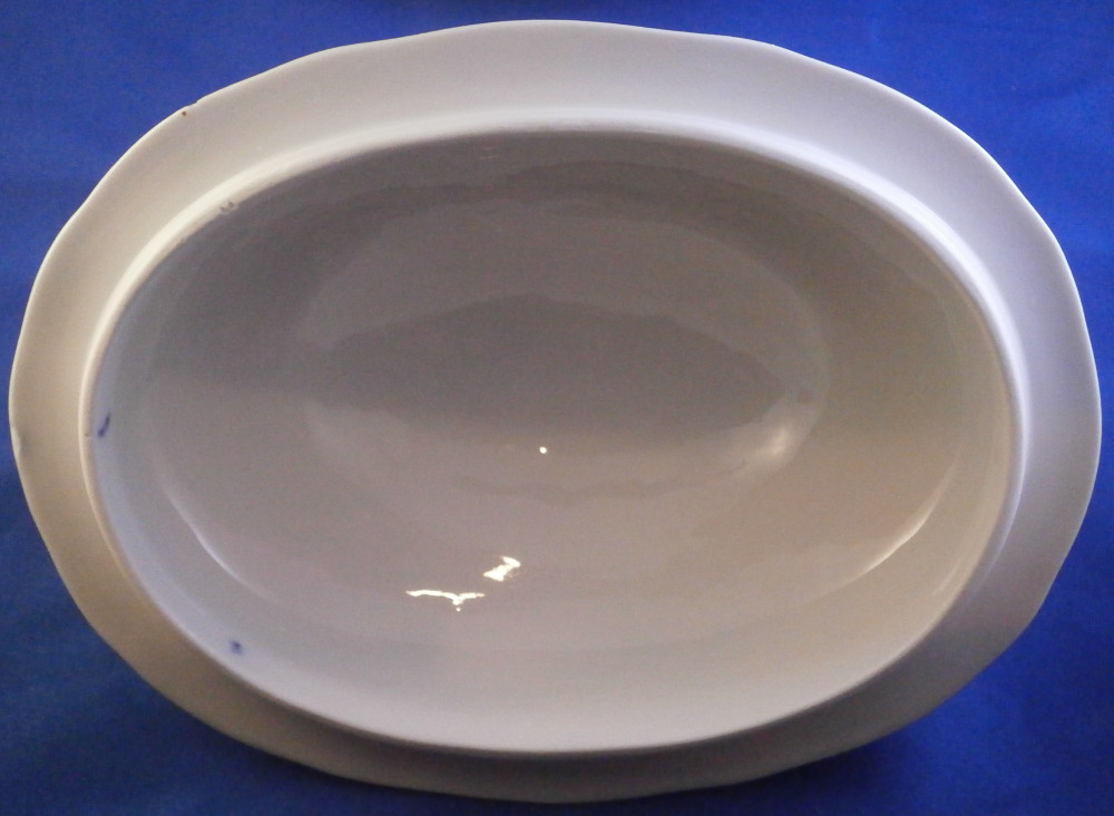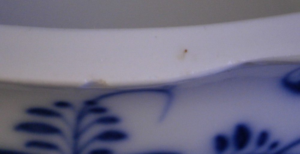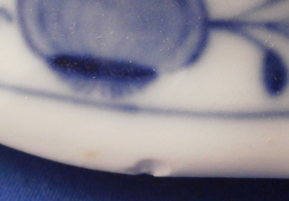 This is a tureen / terrine made by Meissen in the mid to later 19th century before they added the crossed swords to the bottom of the stalk of the "onion". The tureen is marked with the under glaze blue crossed swords with two cuts across it denoting it to be a second choice piece. The piece is of a great size - not gigantic nor tiny so perfect for use for your meals. It is decorated with their famous blue onion design all around with a nice finial to the top of the lid and handles to either side of the bottom piece. The lidded dish is in good condition with a large brown spot from the firing process to the top of the lid as shown, a small chip to the edge of the lid and a small and larger chip to the edge of the bottom piece right next to each other. These were ground down a bit to hide them better and the set displays nicely and is ready for everyday use. The lidded piece including the finial is 7.25 inches tall, 10.5 inches long and 7 inches in wide. Please email me for more information or other pictures.