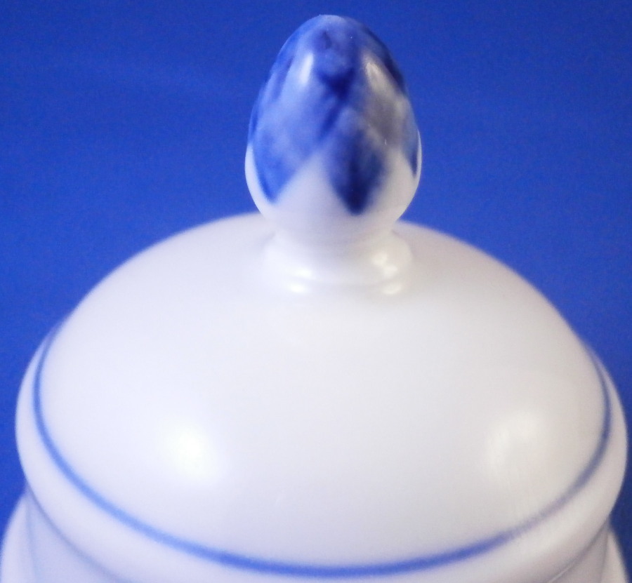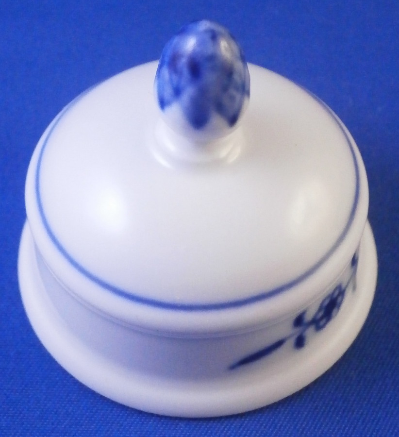 This is a lid for a tea caddy / jar made by Meissen in the 20th century. It is decorated with their famous blue onion ( Zwiebelmuster ) design in under glaze blue and has a typical and nice shape to it. There is a little blue flower design to two sides, a blue ring around the top edge and a bit of blue to the finial. The piece is not marked which is normal for their lids but the quality speaks for itself and tehre is no doubt at all. The piece is 1.5 inches tall and 1.625 inches in diameter. The inner diameter is 1.25 inches and a bit more but that's what it would fit comfortably. The lid is in perfect condition. Please email me for more information or other pictures.