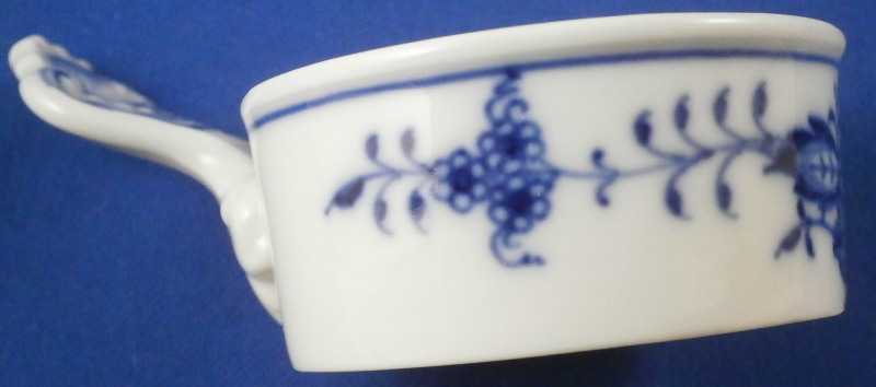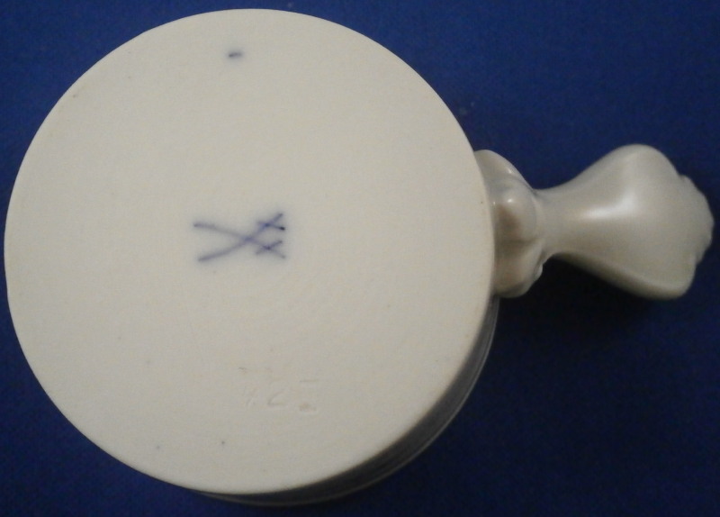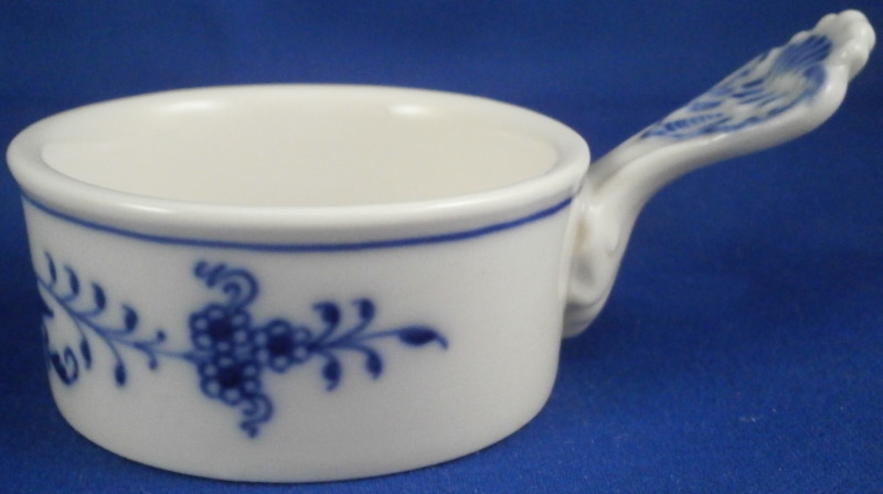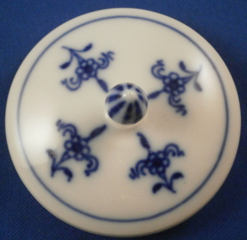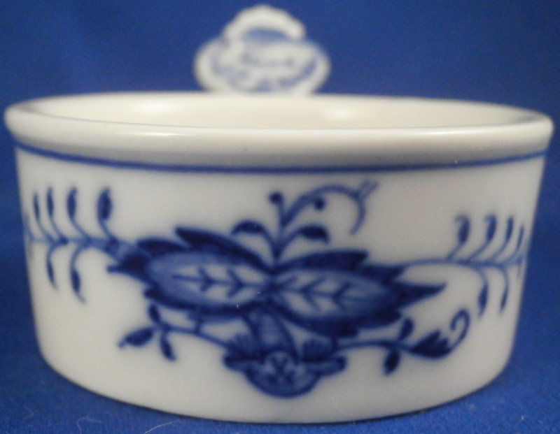 This is a lidded tealight for your teapot warmer or veilleuse made by Meissen in the 20th century. Basically the carrying case for the little candle to keep your teapot warm. It is decorated with their famous and ever popular blue onion design. Simple shape with a nice handle to one side. The main body of the tea light is marked underneath with the under glaze blue crossed swords mark as well as the usual impressed numbers and a blue line to the side. First quality. The dish and lid are in perfect condition. The piece is about 1.75 inches tall with a diameter of 2.125 inches. The handle sticks out about 1.25 inches to one side. Please email me for more information or other pictures.