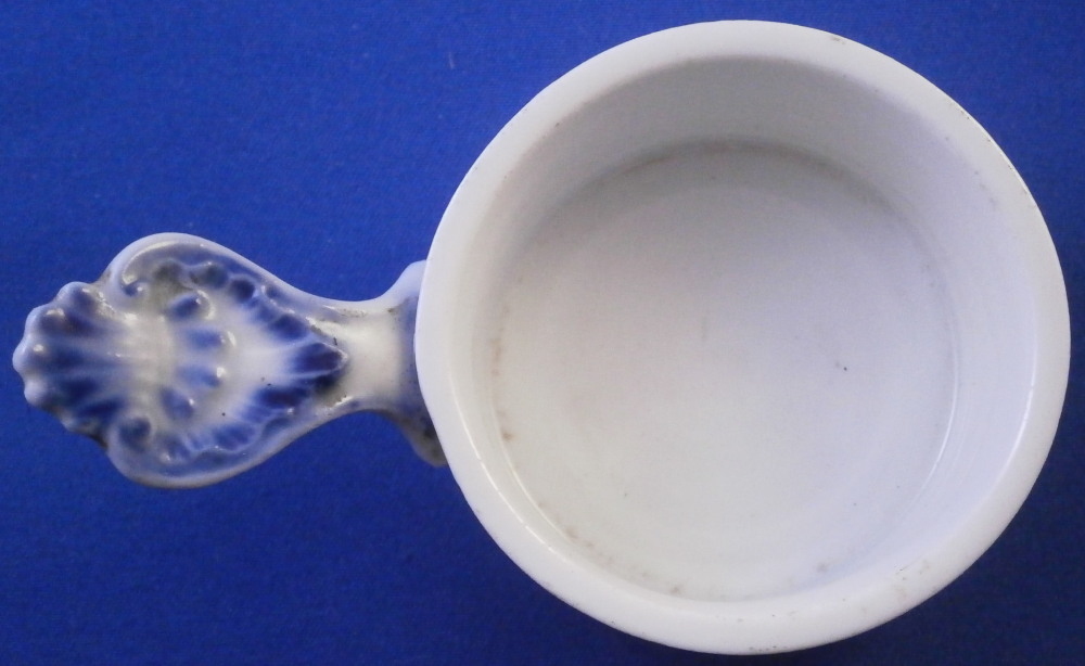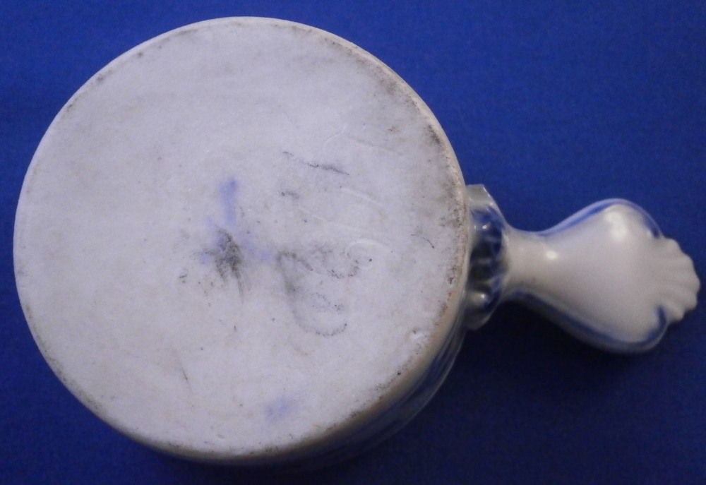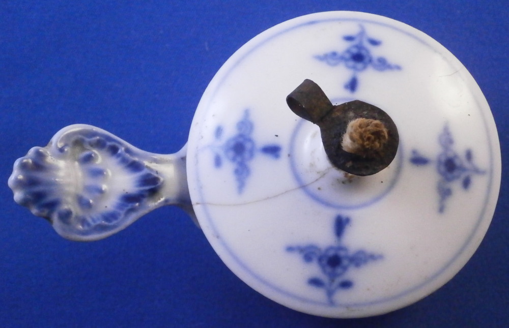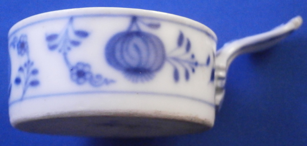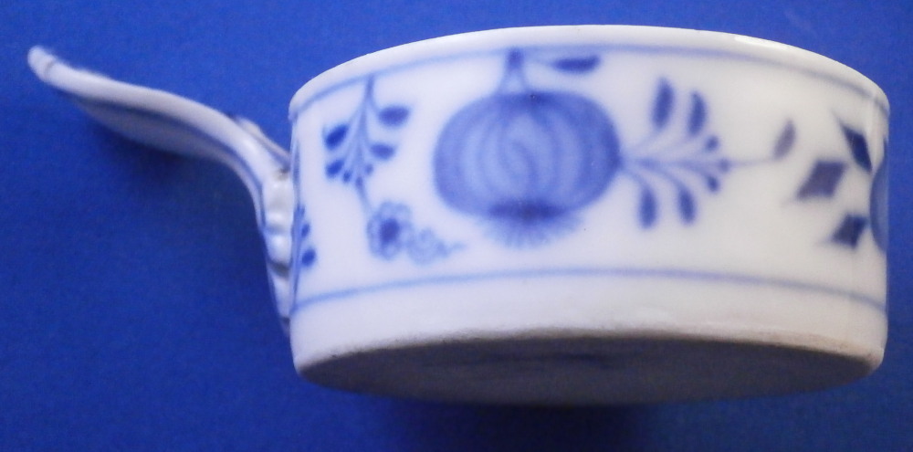 This is a fun piece of porcelain made by Meissen in the early to mid 19th century. It is a lidded tea light holder for your teapot warmer or veilleuse - basically the equivalent of a modern tealight candle. It comes with the hold in the center of the lid and even still has its original burner and wick which is extra neat. The porcelain is decorated with one of their under glaze blue onion design all around the outside of the main body, blue trim to the handle which has a bit of a relief design to it and blue flowers and trim to the lid. The main body of the tealight is marked underneath with the blue crossed swords mark as well as the usual impressed / incised numbers as shown. First quality. The mark is a bit faint since it is unglazed but that is normal. The dish of the tea light holder are in perfect condition but the lid has a hairline crack going from the central hole to the edge. Still a really nice and early example! The piece is about 1.5 inches tall with a diameter of 2.25 inches. The handle sticks out about 1.25 inches to one side. Please email me for more information or other pictures.