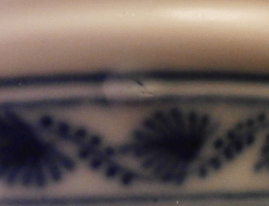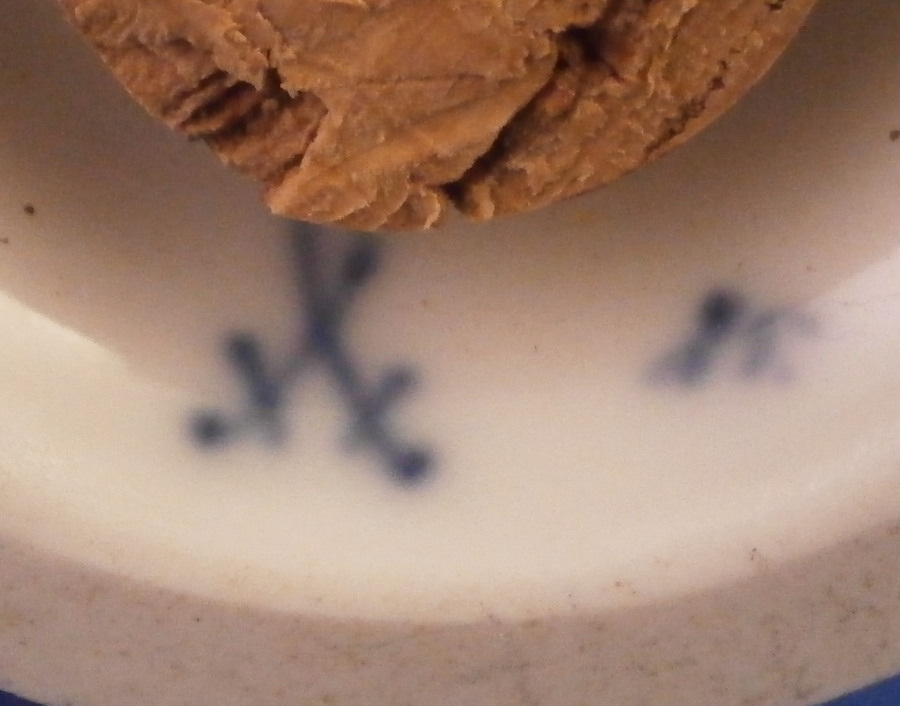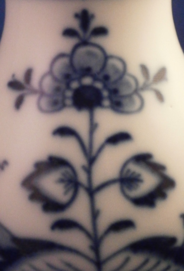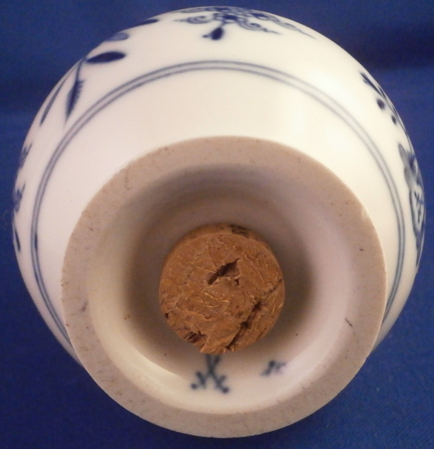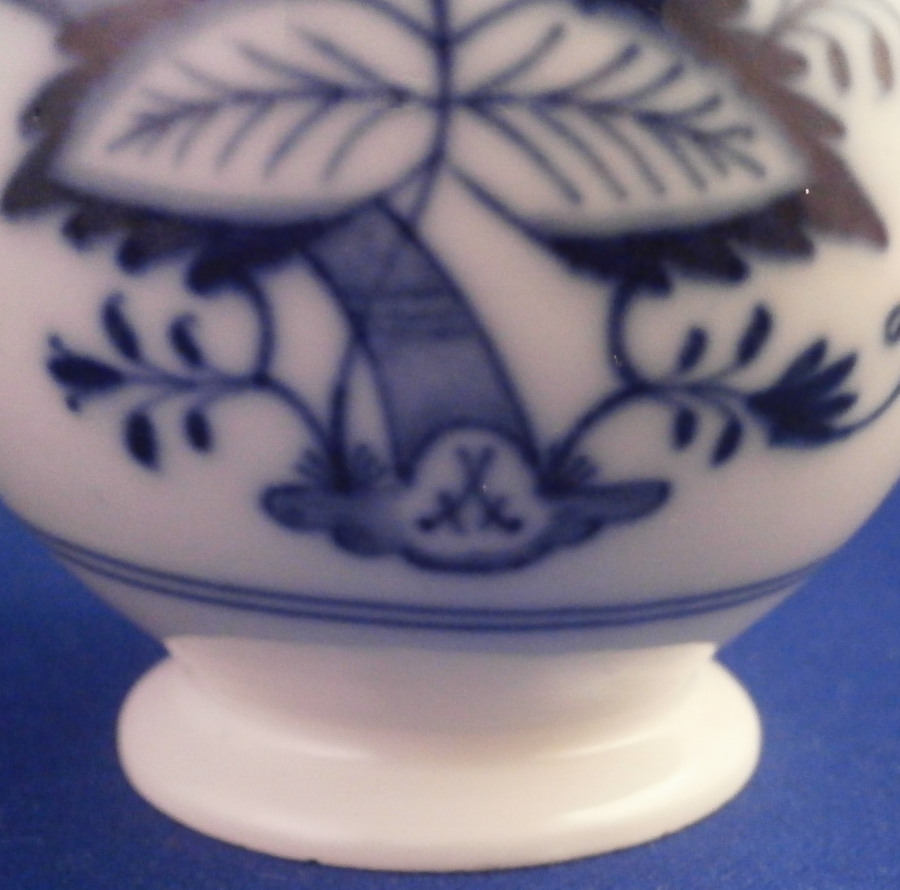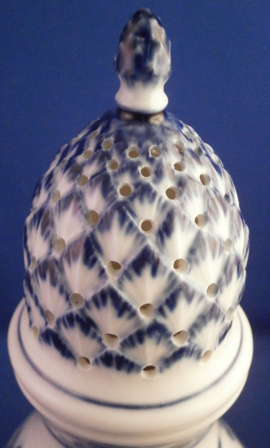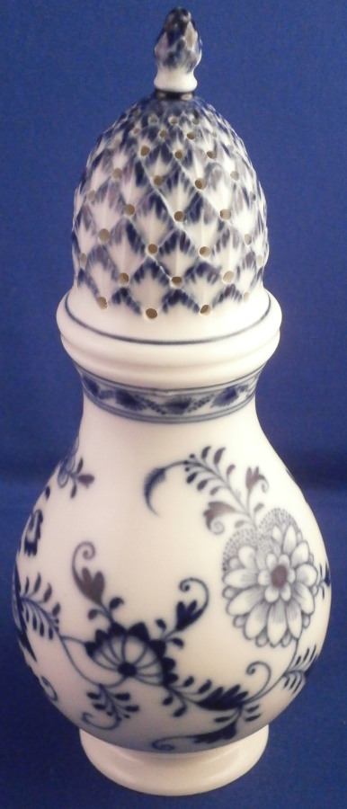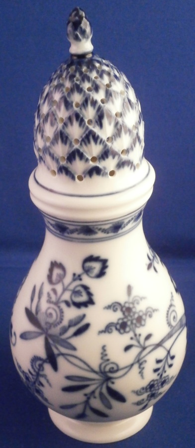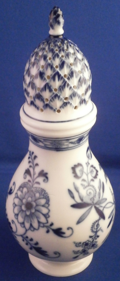 This is a superb sugar shaker / caster / muffineer made by Meissen in the late 19th or early 20th century. It is the larger size and is decorated with their famous blue onion design and has an amazing reticulated and molded top meant to look like an artichoke for the sugar to pour out of and a little finial at the very tip. A really nice looking piece and hard to find as well. This piece does have a very decorative shape. It is in perfect condition. The cork in the bottom is definitely a replacement but that does not matter at all. The pot is marked with the under glaze blue crossed swords underneath as well as a blue painter's mark as shown. First choice though I am not sure who was sleeping at the quality control desk that day. There is a little bump to the paste in the top trim and a tiny firing surface crack as shown. They should have made it second quality with their rigid way of doing things but obviously things happened. Finally proof that even they are not perfect :) The piece is 7.25 inches tall and 3.125 inches in diameter. Please email me for more information or other pictures.
