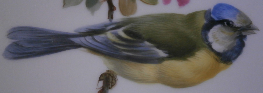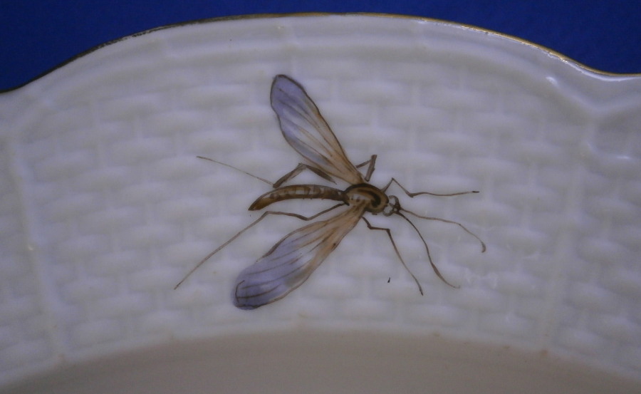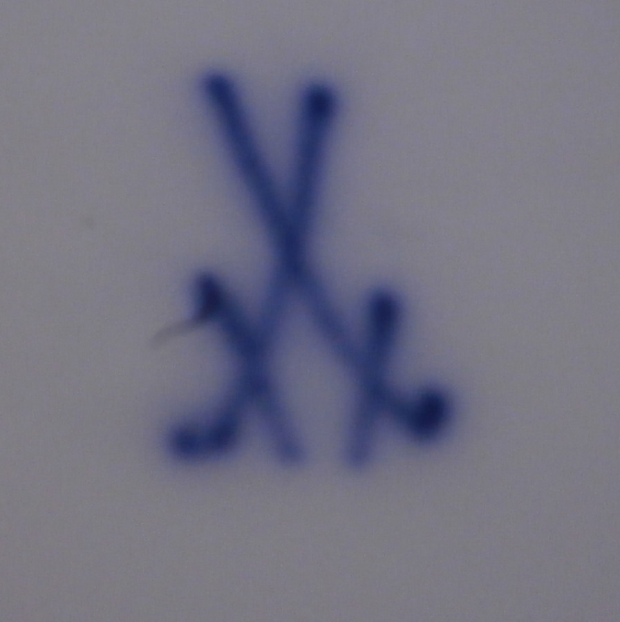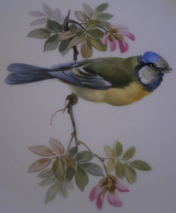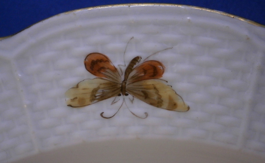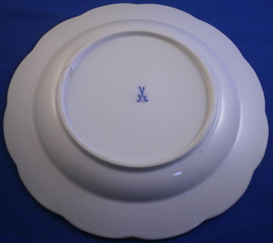 This is a really pretty plate made by Meissen in the late 19th century or early 20th century. It is hand painted with a detailed bird scene in the center including a bluetit type bird sitting on a nice branch with its leaves and pink blossoms. The rim has a nice shape to it and a basket weave design to the paste with gold trim to the edge as well as four bugs hand painted on it. The plate is in greatt condition with an almost chip to the foot ring as shown. It does not affect the piece at all and it displays perfectly! The dish is marked with the under glaze blue crossed swords mark underneath as well as the usual impressed numbers as shown. It is just over 1 inch tall and 8.25 inches in diameter. Please email me for more information or other pictures.