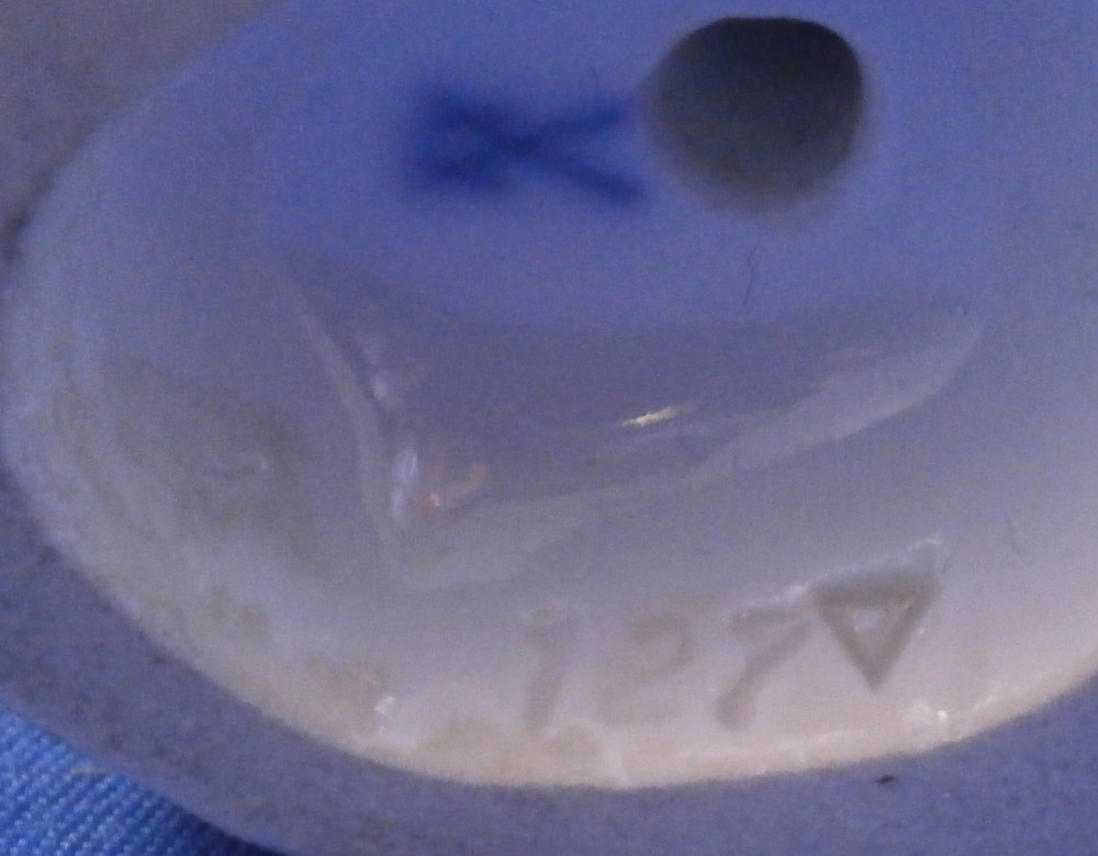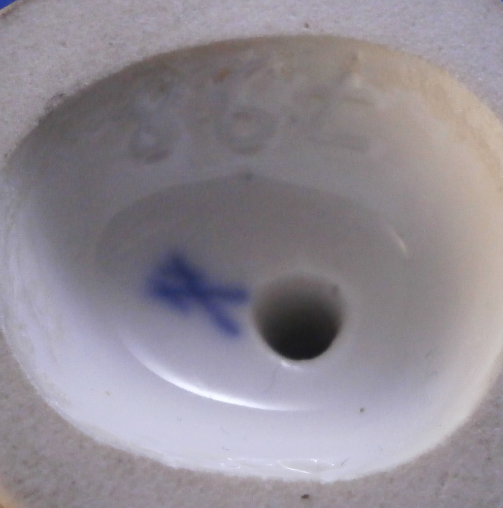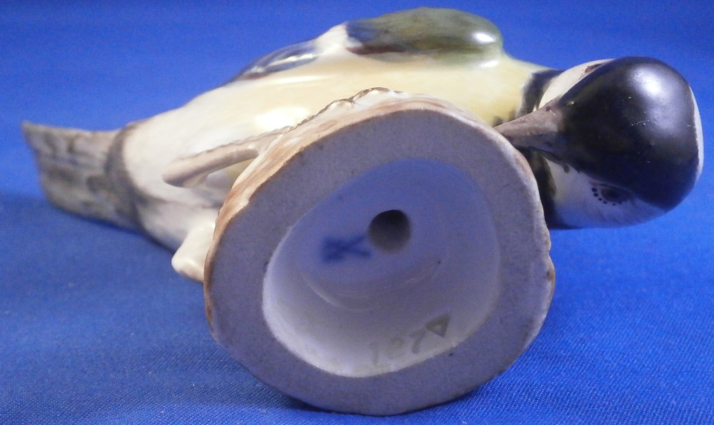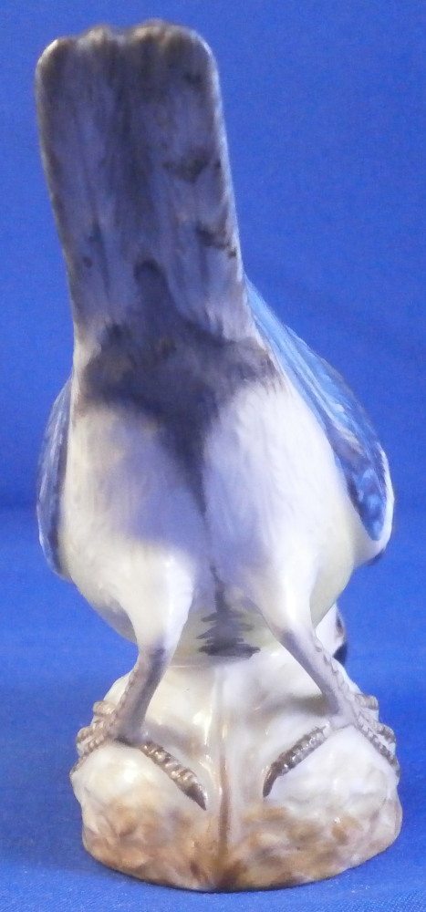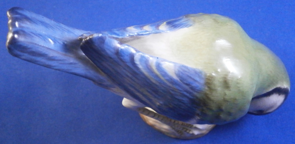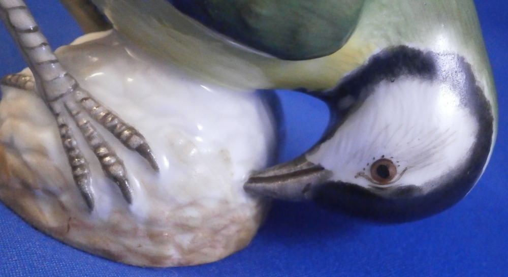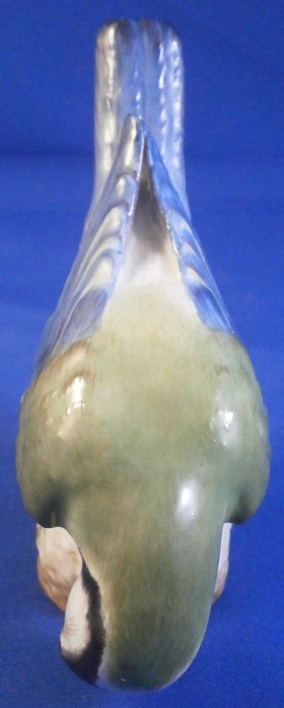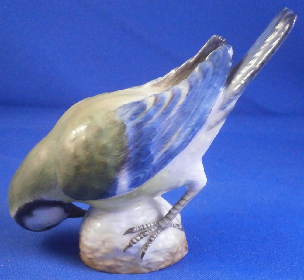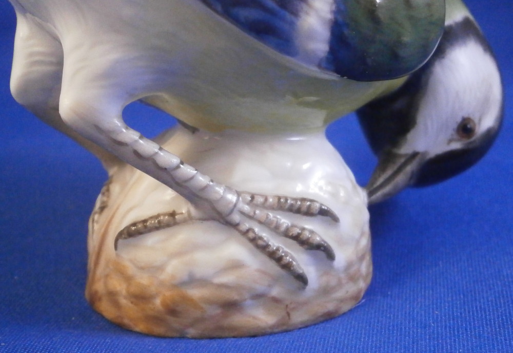 This is a bluetit bird made by Meissen in the first half of the 20th century. It is pecking at a walnut (I think) that it is standing on and is superbly handpainted with lots of detail! Great looking bird!! The figure is in superb condition. The piece is marked with the blue swords underneath as well as the usual impressed numbers and marks as shown. The piece is 3.375 inches tall at the tail, 3.75 inches long and 1.75 inches wide. One of the cuter bird figurines they produced in my opinion. Please email me for more information or other pictures.