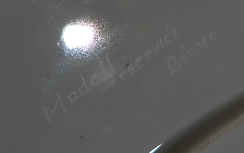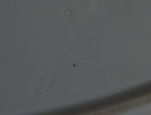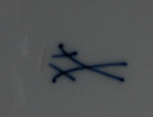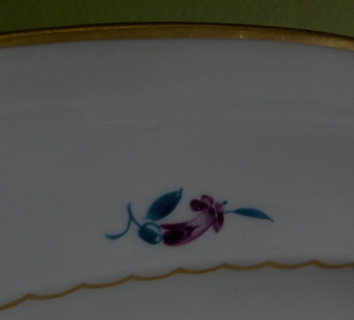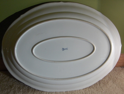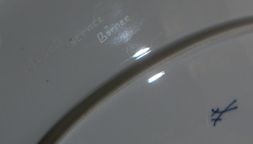 This is a very large platter made by Meissen around 1915. It was designed by Paul Boerner who came to Meissen in about 1910 and left in the mid 1930's. He was one of the most important artists of his time. The serving dish is superbly handpainted with a design that as far as I could find out never went into official production. The neat thing is that it is marked in the back Modell Service Boerner so it was a first production trial by him for this design. I guess it wasn't deemed good enough to sell to the "mass" market and was never taken over for production as it is not mentioned in any books. It is rare to be able to say that a piece was definitively painted by him so here is a rare chance to buy a piece painted by him and obviously a rare design. I actually think it is a very nice one and am a bit surprised they didn't think so. The platter is handpainted with a very modern looking design in puce, black and turquoise with a gold trim. The piece is in perfect condition and very large measuring 2 inches tall, 14.25 inches wide and 19.25 inches long. It is marked underneath with the underglaze blue crossed swords with a line underneath which indicated a second choice piece which might be because it was just a trial piece. Also marked in the glaze with Modell Service Börner (which was scratched off - might have been in gold originally) and some impressed numbers. Please email me for more information or other pictures.